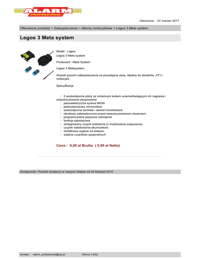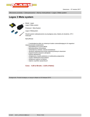 Utworzono : 07 marzec 2017 Oferowane produkty > Zabezpieczenia > Alarmy motocyklowe > Legos 3 Meta system Legos 3 Meta system Model : Lagos Legos 3 Meta system Producent : Meta System Legos 3 Metasystem Wysoki poziom zabezpieczenia za przystępną cenę. Idealny do skuterów, ATV i motocykli. Specyfikacja: � 2 wodoodporne piloty ze zmiennym kodem uniemożliwiającym ich nagranie i nieautoryzowane skopiowanie � piezoelektryczna syrena M03A � jednoobwodowy immomilizer � wodoodporna centrala i obwód immobilizera � obudowa zabezpieczona przed nieautoryzowanym otwarciem � programowalne pasywne uzbrojenie � funkcja sabotażowa � zintegrowany czujnik położenia (z możliwością wyłączenia) � czujnik naładowania akumulatora � dodatkowe wyjście na klakson � wejście czujników opcjonalnych Cena : 0,00 zł Brutto ( 0,00 zł Netto) Dostępność: Produkt dostępny w naszym sklepie od 24 listopad 2010 kontakt : - [email protected] Strona 1/{nb}