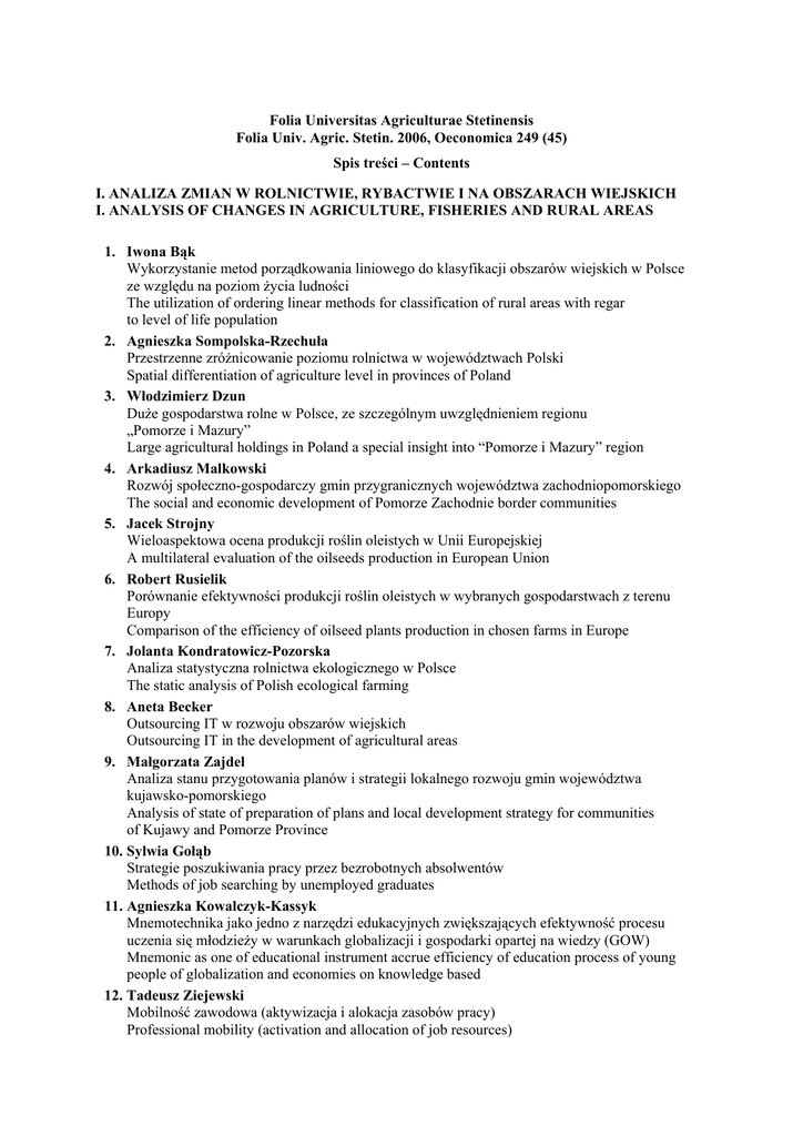 Folia Universitas Agriculturae Stetinensis Folia Univ. Agric. Stetin. 2006, Oeconomica 249 (45) Spis treści – Contents I. ANALIZA ZMIAN W ROLNICTWIE, RYBACTWIE I NA OBSZARACH WIEJSKICH I. ANALYSIS OF CHANGES IN AGRICULTURE, FISHERIES AND RURAL AREAS 1. Iwona Bąk Wykorzystanie metod porządkowania liniowego do klasyfikacji obszarów wiejskich w Polsce ze względu na poziom życia ludności The utilization of ordering linear methods for classification of rural areas with regar to level of life population 2. Agnieszka Sompolska-Rzechuła Przestrzenne zróżnicowanie poziomu rolnictwa w województwach Polski Spatial differentiation of agriculture level in provinces of Poland 3. Włodzimierz Dzun Duże gospodarstwa rolne w Polsce, ze szczególnym uwzględnieniem regionu „Pomorze i Mazury” Large agricultural holdings in Poland a special insight into “Pomorze i Mazury” region 4. Arkadiusz Malkowski Rozwój społeczno-gospodarczy gmin przygranicznych województwa zachodniopomorskiego The social and economic development of Pomorze Zachodnie border communities 5. Jacek Strojny Wieloaspektowa ocena produkcji roślin oleistych w Unii Europejskiej A multilateral evaluation of the oilseeds production in European Union 6. Robert Rusielik Porównanie efektywności produkcji roślin oleistych w wybranych gospodarstwach z terenu Europy Comparison of the efficiency of oilseed plants production in chosen farms in Europe 7. Jolanta Kondratowicz-Pozorska Analiza statystyczna rolnictwa ekologicznego w Polsce The static analysis of Polish ecological farming 8. Aneta Becker Outsourcing IT w rozwoju obszarów wiejskich Outsourcing IT in the development of agricultural areas 9. Małgorzata Zajdel Analiza stanu przygotowania planów i strategii lokalnego rozwoju gmin województwa kujawsko-pomorskiego Analysis of state of preparation of plans and local development strategy for communities of Kujawy and Pomorze Province 10. Sylwia Gołąb Strategie poszukiwania pracy przez bezrobotnych absolwentów Methods of job searching by unemployed graduates 11. Agnieszka Kowalczyk-Kassyk Mnemotechnika jako jedno z narzędzi edukacyjnych zwiększających efektywność procesu uczenia się młodzieży w warunkach globalizacji i gospodarki opartej na wiedzy (GOW) Mnemonic as one of educational instrument accrue efficiency of education process of young people of globalization and economies on knowledge based 12. Tadeusz Ziejewski Mobilność zawodowa (aktywizacja i alokacja zasobów pracy) Professional mobility (activation and allocation of job resources) II. ANALIZA ZMIAN W SEKTORZE USŁUG DLA ROLNICTWA, RYBACTWA I NA OBSZARACH WIEJSKICH II. ANALYSIS OF CHANGES IN SECTORS SERVICING AGRICULTURE, FISHERIES AND RURAL AREAS 13. Tadeusz Szczygieł, Elżbieta Kicka Programy rolnośrodowiskowe w nowym systemie strategicznego programowania na lata 2007–2013 Agro-environmental programmes in a new strategic system of programming for years 2007–2013 14. Emil Svoboda, Libor Bittner Methods of strategic decision-making in the management of entrepreneurial subjects Metody zarządzania strategicznego w podejmowaniu decyzji przez przedsiębiorstwa 15. Alicja Markiewicz Prognozowanie na podstawie hierarchicznych modeli przyczynowo-opisowych oraz modeli neuronowo-regresyjnych zmiennej z wahaniami sezonowymi Forecasting of variable with seasonal fluctuationas with hierarchical cause-effect models and neural-regressive models 16. Joanna Miklewska Zastosowanie sterowania optymalnego w zarządzaniu obszarem chronionym Application of the optimal control method to management of the protected area 17. Krystyna Brzozowska, Agata Wróbel Zmiany w polskim systemie bankowym na tle rozwoju rynku finansowego Changes in Polish Banking System against financial market development 18. Krystyna Brzozowska Preferencyjne kredyty inwestycyjne w województwie zachodniopomorskim w latach 2001–2004 Preferential investment loans zachodniopomorskie voivodship in 2002–2004 19. Karol Kukuła Statystyczna analiza porównawcza bazy agroturystycznej województwa małopolskiego w ujęciu przestrzennym Statistical comparative analysis of agritouristic base in Małopolskie voivodship in spatial grasp 20. Aleksander Grzelak Korzystanie z usług zewnętrznych przez gospodarstwa rolne w świetle wyników badań ankietowych The using of external services by farms in light of results of questionnaire researches 21. Algimantas Kurlavicius, Česlovas Christauskas Web-based information management in virtual agricultural community Zarządzanie informacjami w wirtualnej spółce rolniczej, przy wykorzystaniu sieci komputerowej 22. Mateusz Goc Analiza rozkładu czasu usuwania usterek sieci telefonicznej według przyczyn Distribution analysis of the duration of reppearing the telecommunication network by the cause 23. Katarzyna Cheba Zastosowanie metody wskaźników sezonowości w prognozowaniu na podstawie danych miesięcznych The application of the index seasons method in forecasting monthly data 24. Joanna Perzyńska-Wydrych Uogólnione metody budowy prognoz złożonych General methods of building of combined forecasts 25. Monika Mejszelis Obrót nieruchomościami rolnymi na przykładzie powiatu pyrzyckiego Turnover of farmlands in Pyrzyce district as an example 26. Wojciech Zbaraszewski Możliwości wykorzystania kontraktów terminowych w zarządzaniu ryzykiem cenowym produkcji rolnej w Unii Europejskiej The possibility the utilization of futures contracts in management the price risk of production in Agricultural European Union 27. Agata Wróbel Rating jako instrument oceny zdolności kredytowej podmiotów gospodarczych Rating as instrument of estimate of credit ability of economic subject 28. Beata Szczecińska Ocena płynności finansowej w przedsiębiorstwie z branży chemicznej Managing of liquidity in chemical company III. ANALIZA ZMIAN W PRZEMYŚLE ROLNO-SPOŻYWCZYM III. ANALYSIS OF CHANGES IN AGRI-FOOD INDUSTRY 29. Franciszek Kapusta Agrobiznes a gospodarka żyw