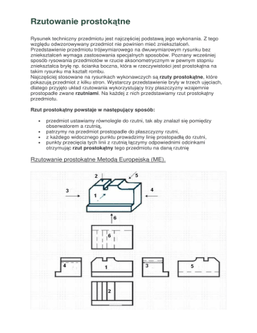 Rzutowanie prostok tne Rysunek techniczny przedmiotu jest najcz ciej podstaw jego wykonania. Z tego wzgl du odwzorowywany przedmiot nie powinien mie zniekształce . Przedstawienie przedmiotu trójwymiarowego na dwuwymiarowym rysunku bez zniekształce wymaga zastosowania specjalnych sposobów. Poznany wcze niej sposób rysowania przedmiotów w rzucie aksonometrycznym w pewnym stopniu zniekształca brył np. cianka boczna, która w rzeczywisto ci jest prostok tna na takim rysunku ma kształt rombu. Najcz ciej stosowane na rysunkach wykonawczych s rzuty prostok tne, które pokazuj przedmiot z kilku stron. Wystarczy przedstawienie bryły w trzech uj ciach, dlatego przyj to układ rzutowania wykorzystuj cy trzy płaszczyzny wzajemnie prostopadłe zwane rzutniami. Na ka dej z nich przedstawiamy rzut prostok tny przedmiotu. Rzut prostok tny powstaje w nast puj cy sposób: • • • • przedmiot ustawiamy równolegle do rzutni, tak aby znalazł si pomi dzy obserwatorem a rzutni , patrzymy na przedmiot prostopadle do płaszczyzny rzutni, z ka dego widocznego punktu prowadzimy lini prostopadł do rzutni, punkty przeci cia tych linii z rzutni ł czymy odpowiednimi odcinkami otrzymuj c rzut prostok tny tego przedmiotu na dan rzutni Rzutowanie prostok tne Metod Europejsk (ME). 1 –rzut główny (widok z przodu, rzut pionowy) 2 –rzut z góry (widok z góry, rzut poziomy) 3 –rzut boczny prawy (widok z lewej strony) 4 –rzut boczny lewy (widok z prawej strony) 5 –rzut z tyłu (widok z tyłu) 6 –rzut z dołu (widok z dołu) Wa ne wskazówki. Rysuj c poszczególne rzuty na arkuszu nale y pami ta , e po ich wzajemnym uło eniu wzgl dem siebie rozpoznajemy, który z rzutów jest rzutem głównym, który bocznym a który z góry. Wobec tego nie jest oboj tne w którym miejscu narysujemy kolejne rzuty. Zapami taj!· Rzut I (z przodu) i rzut II (z góry) maj jednakow długo i le dokładnie jeden nad drugim. Rzut I (z przodu) i rzut III (z boku) le wysoko dokładnie obok siebie i maj jednakow . Rzuty z góry (II) i z boku (III) maj jednakow szeroko . Przykład