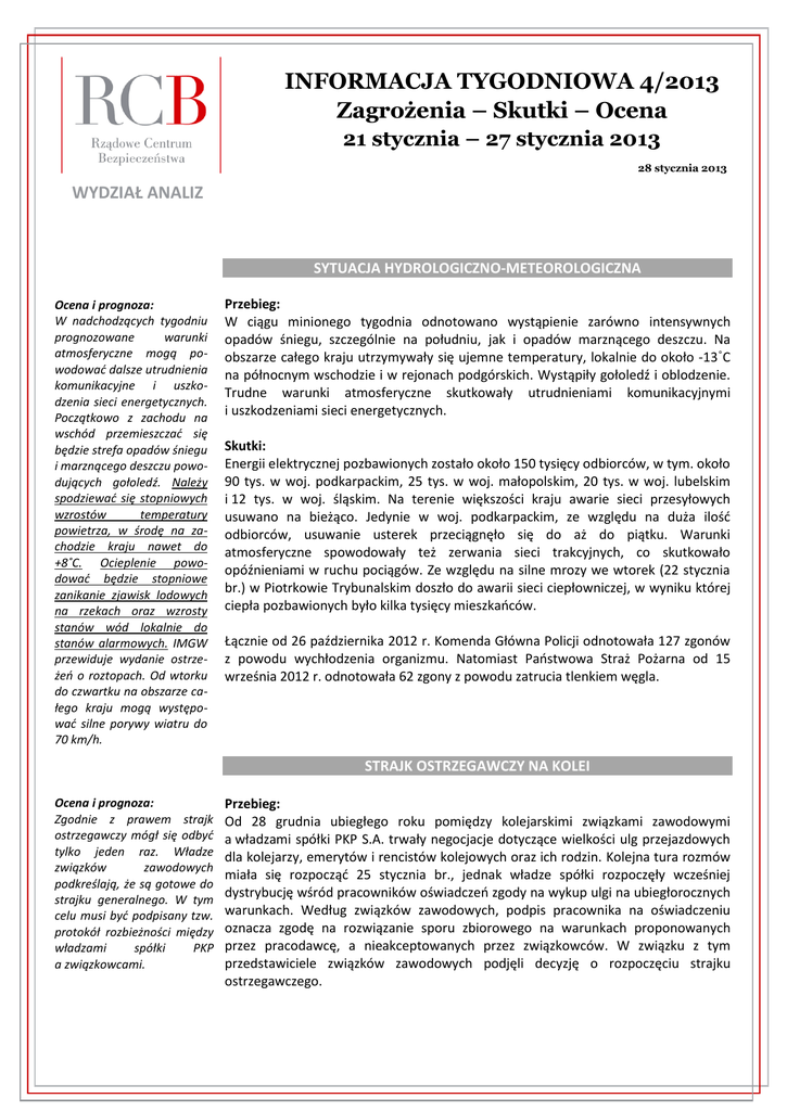 INFORMACJA TYGODNIOWA 4/2013 Zagrożenia – Skutki – Ocena 21 stycznia – 27 stycznia 2013 28 stycznia 2013 WYDZIAŁ ANALIZ SYTUACJA HYDROLOGICZNO-METEOROLOGICZNA Ocena i prognoza: W nadchodzących tygodniu prognozowane warunki atmosferyczne mogą powodowad dalsze utrudnienia komunikacyjne i uszkodzenia sieci energetycznych. Początkowo z zachodu na wschód przemieszczad się będzie strefa opadów śniegu i marznącego deszczu powodujących gołoledź. Należy spodziewad się stopniowych wzrostów temperatury powietrza, w środę na zachodzie kraju nawet do +8˚C. Ocieplenie powodowad będzie stopniowe zanikanie zjawisk lodowych na rzekach oraz wzrosty stanów wód lokalnie do stanów alarmowych. IMGW przewiduje wydanie ostrzeżeo o roztopach. Od wtorku do czwartku na obszarze całego kraju mogą występowad silne porywy wiatru do 70 km/h. Przebieg: W ciągu minionego tygodnia odnotowano wystąpienie zarówno intensywnych opadów śniegu, szczególnie na południu, jak i opadów marznącego deszczu. Na obszarze całego kraju utrzymywały się ujemne temperatury, lokalnie do około -13˚C na północnym wschodzie i w rejonach podgórskich. Wystąpiły gołoledź i oblodzenie. Trudne warunki atmosferyczne skutkowały utrudnieniami komunikacyjnymi i uszkodzeniami sieci energetycznych. Skutki: Energii elektrycznej pozbawionych zostało około 150 tysięcy odbiorców, w tym. około 90 tys. w woj. podkarpackim, 25 tys. w woj. małopolskim, 20 tys. w woj. lubelskim i 12 tys. w woj. śląskim. Na terenie większości kraju awarie sieci przesyłowych usuwano na bieżąco. Jedynie w woj. podkarpackim, ze względu na duża ilośd odbiorców, usuwanie usterek przeciągnęło się do aż do piątku. Warunki atmosferyczne spowodowały też zerwania sieci trakcyjnych, co skutkowało opóźnieniami w ruchu pociągów. Ze względu na silne mrozy we wtorek (22 stycznia br.) w Piotrkowie Trybunalskim doszło do awarii sieci ciepłowniczej, w wyniku której ciepła pozbawionych było kilka tysięcy mieszkaoców. Łącznie od 26 października 2012 r. Komenda Główna Policji odnotowała 127 zgonów z powodu wychłodzenia organizmu. Natomiast Paostwowa Straż Pożarna od 15 września 2012 r. odnotowała 62 zgony z powodu zatrucia tlenkiem węgla. STRAJK OSTRZEGAWCZY NA KOLEI Ocena i prognoza: Zgodnie z prawem strajk ostrzegawczy mógł się odbyd tylko jeden raz. Władze związków zawodowych podkreślają, że są gotowe do strajku generalnego. W tym celu musi byd podpisany tzw. protokół rozbieżności między władzami spółki PKP a związkowcami. Przebieg: Od 28 grudnia ubiegłego roku pomiędzy kolejarskimi związkami zawodowymi a władzami spółki PKP S.A. trwały negocjacje dotyczące wielkości ulg przejazdowych dla kolejarzy, emerytów i rencistów kolejowych oraz ich rodzin. Kolejna tura rozmów miała się rozpocząd 25 stycznia br., jednak władze spółki rozpoczęły wcześniej dystrybucję wśród pracowników oświadczeo zgody na wykup ulgi na ubiegłorocznych warunkach. Według związków zawodowych, podpis pracownika na oświadczeniu oznacza zgodę na rozwiązanie sporu zbiorowego na warunkach proponowanych przez pracodawcę, a nieakceptowanych przez związkowców. W związku z tym przedstawiciele związków zawodowych podjęli decyzję o rozpoczęciu strajku ostrzegawczego. INFORMACJA TYGODNIOWA 21.1 – 27.1. 2013 Skutki: Strajk odbył się w piątek (25 stycznia br.) w godz. 7.00 – 9.00 i objął swoim zasięgiem obszar całego kraju. Na stacjach zatrzymano 388 połączeo pasażerskich z 995 zaplanowanych do realizacji w tym czasie. Odwołano także 214 pociągów towarowych. Ze względu na fakt, że w proteście udział wzięła spółka odpowiedzialna za zarządzanie ruchem kolejowym (PKP PLK), podczas protestu zatrzymane zostały także składy przewoźników, którzy nie brali udziału w strajku. Najwięcej zatrzymanych pociągów odnotowały spółki Przewozy Regionalne (179) i Intercity (109). Na stacjach w Lublinie, Katowicach, Koluszkach i Łodzi odbyły się pikiety związkowców. Spółka PKP przygotowała dla podróżnych system informacyjny składający się ze strony internetowej oraz mobilnych przedstawicieli na 19 dworcach. Pasażerom wydano blisko 1,5 tysiąca ciepłych napojów. Opóźnienia pociągów wynikające ze strajku wynosiły od 15 minut do 3 godzin. PROTEST ROLNIKÓW W ZACHODNIOPOMORSKIM – MOŻLIWE ZAOSTRZENIE Ocena i prognoza: Na wtorek (29 stycznia br.) zaplanowano w Szczecinie spotkanie protestujących z wiceminister rolnictwa Zofią Szalczyk. Kontrola Ministerstwa w lokalnym oddziale ANR ma byd kontynuowana. Do tego czasu możliwe są utrudnienia komunikacyjne na terenie województwa. Przebieg: Protest rolników w woj. zachodniopomorskim trwa od 5 grudnia ub. roku i pomimo podpisanego porozumienia z Ministrem Rolnictwa i Rozwoju Wsi nie doszło do jego zakooczenia. Rolnicy sprzeciwiają się nieprawidłowościom przy sprzedaży ziemi przez lokalny oddział Agencji Nieruchomości Rolnych. Zdaniem protestujących, Agencja sprzedaje ziemie do podstawionych osób powiązanych z dużymi podmiotami gospodarczymi z którymi nie są w stanie konkurowad. Obecny wzrost niezadowolenia wynika z braku zewnętrznej kontroli w lokalnym oddziale ANR i nieusunięcia ze struktur organizacyjnych poprzedniego dyrektora i jego zastępców. Skutki: W czwartek (24 stycznia br.) około sto ciągników przejechało ulicami Szczecina, co spowodowało utrudnienia w komunikacji drogowej. Do protestujących w Szczecinie dojechali rolnicy ze Stargardu Szczecioskiego, Myśliborza i Pyrzyc. W przypadku niespełnienia obietnic, rolnicy są zdecydowani zaostrzyd protest. ZANIECZYSZCZONE MLEKO W PROSZKU - KONTYNUACJA Ocena i prognoza: Według ekspertów ilośd granulatu znaleziona w mleku nie mogła zagrażad życiu ani zdrowiu ludzi. GIS informuje, że od dnia powstania problemu nie otrzymał żadnych informacji o stwierdzonych zatruciach pokarmowych, jak również stwierdzonych 