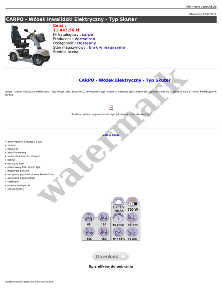 Informacje o produkcie Utworzono 07-03-2017 CARPO - Wózek Inwalidzki Elektryczny - Typ Skuter Cena : 11.443,96 zł Nr katalogowy : carpo Producent : Vermeiren Dostępność : Dostępny Stan magazynowy : brak w magazynie Średnia ocena : er m ar k CARPO - Wózek Elektryczny - Typ Skuter Carpo - wózek inwalidzki elektryczny - Typ skuter. Moc, stabilność, nowoczesny styl i komfort, nadzwyczajna mobilność, wytrzymałość no i szybkość max.17 km/h. Perfekcyjny w terenie Bardzo czytelny i ergonomicznie zaprojektowany panel sterowniczy. Zalety Carpo amortyzatory z przodu i z tyłu ● światła ● zagłówek ● aluminiowe felgi ● siedzenie i oparcie -komfort ● koszyk ● obracany fotel ● przesuwany fotel (przód tył) ● mozliwość pchania ● nachylana płynnie kolumna kierownicza ● odchylane podłokietniki ● rozkłdany ● łatwy w transporcie ● ergonomiczny w at ● Spis plików do pobrania Wygenerowano w programie www.oscGold.com 2. Katalog produktu 3. Instrukcja obsługi wózka 4. Instrukcja obsługi ładowarki w at er m ar k Tagi: wózki elektryczne , wózki inwalidzkie elektryczne , inwalidzkie wózki o napędzie elektrycznym , skutery elektryczne , skutery inwalidzkie , vermeiren , carpo