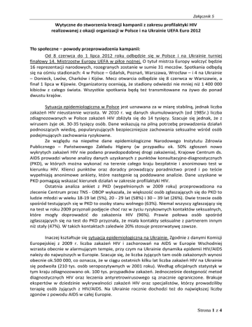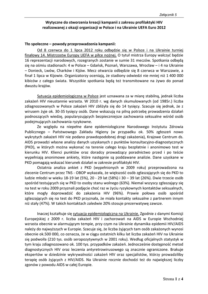 Załącznik 5 Wytyczne do stworzenia kreacji kampanii z zakresu profilaktyki HIV realizowanej z okazji organizacji w Polsce i na Ukrainie UEFA Euro 2012 Tło społeczne – powody przeprowadzenia kampanii: Od 8 czerwca do 1 lipca 2012 roku odbędzie się w Polsce i na Ukrainie turniej finałowy 14. Mistrzostw Europy UEFA w piłce nożnej. O tytuł mistrza Europy walczyć będzie 16 reprezentacji narodowych, rozegranych zostanie w sumie 31 meczów. Spotkania odbędą się na ośmiu stadionach: 4 w Polsce – Gdańsk, Poznań, Warszawa, Wrocław – i 4 na Ukrainie – Donieck, Lwów, Charków i Kijów. Mecz otwarcia odbędzie się 8 czerwca w Warszawie, a finał 1 lipca w Kijowie. Organizatorzy oceniają, że stadiony odwiedzi nie mniej niż 1 400 000 kibiców z całego świata. Wszystkie spotkania będą też transmitowane na żywo do ponad dwustu krajów. Sytuacja epidemiologiczna w Polsce jest uznawana za w miarę stabilną, jednak liczba zakażeń HIV nieustannie wzrasta. W 2010 r. wg danych skumulowanych (od 1985r.) liczba zdiagnozowanych w Polsce zakażeń HIV zbliżyła się do 14 tysięcy. Szacuje się jednak, że z wirusem żyje ok. 30-35 tysięcy osób. Dane wskazują na pilną potrzebę prowadzenia działań podnoszących wiedzę, popularyzujących bezpieczniejsze zachowania seksualne wśród osób podejmujących zachowania ryzykowne. Ze względu na niepełne dane epidemiologiczne Narodowego Instytutu Zdrowia Publicznego – Państwowego Zakładu Higieny (w przypadku ok. 50% zgłoszeń nowo wykrytych zakażeń HIV nie podano prawdopodobnej drogi zakażenia), Krajowe Centrum ds. AIDS prowadzi własne analizy danych uzyskanych z punktów konsultacyjno-diagnostycznych (PKD), w których można wykonać na terenie całego kraju bezpłatnie i anonimowo test w kierunku HIV. Klienci punktów oraz doradcy prowadzący poradnictwo przed i po teście wypełniają anonimowe ankiety, które następnie są poddawane analizie. Dane uzyskane w PKD pomagają wskazać kierunek działań w zakresie profilaktyki HIV. Ostatnia analiza ankiet z PKD (wypełnionych w 2009 roku) przeprowadzona na zlecenie Centrum przez TNS - OBOP wykazała, że większość osób zgłaszających się do PKD to ludzie młodzi w wieku 18-19 lat (5%), 20 - 29 lat (58%) i 30 – 39 lat (26%). Dwie trzecie osób spośród testujących się w PKD to osoby stanu wolnego (63%). Niemal wszyscy zgłaszający się na test w roku 2009 przyznali podjęcie choć raz w życiu ryzykownych kontaktów seksualnych, które mogły doprowadzić do zakażenia HIV (96%). Prawie połowa osób spośród zgłaszających się na test do PKD przyznała, że miała kontakty seksualne z partnerem innym niż stały (47%). W takich kontaktach zaledwie 20% stosuje prezerwatywę zawsze. Inaczej kształtuje się sytuacja epidemiologiczna na Ukrainie. Zgodnie z danymi Komisji Europejskiej z 2009 r. liczba zakażeń HIV i zachorowań na AIDS w Europie Wschodniej wzrasta obecnie w alarmującym tempie, przy czym na Ukrainie dynamika epidemii HIV/AIDS należy do najwyższych w Europie. Szacuje się, że liczba żyjących tam osób zakażonych wynosi obecnie ok.500 000, co oznacza, że w ciągu ostatnich kilku lat liczba zakażeń HIV na Ukrainie się podwoiła (210 tys. osób seropozytywnych w 2001 roku). Według oficjalnych statystyk w tym kraju zdiagnozowano ok. 100 tys. przypadków zakażeń. Jednocześnie dostępność metod diagnostycznych HIV oraz leczenia antyretrowirusowego są znacznie ograniczone. Brakuje ekspertów w dziedzinie wykrywalności zakażeń HIV oraz specjalistów, którzy prowadziliby terapię osób żyjących z HIV/AIDS. Na Ukrainie rocznie dochodzi też do największej liczby zgonów z powodu AIDS w całej Europie. Strona 1 z 4 Załącznik 5 Odbiorcy kampanii: Kampania realizowana w 2012 r. będzie skierowana przede wszystkim do młodych osób dorosłych (18-39 lat i starszych) podejmujących ryzykowne zachowania seksualne. Kampania jest kierowana nie tylko do kibiców. Należy pamiętać o uniwersalnym charakterze tak dużych imprez – wzbudzają zainteresowanie ogółu społeczeństwa, mają wpływ na życie codzienne wszystkich uczestników życia społecznego. Odbiorcami kampanii będą też goście przyjeżdżający z innych krajów. Kampania musi mieć charakter wielokulturowy, ponadnarodowy, musi być zrozumiała dla osób władających różnymi językami. Jedna z co najmniej trzech, wymaganych przez Zamawiającego, zaprezentowanych linii kreacyjnych musi być opracowana jako przekaz pozbawiony strony leksykalnej, tj. główna myśl przekazana bez słów. Zawartość merytoryczna kampanii będzie opracowywana w trzech językach: po polsku, ukraińsku i angielsku. Tę wielojęzyczność należy uwzględnić projektując kreację. Krajowe Centrum ds. AIDS dopuszcza możliwość stworzenia przekazu kampanijnego także w innych językach (np. po niemiecku, francusku, hiszpańsku, włosku etc.). Planowany termin kampanii: czerwiec – lipiec 2012 roku Główny przekaz kampanii: Baw się dobrze w czasie UEFA Euro 2012, ale unikaj ryzykownych zachowań (seksualnych). Jeśli uprawiasz seks z partnerem, którego nie znasz (lub z partnerem, o którym nie wiesz, czy jest zakażony), używaj prezerwatywy. Zrób wszystko, by HIV/AIDS nie był także Twoim problemem. Przekaz uzupełniający kampanii: Zrób test na HIV, dowiedz się jaki jest Twój status serologiczny. Namów na test partnera. Kampanii towarzyszyć będzie logotyp „Nie daj szansy AIDS. Zrób test na HIV.”, który pojawia się nieprzerwanie w kampaniach Krajowego Centrum ds. AIDS od 2001 r. Klimat kampanii: − kampania związana tematycznie z mistrzostwami/piłką nożną/sportem, − kampania zwracająca uwagę, − atrakcyjna wizualnie i fonicznie, − nowoczesna, dynamiczna, − ma dawać do myślenia, − przesłanie ma być logiczne, spójne z założeniami organizatora. Ograniczenia przekazu: − kampania nie może straszyć, wzbudzać agresji i/lub nietolerancji, 