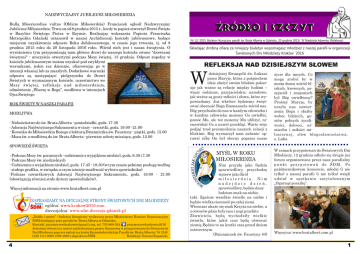 NADZWYCZAJNY JUBILEUSZ MIŁOSIERDZIA OGŁOSZENIA DUSZPASTERSKIE Bullą Misericordiae vultus (Oblicze Miłosierdzia) Franciszek ogłosił Nadzwyczajny Jubileusz Miłosierdzia. Trwa on od 8 grudnia 2015 r., kiedy to papież otworzył Drzwi Święte w Bazylice Świętego Piotra w Rzymie. Realizując wskazania Papieża Franciszka Metropolita Gdański ustanowił w naszej Archidiecezji kościoły jubileuszowe, będące miejscem uzyskiwania odpustu Roku Jubileuszowego, w czasie jego trwania, tj. od 8 grudnia 2015 roku do 20 listopada 2016 roku. Wśród nich jest i nasza świątynia. O wyróżnieniu tym przypominają nam główne drzwi do naszego kościoła zwane "drzwiami świętymi" - uroczyście otwartymi podczas Mszy świętej, 13 grudnia. Odpust zupełny w kościele jubileuszowym można uzyskać pod zwykłymi warunkami, jeden raz dziennie, ofiarowując go w intencji własnej lub za zmarłych. Dodatkowe warunki odpustu są następujące: pielgrzymka do Drzwi Świętych w wyznaczonym kościele, uczestnictwo we Mszy świętej, refleksja nad miłosierdziem, odmówienie „Wierzę w Boga”, modlitwa w intencjach Ojca Świętego ROK ŚWIĘTY W NASZEJ PARAFII MODLITWA - Nabożeństwo do św. Brata Alberta - poniedziałki, godz. 17.30 - Adoracja Najświętszego Sakramentu w ciszy - czwartki, godz. 19.00 - 21.00 Cozznaczy „chrzcić wśw. ogniu"? - Koronka do Miłosierdzia Bożego lekturą Dzienniczka Faustyny - piątki, godz. 15.00 - Msza św. z modlitwą do św. Brata Alberta - pierwsze soboty miesiąca, godz. 12.00 Źródło i szczyt Nr 12/ 2015. Biuletyn liturgiczny parafii św. Brata Alberta w Gdańsku. 20 grudnia 2015/ IV Niedziela Adwentu (fioletowy) Składając drobną ofiarę za niniejszy biuletyn wspomagasz młodzież z naszej parafii w organizacji Światowych Dni Młodzieży Kraków `2016 REFLEKSJA NAD DZISIEJSZYM SŁOWEM W dzisiejszej Ewangelii św. Łukasz przez Maryję, która z pośpiechem idzie służyć swoim bliskim pokazuje jak ważne są relacje między ludźmi – więzy rodzinne, przyjacielskie, narodowe, jak ważne są gesty miłości i słowa, które wypowiadamy. Już wkrótce będziemy świętować obecność Boga Emmanuela wśród nas. Bóg przychodzi do nas w każdym człowieku i w każdym człowieku możemy Go uwielbić, pomóc Mu, ale też możemy Mu ubliżyć, nienawidzić Go a nawet przekląć. Warto więc podjąć trud przemyślenia naszych relacji z bliskimi. Bóg wyznaczył nam zadanie: sprawić żeby On był obecny poprzez nasze życie dla innych. Co mogę zrobić by w moim domu wśród bliskich, krewnych, przyjaciół i znajomych był Bóg uwielbiony? Prośmy Maryję, by uczyła nas zawierzenia Bogu i służby wobec bliźnich, gestów pełnych życzliwości, dobroci, uśmiechu i miłości miłosiernej, słów błogosławieństwa. s. Lidia SPOWIEDŹ ŚWIĘTA - Podczas Mszy św. porannych - codziennie z wyjątkiem niedziel, godz. 6.30 i 7.30 - Podczas Mszy św. niedzielnych - Codziennie z wyjątkiem niedziel, godz. 17.45 - 18.30 (w tym czasie pełnimy posługę według - stałego grafiku, w związku z czym istnieje możliwość wyboru spowiednika) -Podczas czwartkowych Adoracji Najświętszego Sakramentu, godz. 19.00 - 21.00 (obowiązują również stałe dyżury spowiedników). Więcej informacji na stronie www.bratalbert.com.pl ZAPRASZAMY NA OFICJALNE STRONY ŚWIATOWYCH DNI MŁODZIEŻY: ogólna: www.krakow2016.com diecezjalna: www.sdm.diecezja.gdansk.pl „Źródło i szczyt” - biuletyn liturgiczny wydawany przez Młodzieżowy Komitet Organizacyjny ŚDM działający przy parafii św. Brata Alberta w Gdańsku. Kontakt: [email protected], tel. 733-869-524 przymorzewkrakowie2016 Jesteśmy otwarci na nawet najdrobniejszą pomoc finansową w przygotowaniu do Światowych Dni Młodzieży poprzez wpłaty na konto Rzymskokatolickiej Parafii św. Brata Alberta: 78 1240 1242 1111 0000 1588 4093 z dopiskiem ŚDM. Redakcja: Tomasz Kopański 4 MYŚL W ROKU MIŁOSIERDZIA Nim przyjdę jako Sędzia sprawiedliwy, przychodzę wpierw jako Król miłosierdzia. Nim nadejdzie dzień. sprawiedliwy, będzie dany ludziom znak na niebie taki. Zgaśnie wszelkie światło na niebie i będzie wielka ciemność po całej ziemi. Wtenczas ukaże się znak Krzyża na niebie, a z otworów gdzie były ręce i nogi przebite Zbawiciela, będą wychodziły wielkie światła, które jakiś czas będą oświecać ziemię.Będzie to na krotki czas przed dniem ostatecznym. (Dzienniczek św. Faustyny 83) W ramach przygotowań do Światowych Dni Młodzieży, 12 grudnia odbyło się drugie już forum organizowane przez nasz parafialny punkt przygotowań do ŚDM. Po październikowym koncercie, młodzi (i nie tylko) z naszej parafii (i nie tylko) wzięli udział w spotkaniu zatytułowanym „Ogarnąć porażkę”. Więcej na: www.bratalbert.com.pl 1 Odnów nas, Boże, i daj nam zbawienie. EWANGELIA Łk 1, 39-45 PIERWSZE CZYTANIE Mi 5, 1-4a Wyciągnij rękę nad mężem Twojej prawicy, * nad synem człowieczym, którego umocniłeś w swej służbie. Już więcej nie odwrócimy się od Ciebie, * daj nam nowe życie, a będziemy Cię chwalili. Czytanie z Księgi proroka Micheasza Odnów nas, Boże, i daj nam zbawienie. To mówi Pan: A ty, Betlejem Efrata, najmniejsze jesteś wśród plemion judzkich. Z ciebie wyjdzie Ten, który będzie władał w Izraelu, a pochodzenie Jego od początku, od dni wieczności. Przeto Pan wyda ich aż do czasu, kiedy porodzi, mająca porodzić. Wtedy reszta braci Jego powróci do synów Izraela. I powstanie, i będzie ich pasterzem mocą Pana, przez majestat imienia Pana Boga swego. Będą żyli bezpiecznie, bo Jego władza rozciągnie się aż do krańców ziemi. A On będzie pokojem. Oto Słowo Boże. PSALM RESPONSORYJNY Ps 80 (79), 2ac i3b. 15-16. 18-19 Odnów nas, Boże, i daj nam zbawienie. Usłysz, Pasterzu Izraela, * Ty, który zasiadasz nad cherubinami. Wzbudź swą potęgę * i przyjdź nam z pomocą. Odnów nas, Boże, i daj nam zbawienie. Powróć, Boże Zastępów, *
