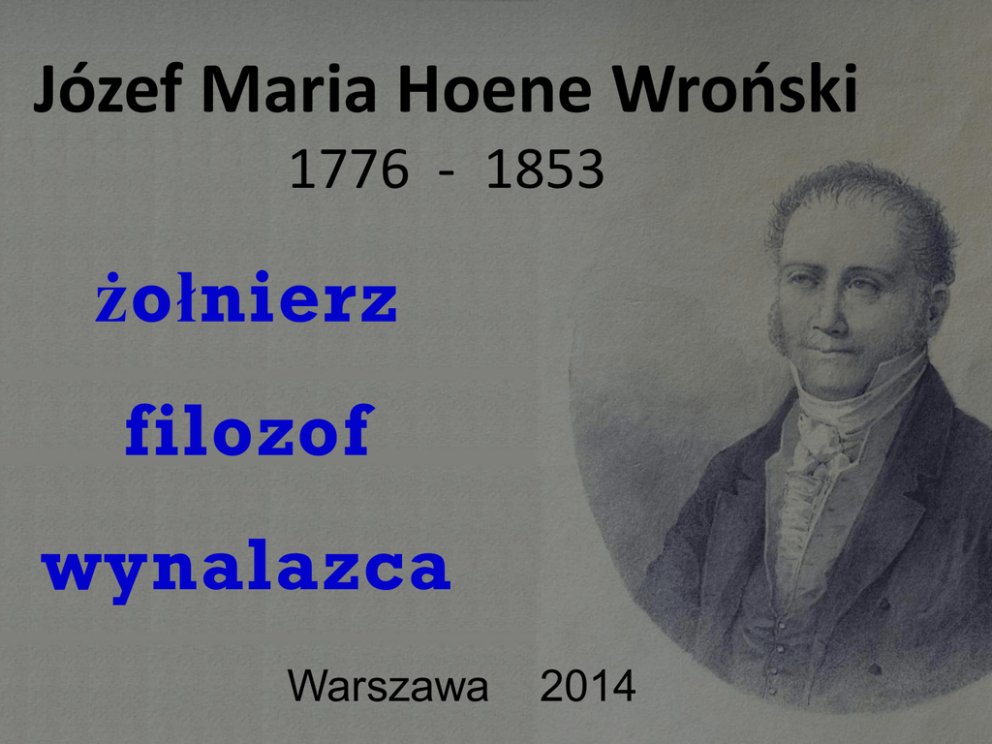 Józef Maria Hoene Wroński 1776 - 1853 żołnierz filozof wynalazca Warszawa 2014 1. Wsypać proch Czynności przy strzale 2. Ubić proch 3. Włożyć przybitkę z armaty XIX w. 4. Ubić przybitkę 5. Włożyć pocisk 6. Podsypać proch do otworu zapałowego 7. Zatoczyć działo, ustawić w odpowiednim kierunku i dobrać na oko właściwy kąt podniesienia 8. Odpalić przytykając wolny lont do otworu zapałowego 9. Mokrym wyciorem wyczyścić przewód lufy 10. Przekłuć otwór zapałowy. „Program przedmiotów i egzaminu dla młodzieży mającej wstępować do pułku szlacheckiego w wieku od 13 do 16 lat, poczynając od roku 1845” rozkład przedmiotów wykładanych w petersburskim korpusie paziów, we wszystkich korpusach kadeckich oraz w pułku szlacheckim W trzecim roku kursu ogólnego program nauczania obejmował: nauki matematyczne: arytmetyka i algebra: • rozbiór równań stopnia pierwszego • nieoznaczone zadania • podnoszenie do potęgi i wyciąganie pierwiastków • równania stopnia drugiego • działania z ilościami pierwiastkowym Marek Rutkowski: Program egzaminów dla do carskiego pułku szlacheckiego 1842 http://szukajacprawdy.salon24.pl/ W bitwie maciejowickiej (10 października 1794 r.) Józef Wroński dowodził artylerią prawego skrzydła i po klęsce został jako oficer wzięty do niewoli również przez oficera, a mianowicie przez adiutanta gen. Tormasowa. Rosjanin dał mu do wyboru albo odbycie wędrówki na Sybir, albo wykreślenie planu warszawskich umocnień od strony Pragi i następnie służbę w armii rosyjskiej z możliwością uzyskania rangi majora. Namiętnie żądny uznania osiemnastoletni chłopak przyjął z radością tę drugą propozycję, nie orientując się ani wtedy, ani później w tym, co dzisiejszy badacz dostrzega bez trudu. Biorąc pod uwagę wiek, stopień i sposób wywiązania się jeńca z postawionego przed nim zadania trudno bowiem wątpić, że był to jedynie test, pozwalający oszacować dobrą wolę, charakter, realne wiadomości i uzdolnienia młodego artylerzysty. Próba wypadła zresztą na tyle pomyślnie, że 12 (25) grudnia 1794 r. „Osip Wrońskoy” został przyjęty do armii rosyjskiej w randze kapitana artylerii (co odpowiadało szarży „pierwszego majora” w innych rodzajach broni), przy czym Aleksander Suworow zatrzymał go w swym sztabie. Sławomir Jastrzębiec-Kozłowski: Józef Maria Hoene Wroński – Sylwetka i doktryna. Wolsztyn 2013 Po przełamaniu oporu obrońców (4 listopada 1794 r.), Rosjanie dokonali masakry ludności cywilnej Pragi. W wyniku kilkugodzinnej fali mordów życie straciło około 20 tysięcy ludzi. Ten akt sterroryzował lewobrzeżną stronę Warszawy i skłonił stolicę do kapitulacji. Wikipedia 2012 Ciemna karta powstania kościuszkowskiego Rafał Jabłoński 07-01-2010, ostatnia aktualizacja 07-01-2010 18:58 Wspominając mało godnych patronów ulic („Życie Warszawy” z 23 października 2009 r.), nie sądziliśmy, że przeszłość jednego z nich wzbudzi tyle kontrowersji. Kilku czytelników było oburzonych posądzeniem filozofa i matematyka Józefa Hoene-Wrońskiego o zdradę stanu. (...) Po przełamaniu oporu obrońców (4 listopada 1794 r.), Rosjanie dokonali masakry ludności cywilnej Pragi. W wyniku kilkugodzinnej fali mordów życie straciło około 20 tysięcy ludzi. Ten akt sterroryzował lewobrzeżną stronę Warszawy i skłonił stolicę do kapitulacji. Wikipedia W 1791 roku Sejm Wielki włączył do Warszawy pięć prawobrzeżnych jednostek administracyjnych, mających własne samorządy, a mianowicie: Golędzinów Królewski, Pragę Biskupią, Pragę Książęcą, Skaryszew i Kamion. Od tej chwili Praga stała się integralną częścią stolicy. Z pierwszych w dziejach Pragi spisów, pochodzących właśnie z okresu unifikacji wynika, że znajdowało się wtedy na jej terenie 540 zabudowanych posesji, zamieszkiwanych przez 7300 mieszkańców, głównie handlowców i rzemieślników. Wikipedia Okolica gdzie były cmentarze ofiar „rzezi Pragi” FILOZOFOWIE WSPÓŁCZEŚNI WROŃSKIEMU Wronski Sheling Hegel Fichte Kant 1720 1730 1740 1750 1760 1770 1780 1790 1800 1810 1820 1830 1840 1850 1860 List Józefa Hoene Wrońskiego do Henrietty Wiktorii Sarrazin de Montferrier Jest Pani młoda, ładna, pełna czaru i wdzięku, a przede wszystkim posiada Pani niebiańską duszę, duszę, jakiej nigdy jeszcze nie spotkałem. Wszystko to mogłoby nieuchronnie pozbawić mnie spokoju i rozum nie mógłby zabezpieczyć mnie przed cierpieniami niezależnymi od mej woli. – Czy nie byłoby wobec tego rzeczą niesłuszną z Pani strony chcieć podtrzymywać tak niebezpieczne dla mnie kontakty. Pozostawiam Pani delikatności rozstrzygnięcie tej sprawy i błagam Panią pokornie o wybaczenie mi, że ośmieliłem się przedłożyć Jej tę kwestię. Lech Łukomski: Twórca filozofii absolutnej. Rzecz o Hoene Wrońskim. Kraków 1982 Co do cechy, właściwej tej klasie przedmiotów, która w każdym systemacie odpowiada tożsamości systematycznej, jak się ona spełnia w danym systemacie, a którą to klasę nazwiemy z tego powodu jednakością-wieńczącą, - rzecz jasna, że cecha ta wygląda zrazu teleologicznie czyli celowo, kiedy się rozpatruje tylko zgodność, która w tej tożsamości końcowej zachodzi pomiędzy odnośnemu funkcjami Przykład stylu Wrońskiego. dwu elementów pierwszorzędnych i przeciwstawnych; ale rozważając zasadę tej tożsamości systematycznej, Jedno zdanie znakomicie przetłumaczone która to zasada polega, również oczywiście, na jedności funkcyj przez Czesława Jastrzębiec-Kozłowskiego (ojcadwu autora nowej biografii przeciwstawnych elementów pierwszorzędnych, Józefa Wrońskiego) jak się ona zakłada - na mocy ichHoene tożsamości pierwotnej - w ich neutralizacji czyli w elemencie-neutralnym, który, jak zaznaczyliśmy, sprawia omawianą tożsamość systematyczną, - widzi się, że ta tożsamość końcowa jest całkowicie zdeterm