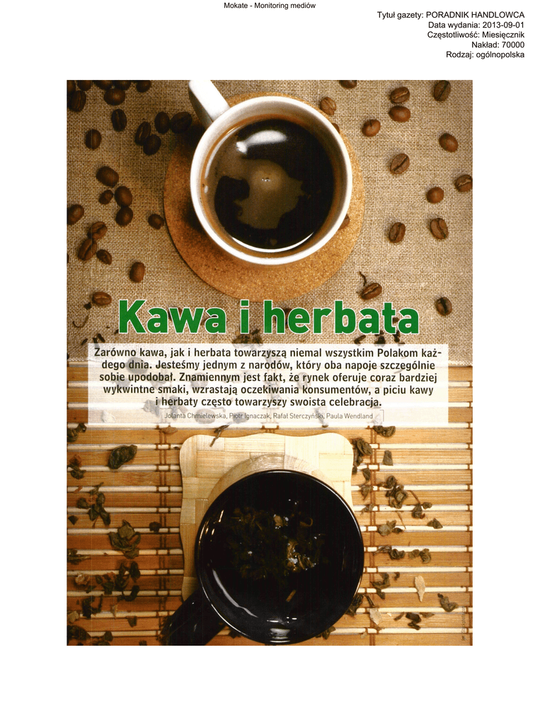 0RNDWH0RQLWRULQJPHGLyZ 7\WXáJD]HW\325$'1,.+$1'/2:&$ 'DWDZ\GDQLD &]ĊVWRWOLZRĞü0LHVLĊF]QLN 1DNáDG 5RG]DMRJyOQRSROVND [ Zarówno kawa, jak i herbata towarzyszą niemal wszystkim Polakom każ dego dnia. Jesteśmy jednym z narodów, który oba napoje szczególnie sobie upodobał. Znamiennym jest fakt, że rynek oferuje coraz bardziej wykwintne smaki, wzrastają oczekiwania konsumentów, a piciu kawy i herbaty często towarzyszy swoista celebracja. Jolanta Chmielewska, Piotr Ignaczak, Rafat Sterczyński, Paula Wendland •� "••• ' **v . ' . A %? 0RNDWH0RQLWRULQJPHGLyZ 7\WXáJD]HW\325$'1,.+$1'/2:&$ 'DWDZ\GDQLD &]ĊVWRWOLZRĞü0LHVLĊF]QLN 1DNáDG 5RG]DMRJyOQRSROVND Piotr Ignaczak Catman Group catman MERCHANDISING KAWY I HERBATY W sklepie spożywczym kawy i herbaty należą do kategorii napojów gorących. To bardzo liczna kategoria, składająca się z wielu segmentów. Znajomość segmentacji i sposobu myślenia klientów stanowi klucz do optymalnego wykorzystania przestrzeni ekspozycyjnej. KAWA � „NAJLEPSZA CHWILA PORANKA, KAWY FILIŻANKA" Kawa, po alkoholach i napojach, jest najważniejszą tzw. suchą kategorią spożywczą w sklepie. Jest to kategoria przyciągająca klienta do sklepu i jednocześnie pozycjonująca sklep w jego oczach. Wiedząc, że większość konsumentów nie wyobraża sobie dnia bez filiżanki kawy, powinniśmy zadbać o to, aby klient w sklepie czu� się doceniony i dopieszczony, mogąc wybierać spośród różnych rodzajów swojego ulubionego napoju. • W jaki sposób dobrać optymalny asortyment kaw w sklepie do 50 m2? Przed podjęciem decyzji, jakie kawy powinny się znaleźć w sklepie, warto pamiętać o tym, że zmienia się sposób picia kawy. Coraz częściej klienci kupują droższe kawy rozpuszczalne, ziarniste, kapsu�ki do ekspresów kawowych lub najnowszy trend na rynku: po�ączenie kawy mielonej z rozpuszczalną. Dlatego dobierając asortyment, powinno się odpowiedzieć na kilka pytań: � Jakiego sklep ma klienta? � Czy jest on bogaty, średniozamożny, a może wręcz nie posiada nadmiaru gotówki? � Czy robi większe zakupy w sklepie, czy może raczej kupuje to, czego mu akurat zabrak�o? � Czy lubi próbować nowości, czy może jest tradycjonalistą? � Czy posiada ekspres i poszukuje kapsu�ek albo kawy ziarnistej, czy może jest smakoszem picia kawy rozpuszczalnej? Najczęściej odpowiedzi na te pytania nie należą do naj�atwiejszych, gdyż bardzo często sklep ma klientów z różnych grup. Jednak określenie, jaki klient pojawia się w sklepie najczęściej, pozwoli trafniej dobrać asortyment. Zalecenia dla sklepu o powierzchni do 50 m2 • Najszerszy asortyment powinno dobrać się z przedzia�u cenowego, który odpowiada największej liczbie klientów, np. jeżeli w przeważającej mierze sklep ma klienta średniozamożnego, większość asortymentu powinna pochodzić ze średniego przedzia�u cenowego, natomiast z segmentu premium i ekonomicznego powinno być po jednym, dwóch reprezentantów. • Oprócz podzia�u cenowego należy brać pod uwagę także podzia� kaw ze względu na rodzaj: mielone, rozpuszczalne, ziarniste, „miksy kawowe", cappuccino oraz kapsu�ki. • W przypadku ma�ej ilości miejsca na pó�ce, warto skoncentrować się na liderach rynkowych � najpopularniejszych kawach na rynku. Należy wybrać po jednym produkcie z kaw ziarnistych, „miksów" (do rozważenia, czy również z kapsu�ek) i po 2�3 produkty z kaw mielonych i rozpuszczalnych. • Gramatura kaw powinna zawierać się maksymalnie w dwóch wielkościach. Nie ma potrzeby inwestować we wszystkie gramatury, ponieważ zwiększa to tylko koszty. • Warto też znaleźć miejsce na nowości rynkowe, ale tylko te, które są sprzedawane pod znaną marką i mają wsparcie reklamowe. Dzięki temu klienci nie będą musieli jechać po nowość do dużego sklepu, przez co zwiększy się obrót, a zmniejszy efekt utraconej sprzedaży. • Jak ustawić kategorie kawy w sklepie detalicznym, aby konsument nie mia� problemu z odnalezieniem swojego ulubionego produktu? Kawa jako jedna z ważniejszych kategorii powinna być przede wszystkim �atwo dostępna dla klienta. Najlepiej ustawić ją w miejscu największego ruchu klientów (z wy�ączeniem strefy wejścia do sklepu). Warto, aby kawa sąsiadowa�a z herbatą (podobnie jak stoi na pó�ce w domu) oraz s�odyczami (tabliczkami czekoladowymi, ciastkami). Takie ustawienie kategorii pozwoli na zwiększenie impulsowych zakupów s�odyczy przy okazji kupowania kawy. Z doborem lokalizacji nierozerwalnie �ączy się ilość miejsca, jakie powinno się przeznaczyć na daną kategorię. I tu z pomocą przychodzą takie wskaźniki, jak obrót i marża. Jest to wyznacznik, który powinien być brany pod uwagę przy doborze ilości miejsca. Najlepszym rozwiązaniem jest proporcjonalne dobranie ilości miejsca do zysku, jaki dana kategoria generuje. kawa i herbata 0RNDWH0RQLWRULQJPHGLyZ 7\WXáJD]HW\325$'1,.+$1'/2:&$ 'DWDZ\GDQLD &]ĊVWRWOLZRĞü0LHVLĊF]QLN 1DNáDG 5RG]DMRJyOQRSROVND Ułożenie horyzontalne dla sklepu do 50 m2 Źródło: Catman Group Zalecenia dla sklepu do 50 m2 • Przede wszystkim pó�kę trzeba podzielić ze względu na rodzaj kawy: mielone, rozpuszczalne, „miksy", cappuccino, ziarniste i kapsu�ki. W ten sposób u�atwi się klientowi szybkie znalezienie interesującego go produktu. • Najwięcej miejsca trzeba przeznaczyć dla kaw rozpuszczalnych i mielonych, gdyż to na nich opiera się biznes kawowy, a dla „miksów", cappuccino, ziaren i kapsu�ek odpowiednio mniej. • Kawy rozpuszczalne należy ustawiać powyżej lub po lewej stronie kaw mielonych, a większe opakowania przed mniejszymi. Taki uk�ad pozwoli zwiększyć sprzedaż. Przy lub pod kawami mielonymi należy u�ożyć kawy ziarniste, a następnie inne rodzaje kaw. • Nowości w postaci kaw mieszanych (rozpuszczalna z mieloną) należy ze względu na większą zawartość k