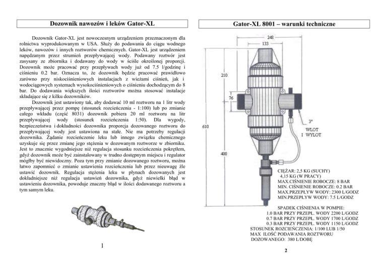 Dozownik nawozów i leków Gator-XL Dozownik Gator-XL jest nowoczesnym urządzeniem przeznaczonym dla rolnictwa wyprodukowanym w USA. Służy do podawania do ciągu wodnego leków, nawozów i innych roztworów chemicznych. Gator-XL jest urządzeniem napędzanym przez strumień przepływającej wody. Podawany roztwór jest zasysany ze zbiornika i dodawany do wody w ściśle określonej proporcji. Dozownik może pracować przy przepływach wody już od 7.5 l/godzinę i ciśnieniu 0.2 bar. Oznacza to, że dozownik będzie pracować prawidłowo zarówno przy niskociśnieniowych instalacjach z wieżami ciśnień, jak i wodociągowych systemach wysokociśnieniowych o ciśnieniu dochodzącym do 8 bar. Do dodawania większych ilości roztworów można stosować instalacje składające się z kilku dozowników. Dozownik jest ustawiony tak, aby dodawać 10 ml roztworu na 1 litr wody przepływającej przez pompę (stosunek rozcieńczenia - 1:100) lub po zmianie całego wkładu (część 8031) dozownik pobiera 20 ml roztworu na litr przepływającej wody (stosunek rozcieńczenia 1:50). Dla wygody, bezpieczeństwa i dokładności dozownika proporcja dozowanego roztworu do przepływającej wody jest ustawiona na stałe. Nie ma potrzeby regulacji dozownika. Żądanie rozcieńczenie leku lub innego związku chemicznego uzyskuje się przez zmianę jego stężenia w dozowanym roztworze w zbiorniku. Jest to znacznie wygodniejsze niż regulacja stosunku rozcieńczenia pokrętłem, gdyż dozownik może być zainstalowany w trudno dostępnym miejscu i regulator mógłby być niewidoczny. Poza tym przy zmianie dozowanego roztworu, można łatwo zapomnieć o zmianie ustawienia rozcieńczenia lub przez nieuwagę źle ustawić dozownik. Regulacja stężenia leku w płynach dozowanych jest dokładniejsze niż regulacja ustawień dozownika, gdyż niewielki błąd w ustawieniu dozownika, powoduje znaczny błąd w ilości dodawanego roztworu a tym samym leku. Gator-XL 8001 – warunki techniczne CIĘŻAR: 2,5 KG (SUCHY) 4,15 KG (W PRACY) MAX.CIŚNIENIE ROBOCZE: 8 BAR MIN. CIŚNIENIE ROBOCZE: 0.2 BAR MAX.PRZEPŁYW WODY: 2300 L/GODZ MIN.PRZEPŁYW WODY: 7.5 L/GODZ SPADEK CIŚNIENIA W POMPIE: 1.0 BAR PRZY PRZEPŁ. WODY 2200 L/GODZ 0.7 BAR PRZY PRZEPŁ. WODY 1700 L/GODZ 0.3 BAR PRZY PRZEPŁ. WODY 1150 L/GODZ STOSUNEK ROZCIEŃCZENIA: 1/100 LUB 1/50 MAX ILOŚĆ PODAWANIA ROZTWORU DOZOWANEGO: 380 L/DOBĘ 1 2 Gator-XL 8001 – schemat instalacji Działanie i konserwacja dozownika Gator-XL 8001 Procedura uruchomienia dozownika. Przy rozpoczęciu pracy dozownika zawory na obejściu (zawór A), na wlocie do dozownika (zawór B) i redukujący ciśnienie w układzie (zawór D) powinny być zamknięte. Otworzyć zawór na wylocie z dozownika (zawór C) i zawór przy punkcie poboru wody z dodanym roztworem (przy poidle, zlewie itp.), następnie otworzyć częściowo zawór B, tak, aby woda płynęła przez dozownik z szybkością ok. 3,8 l/min (dozownik powinien stukać mniej więcej raz na 4 sekundy). Pozwól płynąć wodzie przez ok. 2 minuty (20-30 stuknięć dozownika), aż roztwór ze zbiornika zostanie zassany przez elastyczny przewód do dozownika. Wtedy należy zamknąć zawór przy punkcie poboru roztworu i całkowicie otworzyć zawór B. Teraz dozownik model 8001 będzie już pracować prawidłowo. Upewnij się, że przez dozownik nie przepływa więcej niż 2300 l/godz. (dozownik nie stuka szybciej niż 23 razy/sek.), a ciśnienie nie jest wyższe niż 8 bar. Dozownik może być zainstalowany na stałe do rur wodnych, lub zamontowany w dowolnym położeniu* przy pomocy wspornika mocującego lub podłączony do sieci wodnej przy pomocy szybkozłączek i elastycznego przewodu. * Jeśli dozownik zostanie zamontowany bezpośrednio nad zbiornikiem z roztworem dozowanym, będzie mniejsze prawdopodobieństwo wytworzenia się korka powietrza. URUCHAMIANIE DOZOWNIKA: Zamknąć zawór doprowadzający wodę do dozownika i otwórz zawór wylotowy (przy poidle, zlewie, itp.). Następnie powoli otwierać zawór doprowadzający wodę do dozownika, aż dozownik zacznie stukać mniej więcej raz na 4 sekundy. Odczekać, aż roztwór dozowany zostanie zassany do dozownika. Teraz dozownik będzie już pracować prawidłowo. 3 PRZED ROZPOCZĘCIEM PRACY Z DOZOWNIKIEM GATOR-XL ZAWSZE ZREDUKUJ CIŚNIENIE W UKŁADZIE. Zamknij zawór B na wlocie oraz zwór C na wylocie dozownika i otwórz zawór D służący do redukcji ciśnienia. Jeżeli zawór D nie został zainstalowany, zamknij wszystkie zawory doprowadzające wodę do dozownika i systemu, (również zawór A), a następnie otwórz zawór C na wylocie dozownika i zawór przy punkcie poboru wody. W ten sposób ciśnienie wody zostanie zredukowane. 4 Likwidowanie korka powietrza. We wszystkich pompach tłokowych Czyszczenie filtra wody. Gdy dozowana woda zawiera zawieszone pracujących przy wyższych ciśnieniach, istnieje niebezpieczeństwo wytworzenia się korka powietrza. Najbardziej prawdopodobne jest jego powstanie przy rozruchu, gdy ciśnienie wody jest wysokie. Powstanie korka powietrza objawia się tym, że roztwór dozowany nie podnosi się w elastycznym przewodzie, podczas gdy woda przepływ przez układ, a dozownik wydaje stukający dźwięk. Dozownik Gator-XL jest zaprojektowany tak, aby zminimalizować możliwość wytworzenia się korka powietrza, ale gdy jednak się pojawi łatwo można go zlikwidować prostą procedurą: • W przypadku układu z zainstalowanym zaworem redukującym ciśnienie : Zamknąć zawory A, B i C i otworzyć zawór D (redukujący ciśnienie w układzie). Następnie otworzyć częściowo zawór B tak, aby woda płynęła przez pompę z szybkością ok. 4 l/min (dozownik powinien stukać mniej więcej raz na 4 sekundy). Należy pozwolić płynąć wodzie przez ok. 2 minuty (20-30 stuknięć dozownika), aż roztwór ze zbiornika zostanie zassany przez elastyczny przewód do dozownika. W ten sposób korek powietrza zostanie usunięty. Następnie zamknij zaw