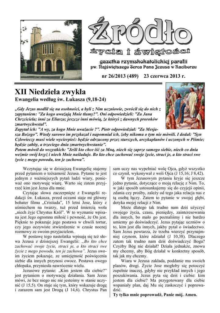 gazetka rzymskokatolickiej parafii pw. Najświętszego Serca Pana Jezusa w Raciborzu nr 26/2013 (489) 23 czerwca 2013 r. XII Niedziela zwykła Ewangelia według św. Łukasza (9,18-24) „Gdy Jezus modlił się na osobności, a byli z Nim uczniowie, zwrócił się do nich z zapytaniem: ”Za kogo uwaŜają Mnie tłumy?”. Oni odpowiedzieli: ”Za Jana Chrzciciela; inni za Eliasza; jeszcze inni mówią, Ŝe któryś z dawnych proroków zmartwychwstał”. Zapytał ich: ”A wy, za kogo Mnie uwaŜacie ?”. Piotr odpowiedział: ”Za Mesjasza BoŜego”. Wtedy surowo im przykazał i napomniał ich, Ŝeby nikomu o tym nie mówili. I dodał: ”Syn Człowieczy musi wiele wycierpieć: będzie odrzucony przez starszych, arcykapłanów i uczonych w Piśmie; będzie zabity, a trzeciego dnia zmartwychwstanie”. Potem mówił do wszystkich: ”Jeśli kto chce iść za Mną, niech się zaprze samego siebie, niech co dnia weźmie swój krzyŜ i niech Mnie naśladuje. Bo kto chce zachować swoje Ŝycie, straci je, a kto straci swe Ŝycie z mego powodu, ten je zachowa”. Wczytując się w dzisiejszą Ewangelię stajemy przed pytaniem o toŜsamość Jezusa. Pytanie to jest jednym z waŜniejszych pytań ludzi wiary, poniewaŜ ono motywuję wiarę. Warto się zatem przyjrzeć kim jest Jezus dla mnie. Czytając słowa zaczerpnięte z Ewangelii redakcji św. Łukasza, przed oczami staje mi główny bohater filmu „Cristiada”, 15 letni Jose, który z uśmiechem na twarzy, tuŜ przed śmiercią woła „niech Ŝyje Chrystus Król”. W to wyznanie wpisana jest Jego ogromna miłość i pewność, Ŝe On jest. Pięknie to pokazuje jego postawa w chwili tortur, czy jego oczywiste stwierdzenie w czasie nocnej rozmowy ze swoim przyjacielem. W postawę tego nastolatka wpisują się teŜ słowa Jezusa z dzisiejszej Ewangelii: „Bo kto chce zachować swoje Ŝycie, straci je, a kto straci swe Ŝycie z mego powodu, ten je zachowa”. Jezus swoim Ŝyciem pokazuje, ze umiejętność poświęcenia siebie dla innych przynosi owoce. Postawa owego chłopaka, przyniosła nawrócenie wielu. Jezusowe pytanie: „Kim jestem dla ciebie?” jest pytaniem o motywację działania. Sam Jezus mówi, Ŝe bez niego nic nie jesteśmy w stanie uczynić (J 15,5). On staje się tym, który wskazuje drogę i zarazem sam jest Drogą (J 14,6). Chrystus Pan sam uczy nas wypełniać wolę Ojca, gdyŜ wszystko co czynił, wykonywał z woli Ojca (J 15,16; J 8,42). W tym Jezusowym pytaniu kryje się jeszcze jedno pytanie, dotyczące o moją relację z Nim. To, w jaki sposób ustosunkujemy się do czyjejś opinii, zdania czy prośby, zaleŜy od tego jaka relacja nas z tą osobą łączy. Zatem to pytanie w swojej głębi, dotyka mojej relacji z Nim. MoŜe dlatego tak trudno nam dziś uŜyczyć swojego Ŝycia, czasu, pieniędzy, zainteresowania dla innych, bo mało go poznaliśmy i nie bardzo umiemy go doświadczyć. Jezus pytając uczniów o to, kim jest dla innych, jakby pytał o świadectwo. Sam Jezus powtarza, Ŝe trzeba wierzyć przynajmniej czynom, które zdziałał (J 10,38). Dlaczego zatem tak trudno nam dziś doświadczyć Boga? CzyŜby Bóg nie działał? Działa jednakŜe, znowu my chcemy, aby Bóg działał w konkretny sposób, tak jak my chcemy. Wiara w Jezusa zakłada, poddanie mu swoich planów, drogi. śycie Jose mogłoby się potoczyć zupełnie inaczej, gdyby nie przykład innych i jego poszukiwania. Jezus pyta się dziś i ciebie: kim jestem dla ciebie? Ma przygotowany dla ciebie wspaniały plan, daj Mu się zaskoczyć i poprowadzić. Ty tylko mnie poprowadź, Panie mój. Amen. 2 Źródło - gazetka Poniedziałek – 24 czerwca 2013 – Narodzenie św. Jana Chrzciciela Łk 1,57-66.80 630 Z podziękowaniem za otrzymane łaski, z prośbą o zdrowie i BoŜe błogosławieństwo w intencji rodziny Koza 700 Za †† Weronikę, Jana i Bolesława Szeremet oraz Ilinę i Jana Goszko 1800 1. Za †† rodziców Cecylię i Jerzego Szefler oraz Gizelę Szefler 2. Za † siostrę Rozwitę Kosselek w 6. rocznicę śmierci, †† rodziców Roberta i Helenę Kosselek oraz za † męŜa Henryka Dobiesa NaboŜeństwo czerwcowe Wtorek – 25 czerwca 2013 Mt 7,6.12-14 630 Za †† rodziców Marię i Pawła, dziadków i całe pokrewieństwo 800 W języku niemieckim: Zu Gottes Barmherzigkeit für den † Erhard Solf, für die †† Eltern beiderseits sowie für alle †† aus den Familien Solf und Hawliczek 900 Za †† rodziców Genowefę i Franciszka, brata Romana i dziadków z obu stron 1800 1. Za † Joachima Kłoska 2. Do BoŜej Opatrzności w intencji Andrzeja z okazji 60. rocznicy urodzin, z podziękowaniem za otrzymane łaski, z prośbą o BoŜe błogosławieństwo i zdrowie w rodzinie NaboŜeństwo czerwcowe Środa – 26 czerwca 2013 Mt 7,15-20 630 Dziękczynna z okazji urodzin Edyty, z prośbą o BoŜe błogosławieństwo i zdrowie w rodzinie oraz za †† mamę Marię, jej rodziców i rodzeństwo i † księdza misjonarza Brunona Wolnika 700 Z okazji 3. rocznicy ślubu Kamila i Edyty o BoŜe błogosławieństwo i opiekę Matki BoŜej 1800 1. Za † matkę Henrykę Rudzką w 4. rocznicę śmierci 2. Za † ojca Jerzego Raczka w 20. rocznicę śmierci, † matkę Gertrudę, †† z pokrewieństwa i dusze w czyśćcu cierpiące NaboŜeństwo czerwcowe Czwartek – 27 czerwca 2013 Mt 7,21-29 630 Do BoŜej Opatrzności przez wstawiennictwo Matki Boskiej Nieustającej Pomocy z podziękowaniem za otrzymane łaski w intencji Agnieszki i Łukasza z okazji I rocznicy ślubu, z prośbą o dalsze BoŜe błogosławieństwo i zdrowie w rodzinie 700 Za † Ŝonę Ludwikę Tomanek, †† braci i rodziców z obu stron 1630 Szkolna: Dziękczynna na zakończenie roku szkolnego i katechetycznego 1800 Za †† Jana Olszynę, Ŝonę Annę, córkę Marię, rodziców z obu stron NaboŜeństwo czerwcowe Piątek – 28 czerwca 2013 – św. Ireneusza, biskupa i męczennika Mt 8,1-4 630 Za † męŜa Stefana Martyniaka w rocznicę śmierci 900 O BoŜe