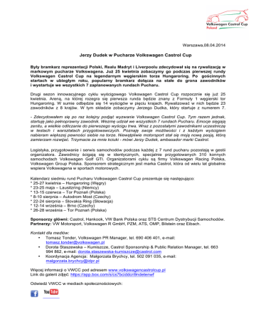 Warszawa,08.04.2014 Jerzy Dudek w Pucharze Volkswagen Castrol Cup Były bramkarz reprezentacji Polski, Realu Madryt i Liverpoolu zdecydował się na rywalizację w markowym pucharze Volkswagena. Już 25 kwietnia zobaczymy go podczas pierwszej rundy Volkswagen Castrol Cup na legendarnym węgierskim torze Hungaroring. Po gościnnych startach w ubiegłym roku, popularny bramkarz dołącza na stałe do grona zawodników i wystartuje we wszystkich 7 zaplanowanych rundach Pucharu. Drugi sezon innowacyjnego cyklu wyścigowego Volkswagen Castrol Cup rozpocznie się już 25 kwietnia. Areną, na której rozegra się pierwsza runda będzie znany z Formuły 1 węgierski tor Hungaroring. W sumie odbędzie się 14 wyścigów w pięciu krajach. Rywalizować w nich będzie 23 zawodników z 8 krajów. W tym składzie zobaczymy Jerzego Dudka, który startuje z numerem 7. - Zdecydowałem się po raz kolejny podjąć wyzwanie Volkswagen Castrol Cup. Tym razem jednak, startuję jako pełnoprawny zawodnik. Wezmę udział we wszystkich 7 rundach Pucharu. Emocje sięgają zenitu, a wielkie odliczanie do pierwszego wyścigu trwa. Wraz z pozostałymi zawodnikami uczestniczę w testach i warsztatach przygotowawczych. Poznaję swoje możliwości i z każdym wyścigiem nabieram większej pewności siebie na torze. Niewątpliwie motorsport stał się moją nową pasją, którą zamierzam rozwijać. Trzymacie za mnie kciuki - mówi Jerzy Dudek, ambasador marki Castrol. Logistyka, przygotowanie i serwis samochodów podczas każdej z 7 rund pucharu pozostają w gestii organizatora. Zawodnicy ścigają się w identycznych, specjalnie przygotowanych 310 konnych samochodach Volkswagen Golf GTI. Organizatorami cyklu są firmy Volkswagen Racing Polska, Volkswagen Group Polska. Sponsorem strategicznym jest marka Castrol, która od wielu lat globalnie wspiera Volkswagena w sportach motorowych. Kalendarz siedmiu rund Pucharu Volkswagen Castrol Cup prezentuje się następująco: * 25-27 kwietnia – Hungaroring (Węgry) * 23-25 maja – Lausitzring (Niemcy) * 13-15 czerwca – Tor Poznań (Polska) * 8-10 sierpnia – Autodrom Most (Czechy) * 22-24 sierpnia – Slovakia Ring (Słowacja) * 12-14 września – Brno (Czechy) * 26-28 września – Tor Poznań (Polska) Sponsorzy główni: Castrol, Hankook, VW Bank Polska oraz STS Centrum Dystrybucji Samochodów. Partnerzy: VW Motorsport, Volkswagen R GmbH, PZM, ATS, OMP, Bilstein oraz Eibach. Kontakt dla mediów: • Tomasz Tonder, Volkswagen PR Manager, tel. 690 406 401, e-mail: [email protected] • Dorota Staszewska – Kumiszcze, Castrol Sponsorship & Public Relation Manager, tel. 663 994 862, e-mail: [email protected] • Koordynacja Agencja: Małgorzata Brychcy, tel. 502 091 035, e-mail: [email protected] Więcej informacji o VWCC pod adresem www.volkswagencastrolcup.pl Link do galerii zdjęć: https://app.box.com/s/cs7bciddcri9ndetenwf Odwiedź VWCC w mediach społecznościowych: