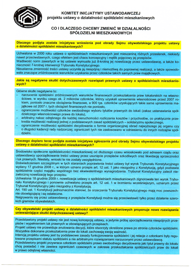 KOMITET INICJATYWY USTAWODAWCZEJ projektu ustawy o dziatalnosci spotdzielni mieszkaniowych CO I DLACZEGO CHCEMY ZMIENIC W DZIALALNOSCI SPOLDZIELNI MIESZKANIOWYCH Dlaczego podjeta zostaia inicjatywa wniesienia pod obrady Sejmu obywatelskiego projektu ustawy o dziatalnosci spotdzielni mieszkaniowych? Uchwalona w 2000 roku ustawa o spotdzielniach mieszkaniowych jest mieszanina_ roznych przestanek, niekiedy nawet przeciwstawnych, czego efektem jest chaos koncepcyjny i m§tlik poj^ciowy jej przepisow. Wadliwosc norm zawartych w tej ustawie wymusita juz 8-krotna^ jej nowelizacj? przez ustawodawc?, a takze koniecznosc 7-krotnej interwencji Trybunatu Konstytucyjnego. Nieustanna zmiennosc tresci ustawy uczynita ja_ niespojna_ i niemozliwa_ do poprawnej realizacji, a takze spowodowata znacza^ce zroznicowanie warunkow uzyskania przez cztonkow takich samych praw majajtkowych. Jakie 53 negatywne skutki dotychczasowych rozwiazari prawnych ustawy o spotdzielniach mieszkaniowych? Gtowne skutki negatywne to: - narzucenie spotdzielni zroznicowanych warunkow finansowych przeksztatcenia praw lokatorskich na wtasnosciowe, w wyniku czego ok. 2 milionow cztonkow, ktorzy uzyskali uprawnienia wtasnosciowe przed 2007 rokiem, poniosio znaczne obcia_zenia finansowe, a 900 tys. cztonkow uzyskujqcych takie same uprawnienia majajkowe od 2007 r. tych obciqzeri finansowych nie poniosto, - ograniczenie mozliwosci cztonkow swobodnego wyboru tytutow prawnych do lokali (zakaz ustanawiania spotdzielczego wtasnosciowego prawa do iokalu), - arbitralny nakaz odrebnego dla kazdej nieruchomosci rozliczania kosztow i przychodow, co praktycznie przekresia mozliwosc realizacji jednej z podstawowych zasad spoldzielczych - solidaryzmu spoiecznego, - ograniczenie mozliwosci spotdzielni decydowania o formie organizacyjnej obrad najwyzszego jej organu czy o dtugosci kadencji rady nadzorczej; ograniczen tych nie zastosowano w odniesieniu do innych rodzajow spotdzielni. Diaczego dopiero teraz podjeta zostaia inicjatywa zgtoszenia pod obrady Sejmu obywatelskiego projektu ustawy o dziatalnosci spotdzielni mieszkaniowych? Srodowisko spoteczne spotdzielczosci mieszkaniowej od dtuzszego czasu wnioskowato pod adresem rze[du oraz ustawodawcy uporzqdkowanie tresci ustawy przez usuni^cie przepisow szkodliwych oraz likwidacj? sprzecznosci i luk prawnych. Niestety, wnioski te nie zostaty uwzgl^dnione. Doswiadczeniem szczegolnym w tych staraniach poprawienia tresci ustawy byt wyrok Trybunatu Konstytucyjnego wydany 17 grudnia 2008 r., w ktorym uznano przepis art. 12 ust. 1 jako niezgodny z Konstytucja_, gdyz pozbawia spotdzielnie cz^sci majajku wspolnego bez ekwiwalentnego wynagrodzenia. Trybunat Konstytucyjny zalecit niezwtoczna^ nowelizacj? tego przepisu. Uchwalona 18 grudnia 2009 r. nowelizacja ustawy o spotdzielniach mieszkaniowych zignorowata ten wyrok Trybunatu Konstytucyjnego i ponownie uchwalono przepis art. 12 ust. 1 w brzmieniu wczesniejszym, uznanym przez Trybunat Konstytucyjny jako niezgodny z Konstytucja_. Art. 190 ust. 1 Konstytucji jednoznacznie stanowi, ze orzeczenia Trybunatu Konstytucyjnego maja_ moc powszechnie obowia_zuja_ca^ i sa_ ostateczne. Naigrywaniu si§ przez ustawodawcy z przepisow Konstytucji mozna si? przeciwstawic tylko przez dziatanie szerokich gremiow obywatelskich. Czy obywatelski projekt ustawy o dziatalnosci spotdzielni mieszkaniowych proponuje nowe rozwiqzania uniewazniaja,ce skutki dotychczasowej ustawy? Przedstawiony projekt ustawy nie jest nowa_ koncepcja_ ustawy, a jedynie proba_ uporz£[dkowania niespojnych przepisow i wypetnieniem luk prawnych w obowiqzuja_cych przepisach. Projekt ustawy nie przewiduje anulowania decyzji, ktore stworzyty okreslone prawa po stronie cztonkow spotdzielni. Wszystkie dokonane przeksztatcenia praw do lokali zachowaja, swoja^ waznosc. lntencja_ projektu ustawy jest by podstawowe zasady funkcjonowania spotdzielni i jej relacje z cztonkami byty regulowane przepisami statutu spotdzielni a nie arbitralnymi rozwia_zaniami narzuconymi przez ustawodawc?. Przedstawiony projekt przywraca cztonkom spotdzielni prawo swobodnego decydowania jaki tytut prawny do Iokalu chca^ posiadac i nie zawiera ograniczen czasowych w zakresie przeksztatcania spotdzielczych praw do lokali w prawo odrebnej wtasnosci. Projekt ustawy dopuszcza przeksztatcenie spotdzielczego lokatorskiego prawa do mieszkania zarowno na spotdzielcze wtasnosciowe prawo do lokalu jak i w prawo odr^bnej wtasnosci. Zasady finansowe tych przeksztatceri powinien okreslac statut spotdzielni. W odniesieniu do spotdzielczych mieszkan lokatorskich, ktorych liczba w ostatnich latach zmniejszyta si§ do 5% catosci spoldzielczych zasobow projekt ustawy przewiduje: - utrzymanie norm chroniqcych prawo do lokalu osob bliskich zamieszkatych z cztonkiem, - uporza_dkowanie zasad rozliczeh finansowych w przypadku wygasni^cia lokatorskiego prawa (zwrot zwaloryzowanego wktadu mieszkaniowego). Czy obywatelski projekt ustawy dopuszcza mozliwosc wspolnego rozliczania kosztow i przychodow z tytutu uzytkowania lokali dla kilku nieruchomosci w celu zapobiegania nadmiernemu zroznicowaniu obciazeri czlonkow zajmuja_cych lokale nawet w sqsiednich nieruchomosciach, a nie ma to zwiqzku z jakosciq warunkow zamieszkiwania? Projekt ustawy jako zasad§ przyjmuje rozliczanie przychodow i kosztow zwia/anych z eksploatacja^ i utrzymaniem nieruchomosci odr^bnie dla kazdej nieruchomosci. Dopuszcza jednak mozliwosc wspolnego rozliczania kosztow i przychodow dla dwu lub wi^cej nieruchomosci, jezeli taka zasada przyj^ta zostanie w statucie spotdzielni. Czy zgodnie z obywatelskim projektem ustawy o dziatalnosci spotdzielni mieszkaniowych wtasciciele lokali beda miec wplyw na zmiane sposobu zarzqdzania nieruchomosci^? Projekt ustawy stwarza wiascicielom lokali mozliwosc rezygnacji z ustug spotdzielni i utworzenia wspolnoty mieszkaniowej w dwoch przypadkach, tj.: - gdy wi^kszosc wtascicieli lokali potozonych w obr^bie danej nieruchomosci podejmie uchwat? o utworzeniu wspolnoty, - 
