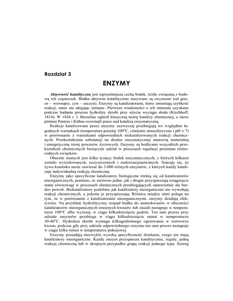 Rozdział 3 ENZYMY Aktywność katalityczna jest najważniejszą cechą białek, ściśle związaną z budową ich cząsteczek. Białka aktywne katalitycznie nazywane są enzymami (od grec. en – wewnątrz, zym – zaczyn). Enzymy są katalizatorami, które zmieniają szybkość reakcji, same nie ulegając zmianie. Pierwsze wiadomości o ich istnieniu uzyskano podczas badania procesu hydrolizy skrobi przy użyciu wyciągu słodu (Kirchhoff, 1814). W 1836 r. J. Berzelius ogłosił klasyczną teorię katalizy chemicznej, a nieco później Pasteur i Kühne rozwinęli prace nad katalizą enzymatyczną. Reakcje katalizowane przez enzymy zazwyczaj przebiegają we względnie łagodnych warunkach (temperatura poniżej 100oC, ciśnienie atmosferyczne i pH ≈ 7) w porównaniu z warunkami odpowiednich niekatalizowanych reakcji chemicznych. Przekształcenia substancji na drodze enzymatycznej stanowią materialną i energetyczną istotę procesów życiowych. Enzymy są bodźcami wszystkich przekształceń chemicznych biorącymi udział w procesach regulacji przemian różnorodnych związków. Obecnie znanych jest kilka tysięcy białek enzymatycznych, z których kilkaset zostało wyizolowanych, oczyszczonych i zsekwencjonowanych. Szacuje się, że żywa komórka może zawierać do 3.000 różnych enzymów, z których każdy katalizuje indywidualną reakcję chemiczną. Enzymy jako specyficzne katalizatory biologiczne różnią się od katalizatorów nieorganicznych, pomimo, że zarówno jedne, jak i drugie przyspieszają osiągnięcie stanu równowagi w procesach chemicznych przebiegających samorzutnie ale bardzo powoli. Biokatalizatory podobnie jak katalizatory nieorganiczne nie wywołują reakcji chemicznych, a jedynie je przyspieszają. Różnica między nimi polega na tym, że w porównaniu z katalizatorami nieorganicznymi, enzymy działają efektywnie. Na przykład, hydrolityczny rozpad białka do aminokwasów w obecności katalizatorów nieorganicznych (mocnych kwasów lub zasad) następuje w temperaturze 100°C albo wyższej, w ciągu kilkudziesięciu godzin. Ten sam proces przy udziale enzymów przebiega w ciągu kilkudziesięciu minut w temperaturze 30-40°C. Hydroliza skrobi wymaga kilkugodzinnego ogrzewania w roztworze kwasu, podczas gdy przy udziale odpowiedniego enzymu ten sam proces następuje w ciągu kilku minut w temperaturze pokojowej. Enzymy posiadają niezwykle wysoką specyficzność działania, czego nie mają katalizatory nieorganiczne. Każdy enzym przyspiesza katalitycznie, reguły, jedną reakcję chemiczną lub w skrajnym przypadku grupę reakcji jednego typu. Szereg 64 Podstawy biochemii różnic pomiędzy enzymami i zwykłymi katalizatorami nieorganicznymi związanych jest z białkową naturą enzymów. Należą do nich: stabilność termiczna, zależność od pH środowiska, obecność aktywatorów lub inhibitorów i in. Katalityczne działanie enzymów reguluje procesy hydrolizy, fosforolizy, utlenienia i redukcji, rozszczepienia i syntezy, izomeryzacji, przenoszenia grup funkcyjnych, takich jak rodniki metylowe lub reszty kwasu fosforowego. Zdecydowana większość procesów chemicznych zachodzących w żywych organizmach przebiega przy udziale enzymów przede wszystkim dlatego, że ich funkcja katalityczna stanowi podstawę procesów życiowych. Oddziaływanie enzymów na substancje lecznicze, np. na antybiotyki, prowadzi do zmian ich struktury, co umożliwia wyleczenie choroby. Odwrotnie, zmiana aktywności enzymatycznej pod wpływem toksyn bakteryjnych i innych trucizn prowadzi do utrwalenia stanu chorobowego organizmu. Stymulowanie wzrostu roślin preparatami stosowanymi w rolnictwie w większości przypadków polega na zakłócaniu procesów biosyntezy przez wpływanie na aktywność enzymów. Specyficzność enzymów decyduje o zróżnicowaniu gatunkowym organizmów, a zaburzenia ich biosyntezy mogą być przyczyną chorób dziedzicznych. Enzymy izolowane ze źródeł naturalnych nie tracą swych zdolności katalitycznych. Właściwość ta znalazła praktyczne zastosowanie w przemyśle lekkim, chemicznym, farmaceutycznym i przetwórczym. Szczególne znaczenie dla przemysłu chemicznego ma specyficzność enzymów. Szacuje się, że ok. 80% strat w produkcji niektórych substancji chemicznych spowodowane jest oddzielaniem domieszek, powstających jako produkty reakcji ubocznych. Proces technologiczny zostaje znacznie przyspieszony, gdy reakcje syntezy przeprowadza się za pośrednictwem wysoko wyspecjalizowanych enzymów, przyspieszających tylko reakcję powstawania żądanego produktu. Ponadto, enzymy umożliwiają przebieg wielu procesów, których do tej pory nie udało się przeprowadzić tradycyjnymi metodami syntezy organicznej. Przykładem może tu być otrzymywanie leków przeciwzapalnych drogą enzymatycznej transformacji sterydów. 3.1. Budowa enzymów Enzymy mogą być jednoskładnikowymi, prostymi białkami lub białkami złożonymi. W wielu przypadkach enzym zawiera dodatkową grupę niebiałkową, tak zwany koenzym. W różnych okresach stosowano różne nazwy części białkowej i grupy dodatkowej. Wszystkie z nich (wymienione poniżej) stosowane są także obecnie, np.: Enzym jako całość Simpleks Holoferment Część białkowa Feron (nośnik) Apoenzymn Grupa dodatkowa Agon (grupa aktywna) Koenzym Rozdział 3. Enzymy 65 Grupa dodatkowa, która oddysocjowuje od części białkowej, nazywana jest grupą prostetyczną, a grupa dodatkowa, łatwo ulegająca dysocjacji od apoenzymu i zdolna do samodzielnego funkcjonowania, nazywana jest koenzymem. Budowa chemiczna najważniejszych koenzymów została opisana w latach 30. XX wieku w pracach O. Warburga, R Kuhna, P. Karrera. Okazało się, że rolę koenzymów pełni większość witamin (E, K, Q, B1, B2, B6, C, H) lub związków zawierających witaminy (koenzym A, NAD+). Aktywność koenzymatyczną posiadają także związki, takie jak: HS-glutation, liczna grupa nukleotydów i ich pochodnych oraz