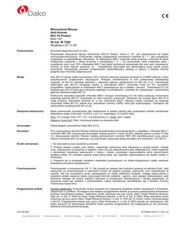 Monoclonal Mouse Anti-Human BCL10 Protein Klon 151 Nr kat. M 7260 Wydanie z 27.11.03 Przeznaczenie Do badań diagnostycznych in vitro. Przeciwciało Monoclonal Mouse Anti-Human BCL10 Protein, Clone K 151, jest przeznaczone do badań immunocytochemicznych. Przeciwciało znakuje podpopulacje normalnych komórek B i T i jest przydatnym narzędziem w podklasyfikacji chłoniaków. W chłoniakach MALT (chłoniaki strefy brzeżnej z komórek B tkanki limfatycznej związanej z błoną śluzową) z translokacją t (1 ; 14) przeciwciało silnie znakowało jądra i cytoplazmę, przy czym 55% chłoniaków MALT bez takiej translokacji wykazywało taki sam wzór znakowania, chociaż na dużo niższym poziomie (1). Identyfikacja różnicująca jest wspomagana przez wyniki panelu przeciwciał. Interpretację powinien przeprowadzić wykwalifikowany patolog w oparciu o historię choroby pacjenta oraz inne testy diagnostyczne. Wstęp Gen BCL10 koduje białko aminokwasu 233 z domeną rekrutacji kaspazy terminalu N (CARD) wykrytą w kilku apoptotycznych cząsteczkach regulujących. Wstępne doświadczenia in vitro przejściowej nadekspresji sugerują, że BCL10 wywołuje apoptozę i uaktywnia jądrowy współczynnik- (NF-) (1,2). Translokacje obejmujące gen BCL10 występują rzadko w chłoniakach MALT, stanowiąc mniej niż 5% wszystkich przypadków i dotąd jedynie w chłoniakach MALT pojawiających się w żołądku i płucach. Translokacja t(1;14) zestawia gen BCL10 obok genu łańcucha ciężkiego immunoglobulin i prowadzi do nadekspresji i nienormalnej jądrowej lokalizacji białka BCL10. Praktycznie wszystkie przypadki chłoniaka MALT noszące translokację t(11;18) także wykazują nienormalną ekspresję jądrową BCL10, aczkolwiek na dużo niższych poziomach. Stwierdza się mutacje genu BCL10 w małej proporcji chłoniaków komórek B, w tym chłoniaków MALT. Mutacje często prowadzą do ekspresji okrojonego białka BCL10, jednak przy zachowaniu domeny CARD, która jest wystarczająca i niezbędna dla uaktywnienia współczynnika NF- (2). Odczynnik dostarczony Mysie przeciwciało monoklonalne jest dostarczone w postaci płynnej jako supernatant hodowli komórkowej dializowany wobec 0,05 mol/L Tris/HCL o pH 7,2 i zawierający 15 mmol/L NaN3. Klon: 151 (Uwaga: klony 151 i 151.1 są identyczne) (1). Izotyp: IgG1, kappa. Stężenie mysiej IgG: Patrz: informacja podana na etykiecie fiolki. Immunogen: Pełnej długości rekombinant białka BCL10 (1). Swoistość Przy wykorzystaniu techniki Western blotting dla jednorodnej zamrożonej tkanki z migdałków, chłoniaka MALT i komórek HEK 293, przeciwciało dominująco znakuje pasmo o masie 32 kDa i słabsze pasmo o masie 37 kDa (1). Zastosowanie techniki Western blotting jednorodnych komórek HEK 293 transfekowanych przy użyciu różnych produktów BCL10 wskazuje, że przeciwciało rozpoznaje epitop pomiędzy aminokwasami 122-168 (1). Środki ostrożności 1. Do stosowania przez wyszkolony personel. 2. Produkt zawiera azydek sodu (NaN3), substancję chemiczną silnie toksyczną w czystej postaci. Azydek sodu, zastosowany w produkcie w stężeniu, które nie jest sklasyfikowane jako niebezpieczne, może reagować z elementami kanalizacji wykonanymi z ołowiu i miedzi, powodując nagromadzenie silnie wybuchowych azydków metali. Po usunięciu spłukać dużą ilością wody, aby zapobiec nagromadzeniu się azydku metalu w kanalizacji. 3. Podobnie jak w przypadku wszelkich materiałów pochodzących ze źródeł biologicznych należy stosować prawidłowe procedury postępowania. Przechowywanie Przechowywać w temperaturze 2-8 C. Nie używać po upływie daty ważności podanej na etykiecie fiolki. Jeśli odczynniki są przechowywane w warunkach innych niż podane powyżej, użytkownik musi zweryfikować te warunki. Nie ma oczywistych oznak wskazujących na utratę stabilności produktu. Dlatego jednocześnie z badaniem próbek pacjenta należy wykonywać kontrole dodatnie i ujemne. Jeśli wystąpi nieoczekiwany wzór barwienia, którego nie można wyjaśnić różnicami w procedurach laboratoryjnych i istnieje podejrzenie, że przyczyną może być problem z przeciwciałem, należy niezwłocznie skontaktować się z Działem Pomocy Technicznej naszej firmy. Przygotowanie próbek Skrawki parafinowe: Przeciwciało można stosować do znakowania skrawków tkanek utrwalonych w formalinie, zatopionych w parafinie. Wymagane jest wstępne przygotowanie tkanek za pomocą podwyższonej temperatury podczas odzyskiwania epitopu. Optymalne wyniki otrzymuje się przy użyciu Dako Target Retrieval Solution, High pH, nr kat. S 3308 lub Dako Target Retrieval Solution, o pH 9, nr kat. S 2368. Mniej optymalne wyniki otrzymuje się przy użyciu Dako Target Retrieval Solution, nr kat. S 1700 lub 10 mmol/L buforu cytrynianowego o pH 6.0. Przygotowanie tkanek przy użyciu Dako Proteinase K, nr kat. S 3020 okazało się nieskuteczne. Nie wolno dopuścić do wyschnięcia skrawków tkanki podczas przygotowania lub następującej po nim procedury barwienia immunocytochemicznego. (107160-002) M 7260/PL/CE/27.11.03 p.1/2 Dako Denmark A/S · Produktionsvej 42 · DK-2600 Glostrup · Denmark · Tel. +45 44 85 95 00 · Fax +45 44 85 95 95 · CVR No. 33 21 13 17 Procedura barwienia Rozcieńczanie: Przeciwciało Monoclonal Mouse Anti-Human BCL 10 Protein, nr kat. M 7260, można stosować w rozcieńczeniu w stosunku 1:25-1:50 podczas stosowania na skrawkach ludzkich migdałków lub chłoniaków MALT z translokacją t(1;14) utrwalonych w formalinie i zatopionych w parafinie, stosując wzbudzane temperaturą odzyskiwanie epitopu w Dako Target Retrieval Solution, o pH 9, nr kat. S 2368 przez 20 minut oraz inkubację w temperaturze pokojowej z pierwszym przeciwciałem przez 30 minut. Optymalne warunki mogą się zmieniać w zależności od próbki i metody przygotowania i powinny być określone przez każde z poszczególnych laboratoriów. Zalecaną kontrolą ujemną jest Dako Mouse IgG1, nr 