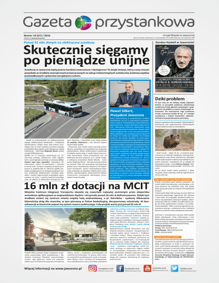Gazeta przystankowa Urząd Miejski w Jaworznie Numer 14 (57) / 2016 Biuro Promocji i Informacji, ul. Grunwaldzka 33, 43-600 Jaworzno, tel. (32) 61 81 585 Więcej na www.jaworzno.pl Ponad 41 mln złotych na elektryczne autobusy Skutecznie sięgamy po pieniądze unijne Gordon Haskell w Jaworznie! Autobusy w Jaworznie będą jeszcze bardziej nowoczesne i ekologiczne! To dzięki dotacji, którą nasze miasto pozyskało ze środków zewnętrznych przeznaczonych na zakup niskoemisyjnych autobusów, budowę węzłów przesiadkowych i systemów zarządzania ruchem. Dziki problem Paweł Silbert, Prezydent Jaworzna - Środki te przeznaczymy na dofinansowanie zakupu elektrycznych autobusów i niezbędnej infrastruktury. Dzięki temu pod koniec przyszłego roku co trzeci autobus we flocie naszego przedsiębiorstwa będzie miał ekologiczny napęd elektryczny - informuje Zbigniew Nosal, prezes zarządu PKM Jaworzno. Spółka od 17 miesięcy eksploatuje już 12metrowy autobus elektryczny. Kilka tygodni temu rozstrzygnięto przetarg na dostawę 16 kolejnych tego typu pojazdów: dziewięciu 18metrowych, trzech 12-metrowych i czterech w wersji midi. Umowa z dostawcą zostanie podpisana w październiku br. Obecnie spółka prowadzi postępowanie na dostawę kolejnych sześciu autobusów elektrycznych. Dostawy pojazdów z dwóch tegorocznych przetargów zaplanowano na trzeci i czwarty kwartał przyszłego roku. W efekcie za kilkanaście miesięcy po uli- cach Jaworzna i sąsiednich miast będą jeździć 23 pojazdy elektryczne z 60, którymi będzie dysponować spółka. - Przyznane nam środki unijne pozwolą pokryć 85 proc. wydatków na nową flotę oraz niezbędną infrastrukturę. Zakup elektrycznych autobusów to kolejny ważny etap w modernizacji jaworznickiej komunikacji, która prowadzona jest od kilkunastu lat przy wsparciu m.in. władz miasta, a zwłaszcza prezydenta Pawła Silberta - mówi prezes Zbigniew Nosal. - Nie spoczywamy jednak na laurach. Cały czas pracujemy nad poprawą jakości życia mieszkańców Jaworzna. W najbliższych miesiącach, oprócz rozstrzygnięcia kolejnego przetargu na dostawę elektrycznych autobusów, zaproponujemy jaworznianom kolejne nowoczesne rozwiązania ułatwiające korzystanie z naszych usług. Dużą skutecznością w pozyskiwaniu środków wykazaliśmy się już w poprzednich perspektywach unijnych. Przebudowany został układ drogowy Jaworzna - system obwodnic i dróg w mieście. Obwodnicą Północną dopełniamy wizję miasta przyjaznego mieszkańcom. Miasta, które skraca drogę do celu, a nie sztucznie ją wydłuża. Żeby przedostać się z jednego krańca Jaworzna na drugi nie trzeba już wjeżdżać do ścisłego centrum. Kto jeszcze pamięta, że przez jaworznicki Rynek przebiegała droga krajowa? Teraz ta wizja jest już chyba nie do wyobrażenia. Środki z nowego budżetu unijnego promują ekologiczne rozwiązania transportowe i przestrzenne. Miejskie Centrum Integracji Transportu, zakupy elektrycznych autobusów oraz sieć dróg rowerowych warto traktować jak jedno spójne przedsięwzięcie mające na celu obniżenie emisji w Śródmieściu. Jestem przekonany, że jest to zalążkiem nowego stylu w transporcie miejskim. W centrach wielu europejskich miast, transport spalinowy, w tym samochody osobowe są wypierane przez nisko emisyjny i przyjazny transport publiczny. Taka polityka transportowa preferuje miejską mobilność opartą również na korzystaniu z roweru i ruchu pieszego. Wydaje się nieuniknione, że z czasem tak będzie również w Jaworznie. Aby jak najskuteczniej rozwiązać "dziki problem" planowane jest wykorzystanie różnorodnych metod radzenia sobie ze zwierzętami. - Część kwoty - około 25 tys. zł zostanie przeznaczona na odstrzał redukcyjny zwierząt przeprowadzony przez firmę zewnętrzną. Pozostałe środki wykorzystane zostaną na przykład na usypianie zwierząt i wywożenie ich w odległe od zabudowań strefy - mówi Bartosz Nowak z Wydziału Zarządzania Kryzysowego i Ochrony Ludności. Na co dzień warto także pamiętać o kilku zasadach, które pozwolą uniknąć zagrożenia ze strony zwierząt. JAK CHRONIĆ SIĘ PRZED DZIKIEM? 16 mln zł dotacji na MCIT Miejskie Centrum Integracji Transportu okazało się czwartym najwyżej ocenionym przez ekspertów wnioskiem aplikacyjnym w województwie śląskim i otrzymało ponad 16 mln zł dofinansowania. Dzięki tym środkom zmieni się centrum miasta między halą widowiskową, a pl. Górników - zyskamy kilkanaście kilometrów dróg dla rowerów, w tym pierwszą w Polsce bezkolizyjną, dwupasmową velostradę. W konsekwencji w Jaworznie pojawi się system roweru publicznego. Cały projekt warty jest ponad 25 mln zł. Projekt MCIT powstał dzięki inicjatywie środowiska rowerowego, które współpracuje z Wydziałem Inwestycji Miejskich jaworznickiego urzędu. Jego głównym celem jest poprawa jakości życia w Śródmieściu poprzez zmniejszenie W tym roku po raz kolejny służby odpowiedzialne za porządek publiczny odnotowują zwiększoną liczbę zgłoszeń związanych z pojawianiem się dzików w rejonie osiedlowych zabudowań. Na rozwiązanie tego problemu miasto przeznaczy kwotę 40 tys. zł i nawiąże współpracę z kołami łowieckimi odpowiedzialnymi za gospodarowanie zwierzyną. hałasu, emisji i uciążliwości pochodzących od nadmiernej motoryzacji. To proces, który dotyczy wszystkich cywilizowanych miast w Europie, które dbają o życie i zdrowie ich mieszkańców. Na przebudowanym placu Górników powstanie Więcej informacji na www.jaworzno.pl zadaszony parking rowerowy na kilkaset pojazdów. Parking dla samochodów przed halą "zniknie" pod ziemią, a na jego stropie powstanie nowa, zielona przestrzeń publiczna. Tymczasowe wiaty przystanku "Centrum" zostaną zastąpione dużymi obiektami chroniącymi podróżnych przed słońcem, deszczem, wiatrem i śniegiem. Powstaną nowe toalety i punkt obsługi ruchu pasażerskiego. Najważniejszym jed
