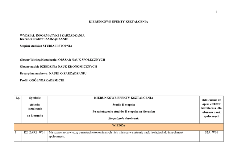 1 KIERUNKOWE EFEKTY KSZTAŁCENIA WYDZIAŁ INFORMATYKI I ZARZĄDZANIA Kierunek studiów: ZARZĄDZANIE Stopień studiów: STUDIA II STOPNIA Obszar Wiedzy/Kształcenia: OBSZAR NAUK SPOŁECZNYCH Obszar nauki: DZIEDZINA NAUK EKONOMICZNYCH Dyscyplina naukowa: NAUKI O ZARZĄDZANIU Profil: OGÓLNOAKADEMICKI Lp. Symbole KIERUNKOWE EFEKTY KSZTAŁCENIA efektów kształcenia Studia II stopnia na kierunku Po zakończeniu studiów II stopnia na kierunku Zarządzanie absolwent: Odniesienie do opisu efektów kształcenia dla obszaru nauk społecznych WIEDZA 1. K2_ZARZ_W01 Ma rozszerzoną wiedzę o naukach ekonomicznych i ich miejscu w systemie nauk i relacjach do innych nauk społecznych. S2A_W01 2 2. K2_ZARZ_W02 Ma rozszerzoną wiedzę z zakresu polityki gospodarczej jako elementu regulacji gospodarki – w skali krajowej, międzynarodowej i ugrupowań gospodarczych oraz integracyjnych. Zna przesłanki, rodzaje, kierunki i skutki ekonomiczno-prawne ewolucji rynków, struktur rynkowych i instytucji oraz ugrupowań gospodarczych i integracyjnych. S2A_W02 S2A_W07 S2A_W03 S2A_W08 3. K2_ZARZ_W03 Rozumie strategiczny kontekst funkcjonowania organizacji. Wyjaśnia wpływ globalnych uwarunkowań (w tym prawnych i ekonomicznych) na konkurencyjność organizacji oraz sprawność jej funkcjonowania. Zna istotę strategii organizacji. Ma wiedzę na temat istoty, etapów i metod zarządzania strategicznego. S2A_W02 S2A_W03 S2A_W06 S2A_W07 S2A_W08 S2A_W11 4. K2_ZARZ_W04 Ma pogłębioną wiedzę w zakresie teorii organizacji i zarządzania. Identyfikuje różne fazy rozwoju organizacji. Ma rozszerzoną wiedzę na temat współczesnych koncepcji zarządzania organizacją. S2A_W01 S2A_W02 S2A_W06 S2A_W08 S2A_W09 5. K2_ZARZ_W05 Rozumie strategiczne znaczenie zarządzania wiedzą w organizacji. Identyfikuje uwarunkowania, procesy i instrumenty zarządzania wiedzą w organizacji. 6. K2_ZARZ_W06 Rozumie złożoność i kompleksowość problemów merytorycznych i zarządczych w organizacji. Interpretuje współzależności wykraczające poza poszczególne funkcje, procesy i organizację. Ma rozszerzona wiedzę o systemie informacyjnym organizacji. S2A_W10 S2A_W07 S2A_W05 S2A_W02 S2A_W03 3 7. K2_ZARZ_W07 Zna zaawansowane metody pomiaru i oceny dokonań organizacji jako całości. Wyjaśnia podstawy i znaczenie procesów restrukturyzacyjnych: stabilizujących, rozwojowych i naprawczych w organizacji. S2A_W02 S2A_W06 S2A_W08 8. K2_ZARZ_W08 Ma rozszerzoną wiedzę w zakresie metod i technik wykorzystywanych w zarządzaniu. 9. K2_ZARZ_W09 Ma pogłębioną i rozszerzoną wiedzę merytoryczną i dotyczącą zarządzania w obszarach funkcjonalnych organizacji powiązanych ze studiowaną specjalnością*). 10. K2_ZARZ_W10 Charakteryzuje, wyjaśnia i interpretuje normy i standardy (prawne, organizacyjne, zawodowe, moralne i etyczne) właściwe dla obszarów funkcjonalnych organizacji powiązanych ze studiowaną specjalnością*). 11. K2_ZARZ_W11 Ma pogłębioną wiedzę na temat przywództwa, podejmowania decyzji, motywowania, mechanizmów grupowych i wpływu społecznego realizowanego w organizacji. Wskazuje zasady przeciwdziałania negatywnym zjawiskom indywidualnym i społecznym w organizacji. S2A_W06 S2A_W08 S2A_W02 S2A_W03 S2A_W06 S2A_W07 S2A_W01 S2A_W01 S2A_W04 S2A_W05 12. K2_ZARZ_W12 Ma rozszerzoną wiedzę na temat przedsiębiorczości. Wskazuje jej determinanty. Identyfikuje czynniki sprzyjające skuteczności indywidualnych i zespołowych zachowań przedsiębiorczych. S2A_W11 S2A_W05 13. K2_ZARZ_W13 Zna zasady budowy modeli ekonometrycznych i symulacyjnych. Ma specjalistyczną wiedzę w zakresie modelowania ilościowego i prognozowania stanów i procesów w organizacji. 14. K2_ZARZ_W14 Rozumie cele, mechanizmy funkcjonowania i charakterystyki zintegrowanych systemów informatycznych zarządzania. S2A_W06 T2A_W05 S2A_W06 T2A_W05 4 15. Lp. K2_ZARZ_W15 Osiąga dodatkowe efekty w kategorii wiedza dla jednej z następujących specjalności: 1) Zarządzanie procesami przedsiębiorstwa (zał.1.) 2) Inżynieria finansowa (zał.2.) 3) Technologie informacyjne w zarządzaniu (zał.3.) 4) Przedsiębiorczość, innowacje i projekty (zał.4.) 5) Zachowania i decyzje menedżerskie (zał.5.) 6) Business Information Systems (zał.6.) Symbole KIERUNKOWE EFEKTY KSZTAŁCENIA efektów kształcenia Studia II stopnia na kierunku Po zakończeniu studiów II stopnia na kierunku Zarządzanie absolwent: Odniesienie do opisu efektów kształcenia dla obszaru nauk społecznych UMIEJĘTNOSCI 1. K2_ZARZ_U01 Potrafi określić i analizować potencjalne efekty wprowadzanych regulacji ekonomiczno-prawnych krajowych i międzynarodowych dla poszczególnych organizacji, rynków i ugrupowań integracyjnych. Potrafi wykorzystywać do rozwiązywania problemów ekonomicznych i zarządczych rozbudowane modele struktur rynku. S2A_U01 S2A_U02 S2A_U03 S2A_U08 2. K2_ZARZ_U02 Potrafi analizować przyczyny i dynamikę zdarzeń i zjawisk w organizacji jako całości, w kontekście ich wewnętrznych i zewnętrznych uwarunkowań. Umie identyfikować, analizować i oceniać złożone problemy zarządcze i merytoryczne w organizacji. S2A_U01 S2A_U02 S2A_U03 S2A_U08 5 3. K2_ZARZ_U03 Potrafi wybierać źródła informacji i korzystać z nich przy rozwiązywaniu złożonych problemów zarządczych i merytorycznych w organizacji. S2A_U02 4. K2_ZARZ_U04 Potrafi dobierać, uzasadniać i stosować metody i techniki do identyfikacji, analizy i rozwiązywania złożonych problemów zarządczych i merytorycznych w organizacji. Potrafi dokonać krytycznej oceny przydatności metod i technik. S2A_U02 Umie posługiwać się specjalistycznymi systemami normatywnymi powiązanymi ze studiowaną specjalnością. Potrafi wybierać, adaptować, uzasadniać i stosować odpowiednie normy i standardy (prawne, zawodowe, moralne i etyczne) w konkretnych działaniach w organizacji*). Posiada umiejętność formułowania rozwiązania złożonych problemów zarządczych i merytorycznych w organizacji.