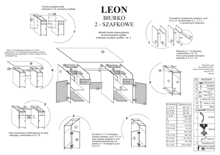 Od tyłu przybijamy płyty pilśniowe nr 14 i wsuwamy szuflady. LEON 14 BIURKO 2 - SZAFKOWE 14 7 Prowadnice przykręcamy wkrętami „euro” 6,3 x 13 do elementów nr 1, 2, 3, 4 w oznaczonych miejscach. Montaż biurka rozpoczynamy od zmontowania szuflad. Instrukcja montażu szuflad - str. 2. 4 1 Blat nr 13 przykręcamy wkrętami (4 x 30) do poprzeczek nr 12 i 9 jednakowo wysuwając go na boki. Uważajmy,aby nie wystawał on z przodu więcej niż 5 cm od krawędzi nóg. Elementy nr 1 i 2 skręcamy z elementami nr 5 i 12. W ten sam sposób montujemy elementy nr 3, 4, 5, 12. 13 13 6 9 14 9 1 Materiały użyte do produkcji mebla : - płyta wiórowa laminowana - obrzeże PCV - okleina 4 2 14 Szt. 2 6 6 Kołki drewniane 16 Zaślepka 40 8 9 . . . . . . . . . . . . . . . . . . . . . . 4 3 . . . . . . . . Nr elementu 8 12 Wkręt 3,5 x 16 18 Wkręt 4 x 30 1, 2, 3, 4 45 x 73 8 Bolec 5 x 2 szt. 6 x 2 szt. 45 x 33 40 x 33 26 Konfirmat 7, 8 szt. 9 53,5 x 36 10 x 45 10 17,5 x 45 11 x 2 szt. 4 Obie zmontowane szafki łączymy ze sobą skręcając z elementami nr 9 i 10. 12 x 4 szt 13 Do drzwi nr 7 i 8 montujemy zawiasy wkrętami „euro” 5 x 13 oraz uchwyty wkrętami 4 x 30. Kompletne przykręcamy do boków nr 1 i 4 wkrętami „euro” 6,3 x 13. Wymiary w cm Gwóźdź Wkręt „euro” 6,3 x 13 Wkręt „euro” 5 x 13 16 5 AKCESORIA 12 14 x 2 szt. 4 Uchwyt 14 x 36 8 x 33 4 Zawias 124 x 60 69 x 36 A x 2 szt. 10 x 30,4 B x 4 szt. 10 x 38 C x 2 szt. 30,4 x 40,5 1 2 4 Kluczyk Prowadnica 40 Mimośród i trzpień mimośrodu B 11 Rys.4 Rys.2 A Rys.1 A B A Rys.2 B B Montaż Szuflady Montaż biurka rozpoczynamy od zmontowania szuflady. Kołki drewniane wciskamy w wywiercone otwory w elemencie A (rys.1). Skręcamy elementy B i A konfirmatami (rys.2). Od dołu mocujemy dno szuflady gwózdkami - boki szuflady i tył ustawiamy wzdłuż krawędzi pilśni (rys.3). Do frontu szuflady przykręcamy uchwyt , wkręcamy trzpienie mimośrodu.i wciskamy drewniane kołki (rys.4). Skręcamy przygotowane elementy mimośrodami. Od spodu montujemy prowadnice. C 11 Rys.3 C A B Zachować przez okres jednego roku ZASADY UŻYTKOWANIA MEBLI Karta gwarancyjna bez potwierdzenia sprzedaży oraz dowodu zakupu jest nieważna. Typ 1. MEBLE POWINNY BYĆ UŻYTKOWANE ZGODNIE Z ICH INSTRUKCJĄ I PRZEZNACZENIEM. 2. MEBLE NALEŻY UŻYTKOWAĆ W POMIESZCZENIACH SUCHYCH, ZAMKNIĘTYCH I ZABEZPIECZONYCH PRZED SZKODLIWYMI WPŁYWAMI ATMOSFERYCZNYMI ORAZ BEZPOŚREDNIM DZIAŁANIEM PROMIENI SŁONECZNYCH. TEMPERATURA POWIETRZA W POMIESZCZENIACH POWINNA MIEŚCIĆ SIĘ W GRANICACH 10-30 C, A WILGOTNOŚĆ WZGLĘDNA W GRANICACH25-80 %. MEBLI NIE NALEŻY USTAWIAĆ W ODLEGŁOŚCI MNIEJSZEJ NIŻ PÓŁ METRA OD CZYNNYCH GRZEJNIKÓW. 3. WYMAGANE JEST RÓWNE- WYPOZIOMOWANE USTAWIENIE MEBLI NA STABILNYM PODŁOŻU. 4. SPOSÓB MONTAŻU MEBLI, ILOŚĆ ELEMENTÓW I AKCESORIÓW NIEZBĘDNYCH DO MONTAŻU, OKREŚLA KARTA INFORMACYJNA ZNAJDUJĄCA SIĘ W OPAKOWANIU DANEGO TYPU MEBLA. 5. MEBLE CHRONIĆ PRZED NIEUZASADNIONYMI USZKODZENIAMI MECHANICZNYMI, KTÓRE MOGĄ BYĆ SPOWODOWANE NP. SIADANIEM NA BLAT LUB WYSUWANE PÓŁKI, PODNOSZENIEM - PRZESUWANIEM MEBLA CIĄGNĄC ZA BLAT LUB SZUFLADĘ ITP. 6. NA POWIERZCHNIACH MEBLI NIE NALEŻY STAWIAĆ PRZEDMIOTÓW WILGOTNYCH LUB GORĄCYCH. MARTIGO PLUS Wypełnia sprzedawca Wybarwienie i rodzaj powierzchni Pieczęć i podpis sprzedawcy WARUNKI GWARANCJI Data i nr dowodu sprzedaży Gatunek Nazwa wyrobu Karta gwarancyjna nr .......... Mirosław Węgrzyn Czarny Las, ul. Częstochowska 50 42-233 Mykanów NIP: 573-020-20-55 1. 2. 3. 4. 5. 6. 7. 8. 9. 10. 11. 12. 13. 14. 15. 16. 17. ZASADY KONSERWACJI MEBLI BIURKO 2 - SZAFKOWE Gwarant zapewnia Kupującemu dobrą jakość i prawidłowe funkcjonowanie mebla przez okres 12 miesięcy od daty wydania mebli Kupującemu. Ochrona gwarancyjna obejmuje teren Rzeczpospolitej Polskiej. Kupujący przy zakupie wyrobu powinien dokonać sprawdzenia jakości i kompletności wyrobu oraz sprawdzenia funkcjonowania głównych mechanizmów i podstawowych podzespołów. Ochroną gwarancyjną nie są objęte uszkodzenia powstałe w wyniku niewłaściwego bądź nieostrożnego przewozu, przenoszenia lub montażu wyrobu, jak również wynikłe ze zdarzeń losowych oraz uszkodzenia w wyniku których obniżono cenę wyrobu zgodnie z pkt. 16 niniejszej karty. Widoczne wady, uszkodzenia mechaniczne i braki ilościowe elementów i okuć w meblach sprzedawanych jako zmontowane kupujący ma obowiązek zgłosić w momencie zakupu - w przeciwnym razie ochrona gwarancyjna nie obowiązuje. Przeróbki mebli we własnym zakresie powodują utratę ochrony gwarancyjnej. Gwarant nie odpowiada za niezgodności wyrobu z umową, gdy Kupujący o tej niezgodności wiedział lub oceniając rozsądnie powinien był wiedzieć. O niezgodności wyrobu - do montażu we własnym zakresie - z umową Kupujący musi powiadomić Sprzedawcę w ciągu 7 dni od chwili jej stwierdzenia, nie później jednak niż 30 dni od daty odebrania mebla. Powstałe w okresie gwarancyjnym niezgodności lub awarie wyrobu należy zgłosić w punkcie zakupu wyrobu , przedstawiając kartę gwarancyjną i dokument zakupu.Sprzedawca w terminie 14 dni od zgłoszenia o niezgodności wyrobu z umową ustosunkuje się. Jeżeli tego nie uczyni, oznacza to, że uznał je za uzasadnione. Naprawy gwarancyjne wyrobu niezgodnego z umową wykonywane będą przez przedstawiciela Gwaranta w terminie do 30 dni roboczych od daty otrzymania zgłoszenia niezgodności ze sklepu, w którym dokonano zakupu. Okres gwarancji zostanie przedłużony o czas, który upłynie od momentu zgłoszenia reklamacji do jej załatwienia, jeżeli w tym okresie niezgodności uniemożliwiały użytkowanie wyrobu. W przypadku, gdy wyrób jest niezgodny z umową Gwarant zapewnia Kupującemu doprowadzenie go do stanu zgodnego z umową przez naprawę lub wymianę części. O sposobie i miejscu naprawy wyrobu decyduje przedstawiciel Gwaranta. Jeżeli charakter wady nie wymaga jej usuwania w warunkach fabrycznych