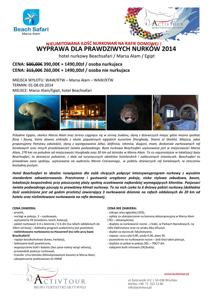 WYPRAWA DLA PRAWDZIWYCH NURKÓW 2014 hotel nurkowy Beachsafari / Marsa Alam / Egipt CENA: 500,00€ 390,00€ + 1490,00zł / osoba nurkujaca CENA: 315,00€ 260,00€ + 1490,00zł / osoba nie nurkujaca MIEJSCA WYLOTU: WAW/KTW – Marsa Alam – WAW/KTW TERMIN: 01-08.03.2014 MIEJSCE: Marsa Alam/Egipt, hotel Beachsafari Południe Egiptu, okolice Marsa Alam oraz tereny ciągnące się w stronę Sudanu, słyną z dziewiczych miejsc gdzie można spotkać florę i faunę, która dawno zniknęła z okolic popularnych egipskich kurortów (Hurghady, Sharm el Sheikh). Miejsca, jakie proponujemy Państwu odwiedzić, słyną z występowania żółwi, delfinów, rekinów, diugoni, mant, doskonale zachowanych raf koralowych oraz innych przedstawicieli świata podwodnego. Baza nurkowa Beachsafari usytuowana jest w miejscowości Marsa Alam, 270 km na południe od miejscowości Hurghada oraz 30 km od lotniska w Marsa Alam. To co najcenniejsze w lokalizacji bazy Beachsafari, to dziewicze położenie, z dala od turystycznych obiektów hotelarskich i zatłoczonych miasteczek. Beachsafari to prawdziwa oaza spokoju, usytuowana na wybrzeżu Morza Czerwonego, w pobliżu dziewiczych raf koralowych, w otoczeniu bezludnej pustyni. Hotel Beachsafari to idealne rozwiązanie dla osób chcących połączyć intensywnyprogram nurkowy z wysokim standardem zakwaterowania. Przestronne i gustownie urządzone pokoje, niska stylowa zabudowa, basen, lokalizacja bezpośrednio przy piaszczystej plaży spełnią oczekiwania najbardziej wymagających klientów. Pasjonaci świata podwodnego poczują tu prawdziwy klimat nurkowy. To na nich czeka tu 6 dniowy pakiet nurkowy (dokładna ilość uzależniona jest od godzin przelotu) zawierający 3 nurkowania dziennie na rafach oddalonych do 20 km od hotelu oraz nielimitowane nurkowania na rafie domowej. CENA ZAWIERA: CENA NIE ZAWIERA: - przelot, - noclegi w pokoju: 2 – osobowym, - wyżywienie FB (śniadania, lunch, kolacja), - pakiet nurkowań 3-4 x dziennie / 5-6 dni (na rafach oddalonych do 20km od bazy) – dokładny program uzależniony jest przelotem, - nielimitowane nurkowania na Hausereef (na rafie przy bazie Beachsafari)! - napoje bezalkoholowe (kawa, herbata), - ładowanie butli powietrzem, - wypożyczenie butli i balastu (bez pasa-należy wziąć własny), - przewodnik podczas nurkowań, - transfer z/na lotnisko (klimatyzowanym busem) w Marsa Alam, - ubezpieczenie podstawowe KL+NNW - zakupu wizy egipskiej (25$), - opłaty za ubezpieczenie na komorę dekompresyjną w Marsa Alam (7€) – obowiązkowe, - dopłaty za nurkowanie nocne , z łodzi, w Parkach Narodowych, na rafie Elphinstone oraz na wraku Abu Ghusun. - dopłat za wycieczki fakultatywne, - napoje: coca-cola 0,4€, woda 0,3€, piwo 3€. - pozwolenie na nurkowanie nocne – jeśli ktoś takie planuje, - dopłata za pobyt w pokoju SGL – 70€/7 dni - nabijanie butli nitroxem (5€/butla). RAMOWY PROGRAM IMPREZY*: Dzień 1 – Dzień wylotu: Zbiórka na lotniku na 2,5 godziny przed wylotem Wylot do Marsa Alam Transfer z lotniska do hotelu (ok. 40min z Marsa Alam) Zakwaterowanie w pokojach, Śniadanie, czas wolny Zapoznanie z bazą, omówienie szczegółów, przygotowanie sprzętu nurkowego Obiad Kolacja Czas wolny Dzień 2 - 6: 1 nurkowanie (ok. 7:00 rano) Śniadanie 2 nurkowania Lunch Nurkowania bez limitu na Hause Reef☺ Kolacja Czas wolny (ew. nurkowanie nocne) Dzień 7: 1 nurkowanie (ok. 7:00 rano) – jeśli pozwolą na to godziny przelotu (zakaz nurkowania na 24h przed lotem!) Śniadanie 2 nurkowanie – jeśli pozwolą na to godziny przelotu (zakaz nurkowania na 24h przed lotem!) Lunch Kolacja Czas wolny. Dzień 8 – Dzień wyjazdu: Śniadanie Czas wolny Wykwaterowanie Transfer na lotnisko Wylot do Polski Zakończenie imprezy * - dokładny czas pobytu oraz program uwarunkowany jest godzinami i rozkładem przelotów ZAKATEROWANIE: Zakwaterowanie w bardzo komfortowych, klimatyzowanych pokojach wyopsażonych w podwójne lub pojedyncze łóżka, toaletkę, łazienkę z prysznicem, umywalką, suszarką oraz wc. Hotel zaprojektowany jest w stylu egipskim, którego niezwykle wyszukana i stylowa architektura z uroczymi detalami i dekoracjami tworzy bardzo klimat. Biały fasada hotelu połączona z niebieskimi drzwiami idealnie współgra ze złotym piakiem pustyni, turkusową wodą Morza Czerwonego oraz zielenią palm i różem kwiatów. Każdy pokój posiada mały taras, a wewnątrz hotelowego terenu znajduje się piękny basen, gdzie pomiędzy nurkowaniami – można oddawać się chwilą relaksu… DODATKOWE ATRAKCJE NURKOWE OPIS Wrak Abu Ghusun: 2 nurkowania na pakistańskim wraku Abu Ghusun, położonym w odległości 80km od bazy Beachsafari (na południe). Wrak położony jest na niewielkiej głębokości – stosunkowo łatwe nurkowanie! Abu Dabbab: 2 nurkowania z piaszczystej plaży. Istnieje duża szansa na spotkanie mieszkającej tu krowy morskiej. Niezwykła atrakcja, wspaniałe przeżycie! Gabel Rosas: 2 nurkowania. Jest idealne do wprowadzania do nurkowania jaskiniowego i organizacji kursów. Zimą spotkać tu można koniki morskie :) Elphinstone reef: 2 nurkowania na jednej z najsłynniejszych raf regionu. Istnieją duże szanse na spotkanie rekina ! Wymagania: 50 odbytych nurkowań + min. uprawnienia AOWD Dolphinhouse Reef: Całodzienna wyprawa łodzią na rafę Dolphinhouse, gdzie szczęściarze będą mieli okazję popływać w towarzystwie delfinów. Cena zawiera: pozwolenie wstępu na teren parku. Marsa Alam Reef: Całodzienna wyprawa łodzią na 2 nurkowania na rafie Marsa Alam. Cena zawiera: lunch na łodzi. Nurkowanie nocne ILOŚĆ OSÓB CENA min 4 25,00 € min 2 10,00 € min 2 5,00 € min 4 50,00 € min 2 60,00 € min 2 min 2 45,00 € 15,00 € min 4 220,00 € Pakiet specjalny: Discover Marsa Alam ! Specjalny pakiet dla podwodnych turystów, pragnących maksymalnie wykorzystać czas poświęcony na poznanie wszystkich najciekawszych zakątków raf regionu Marsa Alam. Cena zawiera: -