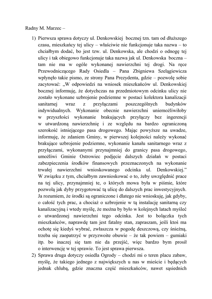 Radny M. Marzec – 1) Pierwsza sprawa dotyczy ul. Denkowskiej bocznej tzn. tam od dłuższego czasu, mieszkańcy tej ulicy – właściwie nie funkcjonuje taka nazwa – to chciałbym dodać, bo jest tzw. ul. Denkowska, ale chodzi o odnogę tej ulicy i tak obiegowo funkcjonuje taka nazwa jak ul. Denkowska boczna – tam nie ma w ogóle wykonanej nawierzchni tej drogi. Na ręce Przewodniczącego Rady Osiedla – Pana Zbigniewa Szelągiewicza wpłynęło takie pismo, ze strony Pana Prezydenta, gdzie – pozwolę sobie zacytować: „W odpowiedzi na wniosek mieszkańców ul. Denkowskiej bocznej informuję, że dotychczas na przedmiotowym odcinku ulicy nie zostało wykonane uzbrojenie podziemne w postaci kolektora kanalizacji sanitarnej wraz z przyłączami poszczególnych budynków indywidualnych. Wykonanie obecnie nawierzchni uniemożliwiłoby w przyszłości wykonanie brakujących przyłączy bez ingerencji w utwardzoną nawierzchnię i ze względu na bardzo ograniczoną szerokość istniejącego pasa drogowego. Mając powyższe na uwadze, informuję, że zdaniem Gminy, w pierwszej kolejności należy wykonać brakujące uzbrojenie podziemne, wykonanie kanału sanitarnego wraz z przyłączami, wykonanymi przynajmniej do granicy pasa drogowego, umożliwi Gminie Ostrowiec podjęcie dalszych działań w postaci zabezpieczenia środków finansowych przeznaczonych na wykonanie trwałej nawierzchni wnioskowanego odcinka ul. Denkowskiej.” W związku z tym, chciałbym zawnioskować o to, żeby uwzględnić prace na tej ulicy, przynajmniej te, o których mowa była w piśmie, które pozwolą jak dyby przygotować tą ulicę do dalszych prac inwestycyjnych. Ja rozumiem, że środki są ograniczone i dlatego nie wnioskuję, jak gdyby, o całość tych prac, a chociaż o uzbrojenie w tą instalację sanitarną czy kanalizacyjną i wtedy myślę, że można by było w kolejnych latach myśleć o utwardzonej nawierzchni tego odcinka. Jest to bolączka tych mieszkańców, naprawdę tam jest fatalny stan, zapraszam, jeśli ktoś ma ochotę się kiedyś wybrać, zwłaszcza w pogodę deszczową, czy śnieżną, trzeba się zaopatrzyć w przyzwoite obuwie – że tak powiem – gumiaki itp. bo inaczej się tam nie da przejść, więc bardzo bym prosił o interwencję w tej sprawie. To jest sprawa pierwsza. 2) Sprawa druga dotyczy osiedla Ogrody – chodzi mi o teren placu zabaw, myślę, że takiego jednego z największych u nas w mieście i będących jednak chlubą, gdzie znaczna część mieszkańców, nawet sąsiednich osiedli przychodzi z własnymi pociechami na ten plac. To wielokrotnie sprawa monitoringu była poruszana, ja wiem, że póki monitoring, centrum monitoringu nie zostanie zrobione, jak gdyby gminne, to wykonanie tego monitoringu jest na tym placu dość skomplikowane, dlatego jako coś w rodzaju tymczasowego rozwiązania, ale również wpływającego na poprawę jakości bezpieczeństwa mieszkańców, chciałbym zasugerować zamontowanie lampy cztero albo sześcioramiennej w centrum tego placu. Nadmieniam, że taka lampa istniała i mieszkańcy zwracali się, tego naszego osiedla Ogrody, wielokrotnie do Rady Osiedla w interwencji w tej sprawie. Myślę, że nie byłby to wygórowany koszt, a wpłynęłoby to znacząco na poprawę i nie tylko walorów bezpieczeństwa, ale myślę, że i estetyki. A pod kątem przyszłego monitoringu, myślę, że również poprawiłoby jakość funkcjonowanie tego monitoringu, bo będą uliczki doświetlone, więc myślę, że też w porze nocnej ten monitoring będzie później w przyszłości lepiej funkcjonował. 3) Trzecia interpelacja dotyczy spraw związanych z przedsiębiorcami funkcjonującymi u nas tutaj w okolicy ul. Okólnej przy Rynku. Zwróciła się do mnie grupa przedsiębiorców od strony – że tak powiem – południowej części czyli gdzie mamy – powiedzmy – pizzerię, sklep obuwniczy czy bank Credit Agricole – przepraszam, ze wymieniłem akurat ten, ale po prostu tam jest. Chodzi o tamten po prostu odcinek sklepów. Tam mamy często do czynienia z takimi sytuacjami, że osoby spożywające alkohol z pobliskiego sklepu monopolowego niestety zakłócają dosyć mocno jak gdyby kulturę handlu w tym miejscu, w dni deszczowe chowają się pod zadaszeniami albo pod balkonami, które są wzdłuż tych sklepów i uniemożliwiają wejście lub wręcz odstraszają klientów tych sklepów do wejścia i skorzystania po prostu z ich oferty. Osoby, które tam pracują, tez troszeczkę się obawiają o własne bezpieczeństwo bo było tam kilka incydentów. I teraz moje pytanie brzmi – czy można zwiększyć patrole Straży Miejskiej w tych okolicach albo ewentualnie zrobić coś z monitoringiem, gdyż – z tego, co się udało mi się ustalić – być może się mylę – ale ten monitoring jest jak gdyby skierowany na plac, na nasz Rynek, natomiast nie jest jak gdyby skierowany w stronę tych sklepików. Myślę, że gdyby dało się – że tak powiem – jakoś to obrotowo zrobić – być może tak się da, a być może nie da się tego zrobić, no to wtedy prosiłbym o zaradzenie jakoś, choćby zwiększając liczbę patroli w tamtej okolicy, co – myślę, że w jakiś sposób wpłynęłoby na poprawę bezpieczeństwa.