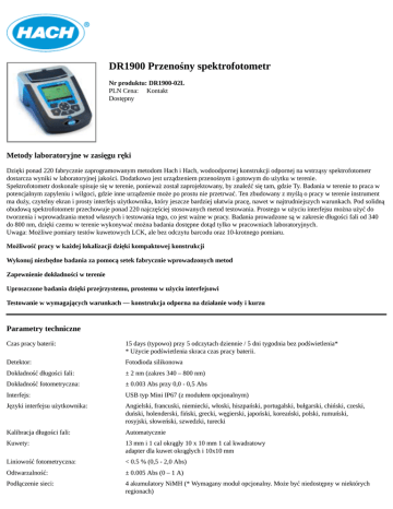 DR1900 Przenośny spektrofotometr Nr produktu: DR1900-02L PLN Cena: Kontakt Dostępny Metody laboratoryjne w zasięgu ręki Dzięki ponad 220 fabrycznie zaprogramowanym metodom Hach i Hach, wodoodpornej konstrukcji odpornej na wstrząsy spektrofotometr dostarcza wyniki w laboratoryjnej jakości. Dodatkowo jest urządzeniem przenośnym i gotowym do użytku w terenie. Spektrofotometr doskonale spisuje się w terenie, ponieważ został zaprojektowany, by znaleźć się tam, gdzie Ty. Badania w terenie to praca w potencjalnym zapyleniu i wilgoci, gdzie inne urządzenie może po prostu nie przetrwać. Ten zbudowany z myślą o pracy w terenie instrument ma duży, czytelny ekran i prosty interfejs użytkownika, który jeszcze bardziej ułatwia pracę, nawet w najtrudniejszych warunkach. Pod solidną obudową spektrofotometr przechowuje ponad 220 najczęściej stosowanych metod testowania. Prostego w użyciu interfejsu można użyć do tworzenia i wprowadzania metod własnych i testowania tego, co jest ważne w pracy. Badania prowadzone są w zakresie długości fali od 340 do 800 nm, dzięki czemu w terenie wykonywać można badania dostępne dotąd tylko w pracowniach laboratoryjnych. Uwaga: Możliwe pomiary testów kuwetowych LCK, ale bez odczytu barcodu oraz 10-krotnego pomiaru. Możliwość pracy w każdej lokalizacji dzięki kompaktowej konstrukcji Wykonuj niezbędne badania za pomocą setek fabrycznie wprowadzonych metod Zapewnienie dokładności w terenie Uproszczone badania dzięki przejrzystemu, prostemu w użyciu interfejsowi Testowanie w wymagających warunkach — konstrukcja odporna na działanie wody i kurzu Parametry techniczne Czas pracy baterii: 15 days (typowo) przy 5 odczytach dziennie / 5 dni tygodnia bez podświetlenia* * Użycie podświetlenia skraca czas pracy baterii. Detektor: Fotodioda silikonowa Dokładność długości fali: ± 2 nm (zakres 340 – 800 nm) Dokładność fotometryczna: ± 0.003 Abs przy 0,0 - 0,5 Abs Interfejs: USB typ Mini IP67 (z modułem opcjonalnym) Języki interfejsu użytkownika: Angielski, francuski, niemiecki, włoski, hiszpański, portugalski, bułgarski, chiński, czeski, duński, holenderski, fiński, grecki, węgierski, japoński, koreański, polski, rumuński, rosyjski, słoweński, szwedzki, turecki Kalibracja długości fali: Automatycznie Kuwety: 13 mm i 1 cal okrągły 10 x 10 mm 1 cal kwadratowy adapter dla kuwet okrągłych i 10x10 mm Liniowość fotometryczna: < 0.5 % (0,5 - 2,0 Abs) Odtwarzalność: ± 0.005 Abs (0 – 1 A) Podłączenie sieci: 4 akumulatory NiMH (* Wymagany moduł opcjonalny. Może być niedostępny w niektórych regionach) Programy użytkownika: 50 Rodzaj baterii: 4 baterie alkaliczne AA Stopień ochrony: IP67 Światło rozproszone: < 0,1 %T przy 340 nm z NaNO2 System optyczny: Wiązka odniesienia, spektralne Tryb pauzy: 4 baterie AA alkaliczne 4 akumulatorki NiMH* Zasilanie*: 110-240 V; 50/60 Hz (* wymagany moduł opcjonalny. Może być niedostępny w niektórych regionach) Tryb pracy: Transmitancja (%), absorbancja i koncentracja Waga: 1.5 kg Warunki pracy: 10 - 40 °C (50 - 104 °F), maks. 80% wilgotności względnej (bez kondensacji) Warunki przechowywania: -30 - 60 °C (-30 - 140°F), maks. 80% wilgotności względnej (bez kondensacji) Warunki środowiskowe: temperatura: 10 - 40 °C Warunki środowiskowe: wilgotność: maks. 80 % wilgotność względna (bez kondensacji) Wstępnie zaprogramowane metody: 220 (Uwaga: Możliwe pomiary testów kuwetowych LCK, ale bez odczytu barcodu oraz 10krotnego pomiaru.) Wybór długości fali: Automatycznie Wymiary (wys. x szer. x głęb.): 98 mm x 178 mm x 267 mm Wyświetlacz: Wyświetlacz graficzny 240 x 160 pixel (LCD, cz.-b., podświetlenie) Zakres długości fali: 340 – 800 nm Zakres fotometryczny: 0 - 3 Abs (zakres długości fali 340-800 nm) Zakres temperatury: 0 – 50 °C (32 – 122 °F) Zakres zasilania: Instrukcja drukowana, płyta CD instrukcją i procedurami w wielu językach (PDF). Zestaw adapterów w pudełku. Opakowanie 4 baterii typu AA. Osłona przeciwpyłowa Zapis danych: 500 zmierzone wartości (wynik, data, czas, ID próbki, ID użytkownika zgodnie z GLP) Zgodność kuwetowa: 10 mm kwadratowych / 1 cal kwadratowy i 13 mm / 1 cal okrągły Product details pdf footer