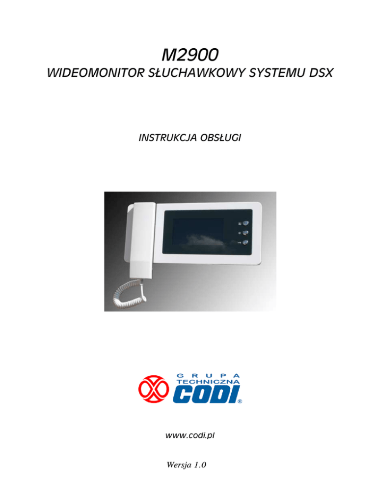 M2900 WIDEOMONITOR SŁUCHAWKOWY SYSTEMU DSX INSTRUKCJA OBSŁUGI www.codi.pl Wersja 1.0 1. Układ klawiatury i regulacji Monitor zawiera trzy przyciski sterujące na przedniej stronie oraz trzy pokrętła regulacyjne na spodniej stronie obudowy. Przyciski od góry to : portier podgląd otwarcie drzwi Regulacje od dołu od lewej strony : - regulacja głośności sygnału wywołania - regulacja jaskrawości obrazu - regulacja nasycenia barw obrazu Po lewej stronie pokręteł znajduje się wyłącznik zasilania monitora. Po załączeniu zasilania zielona dioda na płycie czołowej monitora rozpocznie cykliczne mruganie. Należy pamiętać, iż dla prawidłowej pracy monitora, musi on pozostawać w stanie załączenia (zielona dioda sygnalizuje ten stan). 2. Odbieranie połączenia W momencie wywołania monitor rozpocznie wysyłanie sygnału zewu, a na ekranie pojawi się obraz z panelu zewnętrznego, z którego wywołanie zostało dokonane. Odebranie połączenia dokonuje się poprzez podniesienie mikrotelefonu monitora. 3. Otwarcie drzwi lub bramy W trakcie odebranego połączenia przycisnąć przycisk nastąp i o t w arc i e d rz w i w e jśc i o wych do budynku/osiedla. Jeśli zostanie naciśnięty przycisk podglądu wjazdowej. Strona 2 Wersja 1.0 wó w c z a s n a st ą p i akt ywacja otwarcia bramy 4. Podgląd Tę funkcję aktywujemy w następujący sposób : - podnieść mikrotelefon - jeśli występuje brak jakiegokolwiek sygnału, oznacza to, że linia wizji jest zajęta i należy poczekać - jeśli sygnał jest, należy nacisnąć przycisk inicjacji podglądu - wyłączenie nastąpi bądź po upływie określonego czasu lub z chwilą odłożenia mikrotelefonu 5. Wywołanie portiera Podnieść słuchawkę jak w p. 4 i jeśli sygnał jest słyszalny (linia rozmówna wolna), wówczas nacisnąć przycisk wywołania portiera i czekać na jego zgłoszenie. Jeśli portier nie odbierze i nastąpi automatyczne rozłączenie, wówczas należy pamiętać, iż fakt ten został w panelu operacyjnym portiera zarejestrowany i portier z chwilą gdy będzie mógł, oddzwoni. Wywołanie ze strony portiera odbieramy analogiczne jak normalne wywołanie ze strony centrali zewnętrznej. 6. Informacje instalacyjne Monitor na tylnej stronie obudowy posiada gniazdo rozłączalnej listwy zaciskowej, do której należy podłączyć przewody kabla wiodącego od komutatora M2741 z magistrali pionowej budynku. Widok tylnej ścianki obudowy pokazuje poniższy obrazek. Znaczenie poszczególnych zacisków (sygnały z M2741) : LR - linia rozmówna +18V - zasilanie monitora z linii (dodatni biegun) LV - linia sygnału wizyjnego LZ - linia sygnału cyfrowego DZ - dzwonek do drzwi --- - zaciski bieguna ujemnego zasilania Włącznik dzwonka drzwi wejściowych łączymy z zaciskami oznaczonymi DZ i “-“. Do pozostałych zacisków doprowadzamy przewody kabla prowadzącego od gniazda komutatora wizyjno-rozmównego M2741 oznaczone w taki sam sposób w instrukcji instalacyjnej systemu DSX. Należy pamiętać, by parę LV i “masa” poprowadzić przewodami skręconymi w jedną parę, a nie przewodami z różnych par. Wersja 1.0 Strona 3