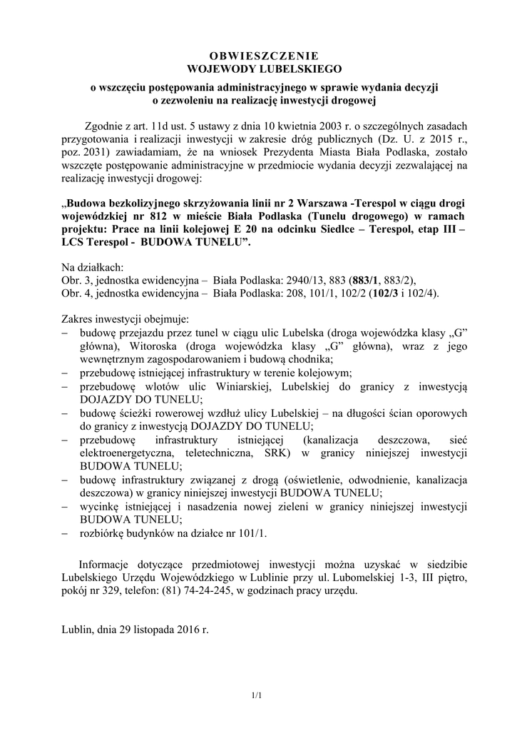 OBWIESZCZENIE WOJEWODY LUBELSKIEGO o wszczęciu postępowania administracyjnego w sprawie wydania decyzji o zezwoleniu na realizację inwestycji drogowej Zgodnie z art. 11d ust. 5 ustawy z dnia 10 kwietnia 2003 r. o szczególnych zasadach przygotowania i realizacji inwestycji w zakresie dróg publicznych (Dz. U. z 2015 r., poz. 2031) zawiadamiam, że na wniosek Prezydenta Miasta Biała Podlaska, zostało wszczęte postępowanie administracyjne w przedmiocie wydania decyzji zezwalającej na realizację inwestycji drogowej: „Budowa bezkolizyjnego skrzyżowania linii nr 2 Warszawa -Terespol w ciągu drogi wojewódzkiej nr 812 w mieście Biała Podlaska (Tunelu drogowego) w ramach projektu: Prace na linii kolejowej E 20 na odcinku Siedlce – Terespol, etap III – LCS Terespol - BUDOWA TUNELU”. Na działkach: Obr. 3, jednostka ewidencyjna – Biała Podlaska: 2940/13, 883 (883/1, 883/2), Obr. 4, jednostka ewidencyjna – Biała Podlaska: 208, 101/1, 102/2 (102/3 i 102/4). Zakres inwestycji obejmuje: budowę przejazdu przez tunel w ciągu ulic Lubelska (droga wojewódzka klasy „G” główna), Witoroska (droga wojewódzka klasy „G” główna), wraz z jego wewnętrznym zagospodarowaniem i budową chodnika; przebudowę istniejącej infrastruktury w terenie kolejowym; przebudowę wlotów ulic Winiarskiej, Lubelskiej do granicy z inwestycją DOJAZDY DO TUNELU; budowę ścieżki rowerowej wzdłuż ulicy Lubelskiej – na długości ścian oporowych do granicy z inwestycją DOJAZDY DO TUNELU; przebudowę infrastruktury istniejącej (kanalizacja deszczowa, sieć elektroenergetyczna, teletechniczna, SRK) w granicy niniejszej inwestycji BUDOWA TUNELU; budowę infrastruktury związanej z drogą (oświetlenie, odwodnienie, kanalizacja deszczowa) w granicy niniejszej inwestycji BUDOWA TUNELU; wycinkę istniejącej i nasadzenia nowej zieleni w granicy niniejszej inwestycji BUDOWA TUNELU; rozbiórkę budynków na działce nr 101/1. Informacje dotyczące przedmiotowej inwestycji można uzyskać w siedzibie Lubelskiego Urzędu Wojewódzkiego w Lublinie przy ul. Lubomelskiej 1-3, III piętro, pokój nr 329, telefon: (81) 74-24-245, w godzinach pracy urzędu. Lublin, dnia 29 listopada 2016 r. 1/1