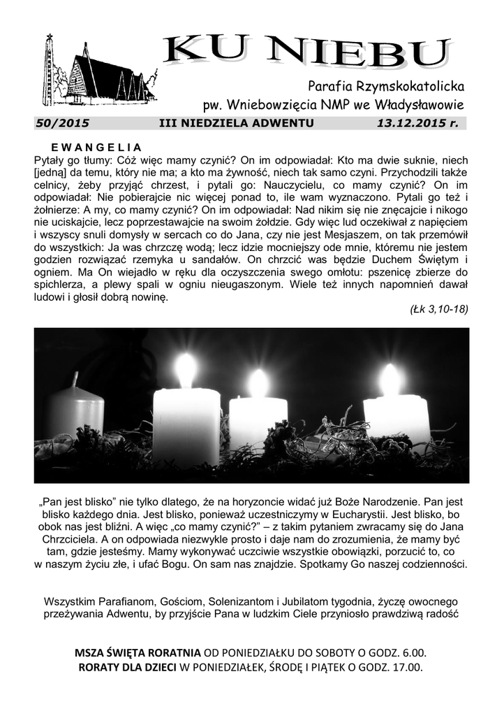 Parafia Rzymskokatolicka pw. Wniebowzięcia NMP we Władysławowie 50/2015 III NIEDZIELA ADWENTU 13.12.2015 r. EWANGELIA Pytały go tłumy: Cóż więc mamy czynić? On im odpowiadał: Kto ma dwie suknie, niech [jedną] da temu, który nie ma; a kto ma żywność, niech tak samo czyni. Przychodzili także celnicy, żeby przyjąć chrzest, i pytali go: Nauczycielu, co mamy czynić? On im odpowiadał: Nie pobierajcie nic więcej ponad to, ile wam wyznaczono. Pytali go też i żołnierze: A my, co mamy czynić? On im odpowiadał: Nad nikim się nie znęcajcie i nikogo nie uciskajcie, lecz poprzestawajcie na swoim żołdzie. Gdy więc lud oczekiwał z napięciem i wszyscy snuli domysły w sercach co do Jana, czy nie jest Mesjaszem, on tak przemówił do wszystkich: Ja was chrzczę wodą; lecz idzie mocniejszy ode mnie, któremu nie jestem godzien rozwiązać rzemyka u sandałów. On chrzcić was będzie Duchem Świętym i ogniem. Ma On wiejadło w ręku dla oczyszczenia swego omłotu: pszenicę zbierze do spichlerza, a plewy spali w ogniu nieugaszonym. Wiele też innych napomnień dawał ludowi i głosił dobrą nowinę. (Łk 3,10-18) „Pan jest blisko” nie tylko dlatego, że na horyzoncie widać już Boże Narodzenie. Pan jest blisko każdego dnia. Jest blisko, ponieważ uczestniczymy w Eucharystii. Jest blisko, bo obok nas jest bliźni. A więc „co mamy czynić?” – z takim pytaniem zwracamy się do Jana Chrzciciela. A on odpowiada niezwykle prosto i daje nam do zrozumienia, że mamy być tam, gdzie jesteśmy. Mamy wykonywać uczciwie wszystkie obowiązki, porzucić to, co w naszym życiu złe, i ufać Bogu. On sam nas znajdzie. Spotkamy Go naszej codzienności. Wszystkim Parafianom, Gościom, Solenizantom i Jubilatom tygodnia, życzę owocnego przeżywania Adwentu, by przyjście Pana w ludzkim Ciele przyniosło prawdziwą radość MSZA ŚWIĘTA RORATNIA OD PONIEDZIAŁKU DO SOBOTY O GODZ. 6.00. RORATY DLA DZIECI W PONIEDZIAŁEK, ŚRODĘ I PIĄTEK O GODZ. 17.00. ROZPOCZĘCIA JUBILEUSZU ROKU MIŁOSIERDZIA Papież Franciszek 8 grudnia w Watykanie rozpoczął Nadzwyczajny Jubileusz Miłosierdzia. Z okazji Roku Miłosierdzia Ks. Arcybiskup Metropolita wydał dekret o możliwości uzyskania odpustu zupełnego wyznaczył 15 kościołów stacyjnych na Rok Miłosierdzia. W gablocie przed kościołem można się zapoznać z warunkami uzyskania odpustów oraz z listą kościołów stacyjnych. SPOWIEDŹ W TRZECIM TYGODNIU ADWENTU Spowiedź w czasie rorat, wieczorem od poniedziałku do soboty od godz. 16:00 do 17:30; Całodzienna spowiedź będzie miała miejsce w poniedziałek 21 grudnia. ADORACJA NAJŚWIĘTSZEGO SAKRAMENTU W tym czasie adwentowego oczekiwania zapraszamy przez cały tydzień od poniedziałku do soboty zapraszamy na Adorację Najświętszego Sakramentu w godz. od. 16.00 do godz. 17.00. OPŁATEK WIGILIJNY W kiosku parafialnym można zaopatrzyć się w opłatek. Zabierając ten opłatek do naszych domów, a potem łamiąc się nim przy wigilijnym stole, wyrażamy naszą łączność z tym Kościołem i z całą wspólnotą parafialną. WIGILIA DLA CAŁEGO MIASTA W dniu 23 grudnia o godzinie 16.00 razem z władzami miasta zapraszamy na wspólną wigilię wszystkich mieszkańców miasta. Wigilię rozpoczniemy przed naszym kościołem otwarciem żywej szopki i przekazaniem przez harcerzy światła betlejemskiego. W to późne popołudnie na pewno nie zabraknie modlitwy, życzeń, łamania się opłatkiem i wspólnego śpiewania kolęd. Jeśli ktoś chce to może też przynieść coś na stół wigilijny (najlepiej ciasto). Tego dnia Msza św. wieczorna rozpocznie się o godz. 18.00. ŻYWA SZOPKA Zapraszamy wszystkich chętnych do włączenia się w tworzenie Żywej Szopki. Potrzebujemy osób, które przebiorą się za Maryję, Józefa i trzech króli w dniach: 25-27 grudnia w godz. 8.30- 19.00. Bardzo mile widziane młode małżeństwa (z małym dzieckiem) uraz młodzież Chętne osoby prosimy o zgłaszanie się do ks. Piotra (kom. 889 609 121). Stroje dla „aktorów” będą przygotowane. Zapraszamy na spotkanie organizacyjne wszystkich „aktorów” w piątek 18 grudnia na godz. 18.00 do salki na plebanie. KOLĘDOWANIE PRZY SZOPCE Wszystkich którzy lubią grać i śpiewać kolędy zapraszamy do kolędowania przy szopce. Zapraszamy wszelkie zespoły, wszelkie grupy muzyczne do uwielbiania nowonarodzonego śpiewem. Wszystkich którzy w dniach 25-27 grudnia chcieli by sami, z zespołem, rodzinnie zagrać przy szopce o kontakt z ks. Piotrem lub Proboszczem, aby ustalić dzień i godzinę. WIARA I ŚWIATŁO Msza święta dla Wspólnoty: Niedziela 13 grudnia godz. 15.00. Po Mszy spotkanie w auli Domu Parafialnego. Wigilia dla członków Wspólnoty będzie miała miejsce 20 grudnia o godz. 16.00 w sali Domu Rybaka. TRZY NOWE OBRAZY DO NASZEGO KOŚCIOŁA Do naszego kościoła zostały zamówione trzy nowe obrazy. Ikona Matki Boskiej Częstochowskiej która po namalowaniu wróci na miejsce w którym przez wiele lat obraz się znajdował. Obraz Jana Pawła II który umieścimy nad „starą” ambonom, obok projektora do wyświetlania pieśni. Obraz Matki Boskiej Nieustającej Pomocy który umieścimy w kaplicy sąsiadującej z kaplicą poświęconą Bożemu Miłosierdziu. Prace przy obrazach potrwają 2-3 miesiące SPOTKANIE Z PISMEM ŚWIĘTYM W każdą Środę po Mszy zapraszamy na systematyczną katechezę Biblijną. Spotkania w salce na plebani prowadzi ks. Edward. NOWENNA DO M.B. NIEUSTAJĄCEJ POMOCY Ważne intencje wypisujemy na karteczkach i składamy do skrzynki przy obrazie Matki Bożej N.P. Na Nowennę do M.B. Nieustającej Pomocy zapraszamy w środy o godz. 16.45. PROŚBY I PODZIĘKOWANIA DO MIŁOSIERDZIA BOŻEGO ZA WSTAWIENNICTWEM ŚW. S. FAUSTYNY Prośby i podziękowania do całorocznej nowenny do Miłosierdzia Bożego za wstawiennictwem Świętej Siostry Faustyny można składać do skarbony w kaplicy przy obrazie Jezusa Miłosiernego DIAKONIA WIELBIENIA W każdy czwartek 