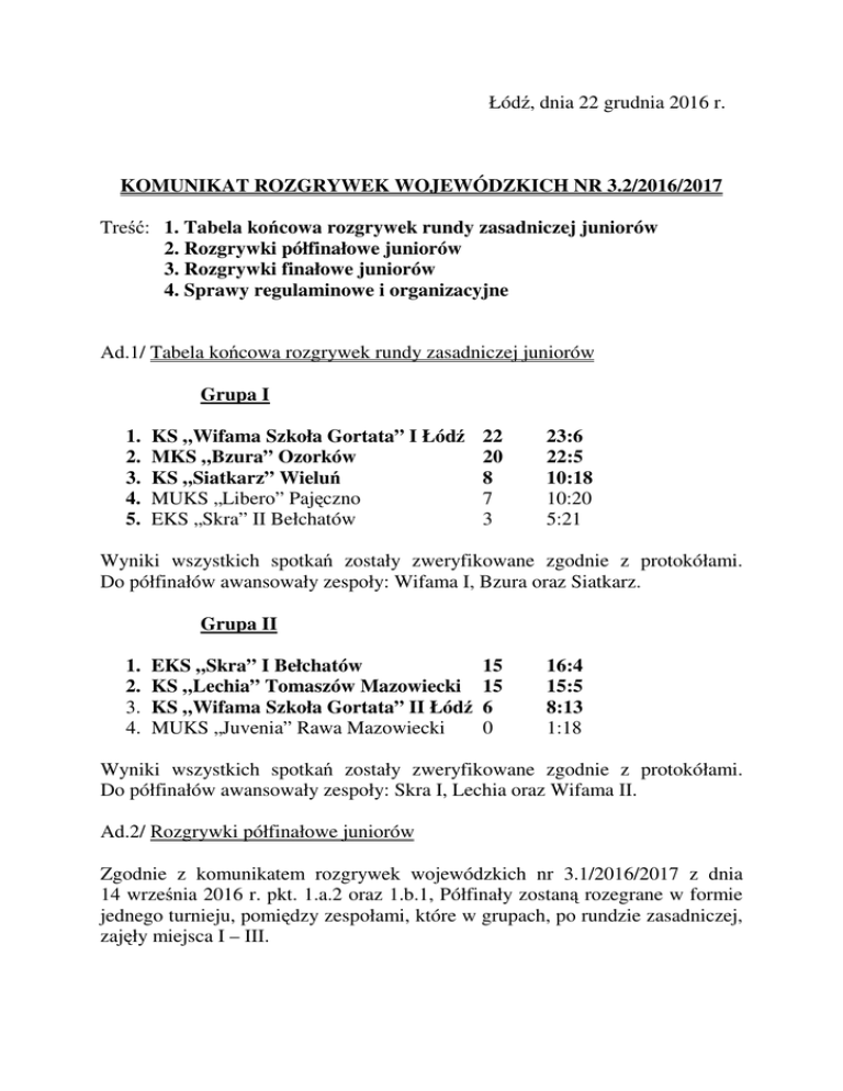 Łódź, dnia 22 grudnia 2016 r. KOMUNIKAT ROZGRYWEK