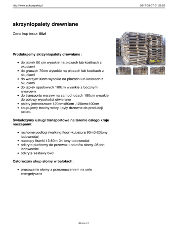 http://www.aukcjepalet.pl 2017-03-07 01:26:52 skrzyniopalety drewniane Cena kup teraz: 90zł Produkujemy skrzyniopalety drewniane : do jabłek 80 cm wysokie na płozach lub kostkach z okuciami do gruszek 70cm wysokie na płozach lub kostkach z okuciami do warzyw 90cm wysokie na płozach lub kostkach z okuciami do jabłek spadowych 160cm wysokie z bocznym wysypem do transportu warzyw na samochodach 180cm wysokie do połowy wysokości otwierane palety jednorazowe 120cmx80cm ,120cmx100cm skupujemy trociny,wióry i pyły drzewne do produkcji pelletu Świadczymy usługi transportowe na terenie całego kraju naczepami: ruchome podłogi (walking floor)-kubatura 90m3-23tony ładowności naczepy firanki 13,60m-24 tony ładowności odkryte platformy do przewozu balotów słomy-25 ton ładowności odkryte zestawy 8+8 Całoroczny skup słomy w balotach: prasowanie słomy z przeznaczeniem na cele energetyczne Strona 1/1
