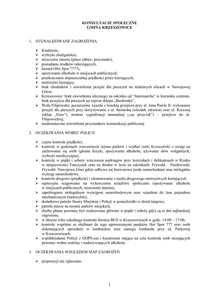 KONSULTACJE SPOŁECZNE GMINA KRZESZOWICE 1. SYGNALIZOWANE ZAGROŻENIA Kradzieże, wybryki chuligańskie, niszczenie mienia (place zabaw, przystanki), posiadanie środków odurzających, hazard (Hot Spot 7777), spożywanie alkoholu w miejscach publicznych, przekraczanie dopuszczalnej prędkości przez kierujących, nietrzeźwi kierujący, brak chodników i oświetlenia przejść dla pieszych na niektórych ulicach w Nawojowej Górze, Krzeszowice: brak oświetlenia ulicznego na odcinku od “Intermarche” w kierunku centrum, brak przejścia dla pieszych na wprost sklepu „Biedronka”, Wola Filipowska: poszerzenie wjazdu z korektą przejścia przy al. Jana Pawła II, wykonanie przejść dla pieszych przy skrzyżowaniu z ul. Stolarską (ośrodek zdrowia) oraz ul. Rzeczną (sklep „Euro”), montaż sygnalizacji manualnej („na przycisk”) – przejście do ul. Filipowickiej, niedostateczne oświetlenie przystanków komunikacji publicznej. 2. OCZEKIWANIA WOBEC POLICJI częste kontrole prędkości, kontrole w godzinach wieczornych rejonu parków i wzdłuż rzeki Krzeszówki z uwagi na zachowanie się osób (głośne krzyki, spożywanie alkoholu, używanie słów wulgarnych, wybryki nieobyczajne), kontrole w piątki i soboty wieczorem parkingów przy kościołach i delikatesach w Rynku w miejscowości Tenczynek oraz na drodze w lesie na odcinkach: Frywałd – Niedźwiedź, Frywałd- Nawojowa Góra gdzie odbywa się brawurowa jazda samochodami oraz nielegalne wyścigi samochodowe, kontrole drogowe (prędkość) i eliminowanie z ruchu drogowego nietrzeźwych kierujących represyjne reagowanie na wykroczenia uciążliwe społecznie (spożywanie alkoholu w miejscach publicznych, niszczenie mienia), zapobieganie nielegalnym wyścigom samochodowym oraz wjazdom do lasu pojazdom mechanicznym (motocykle), dodatkowe patrole Straży Miejskiej i Policji w poniedziałki w dzień targowy, patrole piesze na terenie parków miejskich, służby płatne powinny być realizowane głównie w piątki i soboty gdyż są to dni najbardziej zagrożone, w okresie roku szkolnego kontrole dworca BUS w Krzeszowicach w godz. 14:00 – 17:00, kontrole wspólnie ze służbami do tego uprawnionymi punktów Hot Spot 777 oraz osób dokonujących sprzedaży w lombardzie oraz samego lombardu przy ul. Parkowej w Krzeszowicach, współdziałanie Policji z GOPS-em i kuratorami mające na celu kontrolę osób stosujących przemoc wobec rodziny i nadużywających alkoholu. 3. OCZEKIWANIA WZGLĘDEM MAP ZAGROŻEŃ propozycji nie zgłaszano. 1