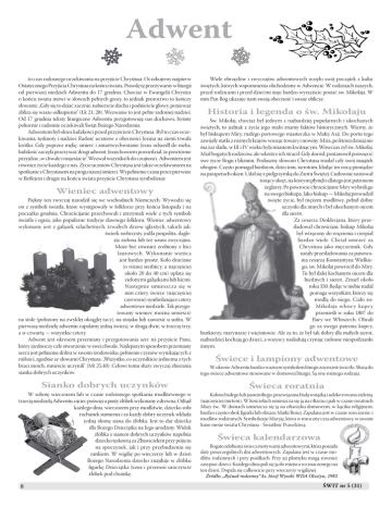 Adwent to czas radosnego oczekiwania na przyjście Chrystusa. Oczekujemy najpierw Ostatecznego Przyjścia Chrystusa na końcu świata. Prawdę tę przeżywamy w liturgii od pierwszej niedzieli Adwentu do 17 grudnia. Chociaż w Ewangelii Chrystus o końcu świata mówi w słowach pełnych grozy, to jednak proroctwo to kończy słowami: „Gdy się to dziać zacznie, nabierzcie ducha i podnieście głowy, ponieważ zbliża się wasze odkupienie" (Łk 21, 28). Wezwanie to jest pełne radosnej nadziei. Od 17 grudnia teksty liturgiczne Adwentu przygotowują nas duchowo, byśmy pokornie i radośnie oczekiwali Świąt Bożego Narodzenia. Adwentem był okres ludzkości przed przyjściem Chrystusa. Był to czas oczekiwania, tęsknoty i nadziei. Radość uczniów z obecności Jezusa na ziemi trwała krótko. Gdy poprzez mękę, śmierć i zmartwychwstanie Jezus odszedł do nieba, ludzkość zaczęła przeżywać drugi adwent. Jezus bowiem powiedział, że powtórnie przyjdzie „w chwale i majestacie”. Wezwał wszystkich do czujności. Adwentem jest również życie każdego z nas. Życie uczniów Chrystusa jest także oczekiwaniem na spotkanie z Chrystusem na progu naszej śmierci. Wypełnienie czasu przez pierwsze w Betlejem i drugie na końcu świata przyjście Chrystusa symbolizuje Wieniec adwentowy Piękny ten zwyczaj narodził się we wschodnich Niemczech. Wywodzi się on z symboli światła, które występowały w folklorze przy końcu listopada i na początku grudnia. Chrześcijanie przechowali i utrzymali wiele z tych symboli światła i ognia, jako popularne tradycje dawnego folkloru. Wieniec adwentowy wykonany jest z gałązek szlachetnych, trwałych drzew iglastych, takich jak: świerk srebrzysty, jodła pospolita, daglezja zielona lub też sosna zwyczajna. Może być również zrobiony z liści laurowych. Wykonanie wieńca jest bardzo proste. Koło druciane (o różnej średnicy, a najczęściej około 20 do 40 cm) oplata się zielonymi gałązkami lub liśćmi. Następnie umieszcza się w nim cztery świece (najczęściej czerwone) symbolizujące cztery adwentowe niedziele. Tak przygotowany wieniec można umieścić na stole (położony na zwykłej okrągłej tacy), na stojaku lub zawiesić u sufitu. W pierwszą niedzielę adwentu zapalamy jedną świecę, w drugą dwie, w trzecią trzy, a w czwartą — wszystkie cztery. Adwent jest okresem przemiany i przygotowania serc na przyjście Pana, który zjednoczy całe stworzenie w swej chwale. Najlepszym sposobem przemiany serca jest pełnienie dobra w swoim środowisku, pełnienie czynów wynikających z miłości, zgodnie ze słowami Chrystusa: „Wszystko, co uczyniliście jednemu z tych braci moich, mnieście uczynili" (Mt 25,40). Celowi temu służy zwyczaj zbierania sianka dobrych uczynków. Sianko dobrych uczynków W sobotę wieczorem lub w czasie rodzinnego spotkania modlitewnego w trzecią niedzielą Adwentu, ojciec poświęca pusty żłóbek wykonany z drewna. Odtąd każdego dnia, wieczorem przy modlitwie, dziecko robi rachunek sumienia i za każdy dobry uczynek wkłada jedną słomę siana do żłóbka. Jest to dar dziecka dla Bożego Dzieciątka na Jego urodziny. Widok żłóbka z sianem dobrych uczynków napełnia dziecko tęsknotą za Zbawicielem przy pójściu na spoczynek, jak i przy przebudzeniu się rankiem. W wigilię po wieczerzy lub w dzień Bożego Narodzenia dziecko znajduje w żłóbku figurkę Dzieciątka Jezus i przenosi uroczyście żłóbek pod choinkę. Wiele obrzędów i zwyczajów adwentowych wzięło swój początek z kultu świętych, których wspomnienia obchodzimy w Adwencie. W rodzinach naszych, przed rodzicami i przed dziećmi staje bardzo wyraziście postać św. Mikołaja. W nim Pan Bóg ukazuje nam swoją obecność i swoje oblicze. Historia i legenda o św. Mikołaju Św. Mikołaj, chociaż był jednym z najbardziej popularnych i ukochanych świętych, to jednak z życia jego mało znamy faktów historycznych. Wiemy, że był biskupem Miry, małego portowego miasteczka w Małej Azji. Do portu tego zawijały statki z różnych krajów wioząc towary i nowiny. Mira, po której dzisiaj nie ma już śladu, w III i IV wieku była miastem kwitnącym. Wówczas żył św. Mikołaj. Miał bogatych rodziców, ale wkrótce ich stracił. Gdy dorósł, postanowił poświęcić swe życie Bogu i bliźnim. Posłuszny słowom Chrystusa rozdał cały swój majątek ubogim. Często pomagał biednym, dzieciom, sierotom, kładąc im nocą pieniądze na parapetach okien. Udał się z pielgrzymką do Ziemi Świętej. Cudownie uratował tonący okręt, na którym płynęli i dlatego jest patronem żeglarzy. Po powrocie chrześcijanie Miry wybrali go na swego biskupa. Jako biskup — Mikołaj prowadził święte życie, był mężem modlitwy, pełnił dobre uczynki dla innych i był ukochanym ojcem dla sierot. Za cesarza Dioklecjana, który prześladował chrześcijan, biskup Mikołaj był wtrącony do więzienia i cierpiał bardzo wiele. Chciał umrzeć za Chrystusa jako męczennik. Gdy ustały prześladowania za panowania cesarza Konstantyna Wielkiego, św. Mikołaj powrócił do Miry. Tu był dalej kochanym ojcem dla biednych i sierot. Zmarł około roku 350. Będąc w niebie nadal pomaga wszystkim, którzy się modlą do niego. Ciało św. Mikołaja włoscy kupcy przenieśli w roku 1807 do Bary we Włoszech. Obrali go za swego patrona kupcy, bankierzy, marynarze i więźniowie. Ale za to, że był tak dobry dla małych sierot, najbardziej kochają go dzieci, a wszyscy naśladują czyniąc radosne niespodzianki innym. Świece i lampiony adwentowe W okresie Adwentu bardzo ważnym symbolem liturgicznym jest świa tło. Służą do tego świece adwentowe stosowane w domowej liturgii. Są one różnego rodzaju. Świeca roratnia Koloru białego lub jasnożółtego, przewiązana białą wstążką i udeko rowana zielenią (najczęściej mirtem). W kościołach umieszcza się ją na ołtarzu i pali w czasie roratnich Mszy