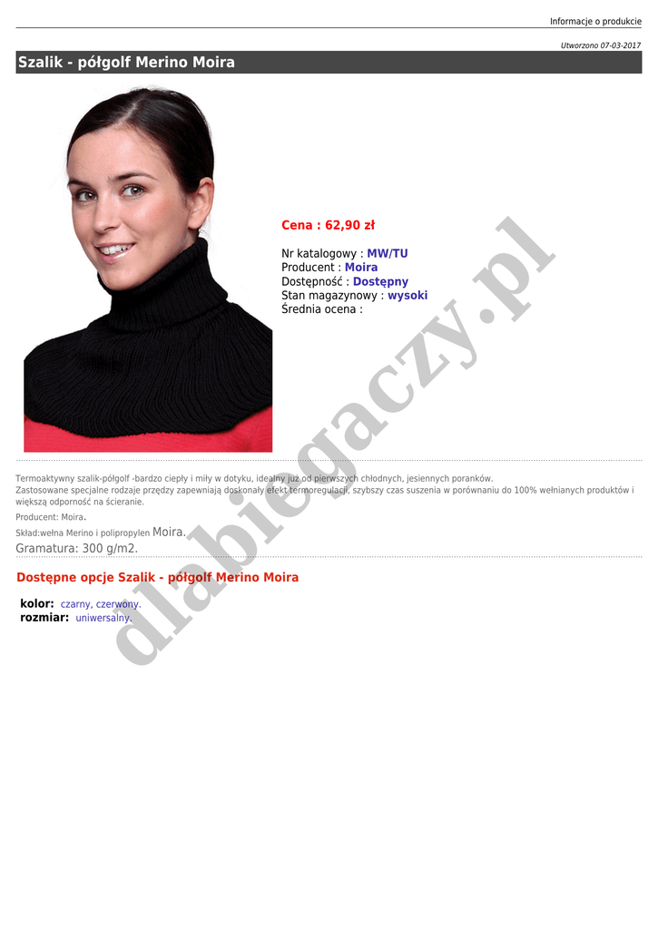 Informacje o produkcie Utworzono 07-03-2017 Szalik - półgolf Merino Moira Cena : 62,90 zł ga cz y. pl Nr katalogowy : MW/TU Producent : Moira Dostępność : Dostępny Stan magazynowy : wysoki Średnia ocena : Producent: Moira. Skład:wełna Merino i polipropylen Moira. ab Gramatura: 300 g/m2. ie Termoaktywny szalik-półgolf -bardzo ciepły i miły w dotyku, idealny już od pierwszych chłodnych, jesiennych poranków. Zastosowane specjalne rodzaje przędzy zapewniają doskonały efekt termoregulacji, szybszy czas suszenia w porównaniu do 100% wełnianych produktów i większą odporność na ścieranie. Dostępne opcje Szalik - półgolf Merino Moira dl kolor: czarny, czerwony. rozmiar: uniwersalny.