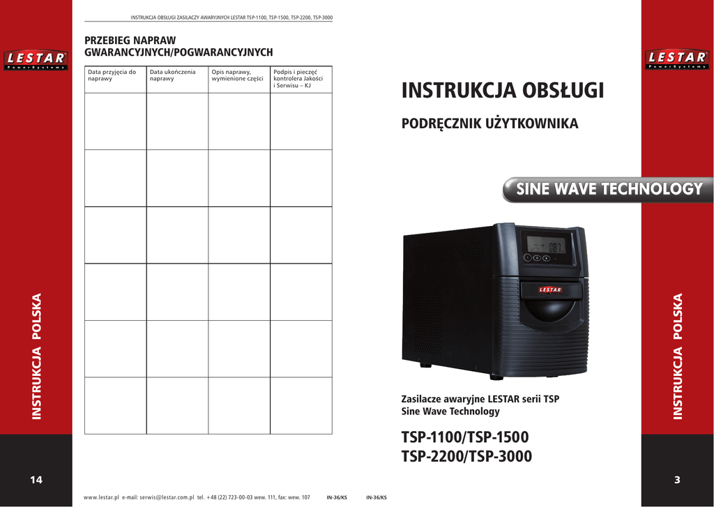 INSTRUKCJA OBSŁUGI ZASILACZY AWARYJNYCH LESTAR TSP-1100, TSP-1500, TSP-2200, TSP-3000 PRZEBIEG NAPRAW GWARANCYJNYCH/POGWARANCYJNYCH Data przyjęcia do naprawy Data ukończenia naprawy Opis naprawy, wymienione części Podpis i pieczęć kontrolera Jakości i Serwisu – KJ INSTRUKCJA OBSŁUGI Zasilacze awaryjne LESTAR serii TSP Sine Wave Technology INSTRUKCJA POLSKA INSTRUKCJA POLSKA PODRĘCZNIK UŻYTKOWNIKA TSP-1100/TSP-1500 TSP-2200/TSP-3000 3 14 www.lestar.pl e-mail: [email protected] tel. +48 (22) 723-00-03 wew. 111, fax: wew. 107 IN-36/KS IN-36/KS INSTRUKCJA OBSŁUGI ZASILACZY AWARYJNYCH LESTAR TSP-1100, TSP-1500, TSP-2200, TSP-3000 SPIS TREŚCI INSTRUKCJA OBSŁUGI ZASILACZY AWARYJNYCH LESTAR TSP-1100, TSP-1500, TSP-2200, TSP-3000 WARUNKI GWARANCJI W okresie gwarancji LESTAR bezpłatnie usunie ewentualne wady urządzenia pod warunkiem stosowania go zgodnie z przeznaczeniem i zaleceniami Instrukcji Obsługi oraz po przedstawieniu w punkcie serwisowym kompletnie i prawidłowo wypełnionej Karty Gwarancyjnej wraz z oryginalnym dowodem zakupu. Przeznaczenie zasilacza . . . . . . . . . . . . . . . . . . . . . . . . . . . . . . . . . 5 Instrukcje bezpieczeństwa . . . . . . . . . . . . . . . . . . . . . . . . . . . . . . . 5 Automatyczne, resetowalne bezpieczniki . . . . . . . . . . . . . . . . . . . 6 Instalacja, podłączenie, uwagi instalacyjne . . . . . . . . . . . . . . . . . . 6 Opis pracy . . . . . . . . . . . . . . . . . . . . . . . . . . . . . . . . . . . . . . . . . . . 6 Listwy zasilające . . . . . . . . . . . . . . . . . . . . . . . . . . . . . . . . . . . . . . . 7 Właściwości i funkcje . . . . . . . . . . . . . . . . . . . . . . . . . . . . . . . . . . . 8 Budowa zasilacza alarmy i sygnalizacja. . . . . . . . . . . . . . . . . . . . . . . . . . . . . . . . . . . . 9 elementy zewnętrzne. . . . . . . . . . . . . . . . . . . . . . . . . . . . . . . . . . . 9 Dane techniczne . . . . . . . . . . . . . . . . . . . . . . . . . . . . . . . . . . . . . . . . . 11 Wyposażenie. . . . . . . . . . . . . . . . . . . . . . . . . . . . . . . . . . . . . . . . . . . . 12 Problemy i podpowiedzi w obsłudze . . . . . . . . . . . . . . . . . . . . . . . . . 12 Warunki gwarancji . . . . . . . . . . . . . . . . . . . . . . . . . . . . . . . . . . . . . . . 13 INSTRUKCJA POLSKA Karta gwarancyjna . . . . . . . . . . . . . . . . . . . . . . . . . . . . . . . . . . . . . . . 13 1. Firma LESTAR gwarantuje dobrą jakość urządzenia. 2. Udzielamy gwarancji na zasilacze oraz baterie wewnętrzne w okresach wskazanych poniżej. Gwarancja bie gnie od daty sprzedaży. Seria Zasilaczy Bateria Home/OfficePower AVR Line Interactive 36 mc 24 mc 1. Wady i uszkodzenia należy zgłaszać: – bezpośrednio do firmy LESTAR lub – do wskazanego przez naszą firmę punktu serwisowego 2. Zgłaszając reklamację należy przesłać (zgodnie z pkt. 8, 9, 11) produkt wraz z kartą gwarancyjną i oryginalnym dowodem zakupu do punktu ser wisowe go LESTAR oraz wypełnić zgłoszenie reklamacyjne opisując wadę produktu. 3. Ujawnione wady i uszkodzenia w okresie gwarancyjnym będą usuwane bezpłatnie w terminie nie dłuższym niż 14 dni roboczych od daty dostarczenia urządzenia do serwisu firmy LESTAR. 4. Gwarancja ulega przedłużeniu o czas trwania naprawy. W razie wy miany produk tu na nowy, wolny od wad Klient otrzyma nową gwarancję od dnia wydania produktu. 5. Po dokonaniu naprawy lub w przypadku wymiany produktu na wolny od wad, produkt zostanie przesłany do Klienta (bądź wydany w punkcie ser wisowym) w oparciu o pokwitowanie jego przyjęcia wystawione przez serwis LESTAR. 6. W okresie pierwszych dwóch lat działania gwarancji w przypadku uszkodzenia zasilacza koszt przesyłki urzą- dzenia do serwisu LESTAR, jak i zwrotu do Klienta po naprawie pokrywa LESTAR. Po upływie tego okresu koszt przesyłki pokrywa Klient. 7. Warunkiem pokrycia kosztów przez firmę LESTAR jest dokonanie przesy łki za pośrednictwem firmy spedycyjnej wskazanej przez LESTAR na stronie www.lestar.pl. 8. W 3 roku gwarancji oraz w okresie pogwarancyjnym koszt naprawy i transportu w obie strony pokrywa reklamujący. 9. Urządzenie powinno być przesłane do serwisu w oryginalnym opakowaniu. W przypadku jego braku firma LESTAR nie odpowiada za uszkodzenia powstałe w wyniku transportu. 10. Wady i uszkodzenia spowodowane użytkowaniem niezgodnym z instrukcją obsługi nie podlegają naprawom gwarancyjnym. 11. Zerwanie plomby gwarancyjnej, próba samodzielnej naprawy lub naprawy przez osoby nieuprawnione, jakie- kolwiek przeróbki i zmiany konstrukcyjne powodują utratę uprawnień z ty tułu gwarancji. 12. Gwarancją nie są objęte uszkodzenia mechaniczne, termiczne, zalania cieczą, zawilgocenie oraz inne uszkodzenia spowodowane niewłaściwą eksploatacją. 13. Niewypełnienie przez sprzedawcę karty gwarancyjnej w dniu sprze daży, jakiekolwiek poprawki i skreślenia oraz brak dokumentu potwierdzającego zakup powoduje utratę uprawnień z tytułu gwarancji. 14. Gwarancja może nie mieć zastosowania, jeżeli Karta Gwarancyjna lub dowód zakupu będą niezgodne ze sobą lub niemożliwe będzie odczytanie znajdujących się w nich danych. 15. Zgubienie lub utrata karty gwarancyjnej powoduje wygaśnię cie uprawnień z tytułu gwarancji. Duplikaty karty gwarancyjnej nie będą wydawane. 16. Sposób naprawy ustala firma LESTAR. 17. Nieuzasadnione przesłanie urządzenia do naprawy spowoduje obciąże nie Klienta kosztami prze syłki (dot. pkt. 12, 13, 14). 18. LESTAR nie ponosi odpowiedzialności za szkodę w postaci utraconych korzyści. 19. Niniejszą Kartę Gwarancyjną prosimy zachować do końca użytkowania urządzenia celem skorzystania z ewentualnych usług pogwarancyjnych. KARTA GWARANCYJNA Zapoznałem się i akceptuję warunki niniejszej gwarancji. Wyrażam zgodę na wykorzystanie moich danych osobowych dla potrzeb niezbędnych do realizacji reklamacji gwarancyjnej. (zgodnie z Ustawą o ochronie danych osobowych z dnia