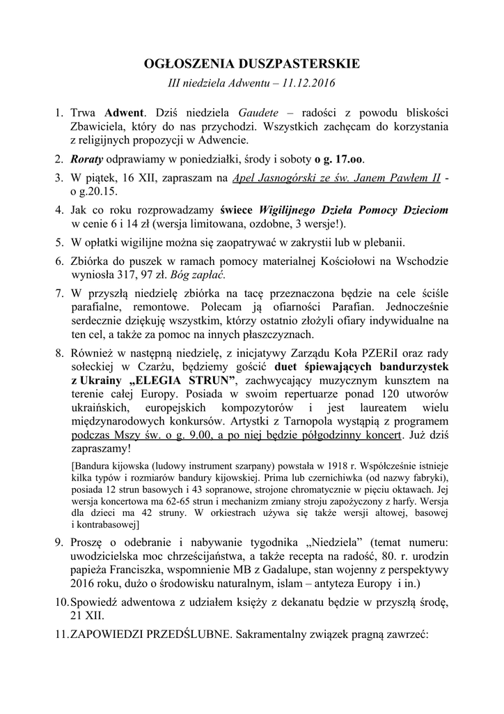 OGŁOSZENIA DUSZPASTERSKIE III niedziela Adwentu – 11.12.2016 1. Trwa Adwent. Dziś niedziela Gaudete – radości z powodu bliskości Zbawiciela, który do nas przychodzi. Wszystkich zachęcam do korzystania z religijnych propozycji w Adwencie. 2. Roraty odprawiamy w poniedziałki, środy i soboty o g. 17.oo. 3. W piątek, 16 XII, zapraszam na Apel Jasnogórski ze św. Janem Pawłem II o g.20.15. 4. Jak co roku rozprowadzamy świece Wigilijnego Dzieła Pomocy Dzieciom w cenie 6 i 14 zł (wersja limitowana, ozdobne, 3 wersje!). 5. W opłatki wigilijne można się zaopatrywać w zakrystii lub w plebanii. 6. Zbiórka do puszek w ramach pomocy materialnej Kościołowi na Wschodzie wyniosła 317, 97 zł. Bóg zapłać. 7. W przyszłą niedzielę zbiórka na tacę przeznaczona będzie na cele ściśle parafialne, remontowe. Polecam ją ofiarności Parafian. Jednocześnie serdecznie dziękuję wszystkim, którzy ostatnio złożyli ofiary indywidualne na ten cel, a także za pomoc na innych płaszczyznach. 8. Również w następną niedzielę, z inicjatywy Zarządu Koła PZERiI oraz rady sołeckiej w Czarżu, będziemy gościć duet śpiewających bandurzystek z Ukrainy „ELEGIA STRUN”, zachwycający muzycznym kunsztem na terenie całej Europy. Posiada w swoim repertuarze ponad 120 utworów ukraińskich, europejskich kompozytorów i jest laureatem wielu międzynarodowych konkursów. Artystki z Tarnopola wystąpią z programem podczas Mszy św. o g. 9.00, a po niej będzie półgodzinny koncert. Już dziś zapraszamy! [Bandura kijowska (ludowy instrument szarpany) powstała w 1918 r. Współcześnie istnieje kilka typów i rozmiarów bandury kijowskiej. Prima lub czernichiwka (od nazwy fabryki), posiada 12 strun basowych i 43 sopranowe, strojone chromatycznie w pięciu oktawach. Jej wersja koncertowa ma 62-65 strun i mechanizm zmiany stroju zapożyczony z harfy. Wersja dla dzieci ma 42 struny. W orkiestrach używa się także wersji altowej, basowej i kontrabasowej] 9. Proszę o odebranie i nabywanie tygodnika „Niedziela” (temat numeru: uwodzicielska moc chrześcijaństwa, a także recepta na radość, 80. r. urodzin papieża Franciszka, wspomnienie MB z Gadalupe, stan wojenny z perspektywy 2016 roku, dużo o środowisku naturalnym, islam – antyteza Europy i in.) 10.Spowiedź adwentowa z udziałem księży z dekanatu będzie w przyszłą środę, 21 XII. 11.ZAPOWIEDZI PRZEDŚLUBNE. Sakramentalny związek pragną zawrzeć: Tomasz Donarski, kawaler, zam. Bydgoszcz, Wita Stwosza 4 i Alicja Niedziela, panna, zam. Czemlewo (zapowiedź I) Kto by wiedział o jakiejkolwiek przeszkodzie do zawarcia tego małżeństwa zobowiązany jest zgłosić to w biurze parafialnym. 12.W czwartek odbył się pogrzeb + Weroniki Straszewskiej, dawnej mieszkanki Czemlewa. Polećmy ją Miłosierdziu Bożemu: Dobry Jezu...