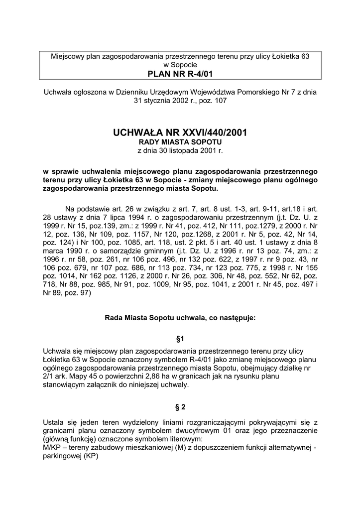 Miejscowy plan zagospodarowania przestrzennego terenu przy ulicy Łokietka 63 w Sopocie PLAN NR R-4/01 Uchwała ogłoszona w Dzienniku Urzędowym Województwa Pomorskiego Nr 7 z dnia 31 stycznia 2002 r., poz. 107 UCHWAŁA NR XXVI/440/2001 RADY MIASTA SOPOTU z dnia 30 listopada 2001 r. w sprawie uchwalenia miejscowego planu zagospodarowania przestrzennego terenu przy ulicy Łokietka 63 w Sopocie - zmiany miejscowego planu ogólnego zagospodarowania przestrzennego miasta Sopotu. Na podstawie art. 26 w związku z art. 7, art. 8 ust. 1-3, art. 9-11, art.18 i art. 28 ustawy z dnia 7 lipca 1994 r. o zagospodarowaniu przestrzennym (j.t. Dz. U. z 1999 r. Nr 15, poz.139, zm.: z 1999 r. Nr 41, poz. 412, Nr 111, poz.1279, z 2000 r. Nr 12, poz. 136, Nr 109, poz. 1157, Nr 120, poz.1268, z 2001 r. Nr 5, poz. 42, Nr 14, poz. 124) i Nr 100, poz. 1085, art. 118, ust. 2 pkt. 5 i art. 40 ust. 1 ustawy z dnia 8 marca 1990 r. o samorządzie gminnym (j.t. Dz. U. z 1996 r. nr 13 poz. 74, zm.: z 1996 r. nr 58, poz. 261, nr 106 poz. 496, nr 132 poz. 622, z 1997 r. nr 9 poz. 43, nr 106 poz. 679, nr 107 poz. 686, nr 113 poz. 734, nr 123 poz. 775, z 1998 r. Nr 155 poz. 1014, Nr 162 poz. 1126, z 2000 r. Nr 26, poz. 306, Nr 48, poz. 552, Nr 62, poz. 718, Nr 88, poz. 985, Nr 91, poz. 1009, Nr 95, poz. 1041, z 2001 r. Nr 45, poz. 497 i Nr 89, poz. 97) Rada Miasta Sopotu uchwala, co następuje: §1 Uchwala się miejscowy plan zagospodarowania przestrzennego terenu przy ulicy Łokietka 63 w Sopocie oznaczony symbolem R-4/01 jako zmianę miejscowego planu ogólnego zagospodarowania przestrzennego miasta Sopotu, obejmujący działkę nr 2/1 ark. Mapy 45 o powierzchni 2,86 ha w granicach jak na rysunku planu stanowiącym załącznik do niniejszej uchwały. §2 Ustala się jeden teren wydzielony liniami rozgraniczającymi pokrywającymi się z granicami planu oznaczony symbolem dwucyfrowym 01 oraz jego przeznaczenie (główną funkcję) oznaczone symbolem literowym: M/KP – tereny zabudowy mieszkaniowej (M) z dopuszczeniem funkcji alternatywnej parkingowej (KP) §3 Ustalenia szczegółowe planu zawiera poniższa karta terenu nr 01. 1. Wyjaśnienia do ustaleń szczegółowych: - dopuszczalna wysokość zabudowy = wysokość budynku mierzona od naturalnej warstwicy terenu do kalenicy lub wg ustaleń szczegółowych, - stawka procentowa – jednorazowa opłata wnoszona na rzecz gminy, określona w stosunku procentowym do wzrostu wartości nieruchomości w związku z uchwaleniem planu na zasadach określonych w art. 36 ust. 3 wymienionej ustawy o zagospodarowaniu przestrzennym. 2. Ustalenia szczegółowe planu są następujące: patrz plik karty terenu wg oznaczeń na rysunku planu. §4 Integralną częścią planu jest rysunek miejscowego planu zagospodarowania przestrzennego terenu posesji przy ulicy Łokietka 63 w Sopocie w skali 1:2000. Układ oznaczeń na rysunku planu – na rysunku planu określono: - granicę planu, - linie rozgraniczające tereny o różnych funkcjach lub różnych zasadach zagospodarowania. §5 Zobowiązuje się Zrząd Miasta do: 1) niezwłocznego przekazania niniejszej uchwały Pomorskiemu Urzędowi Wojewódzkiemu w celu ogłoszenia jej w Dzienniku Urzędowym Województwa Pomorskiego, 2) umieszczenia odpisu niniejszej uchwały na okres 14 dni na tablicy ogłoszeń Urzędu Miejskiego w Sopocie, 3) umożliwienia zainteresowanym osobom wglądu do planu i wydawanie na wniosek zainteresowanych potrzebnych wyrysów i wypisów z planu na zasadach określonych w art. 29 ust. 2 wymienionej ustawy o zagospodarowaniu przestrzennym. §6 Traci moc miejscowy plan ogólny zagospodarowania przestrzennego miasta Sopotu zatwierdzony Uchwałą LII/491/94 Rady Miasta Sopotu z dnia 19 maja 1994 r. (Dz. U. Woj. Gd. Nr 16 z dnia 9 VIII 1994 r. poz. 74) we fragmencie objętym granicami niniejszego planu. 2 §7 Uchwała wchodzi w życie po upływie 14 dni od dnia jej ogłoszenia w Dzienniku Urzędowym Województwa Pomorskiego, z wyjątkiem § 5 pkt.1, który wchodzi w życie z dniem podjęcia uchwały. Wiceprzewodniczący Rady Miasta Sopotu B. Gierak-Pilarczyk 3