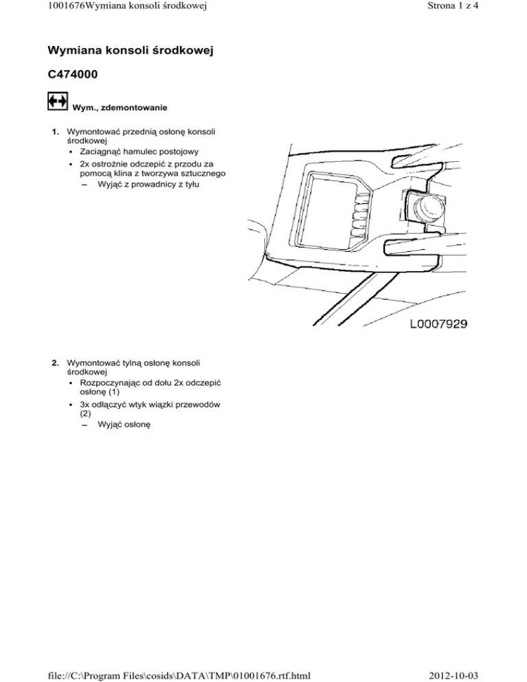 1001676Wymiana konsoli środkowej Strona 1 z 4 Wymiana konsoli środkowej C474000 Wym., zdemontowanie 1. Wymontować przednią osłonę konsoli środkowej • Zaciągnąć hamulec postojowy • 2x ostrożnie odczepić z przodu za pomocą klina z tworzywa sztucznego – Wyjąć z prowadnicy z tyłu 2. Wymontować tylną osłonę konsoli środkowej • Rozpoczynając od dołu 2x odczepić osłonę (1) • 3x odłączyć wtyk wiązki przewodów (2) – Wyjąć osłonę file://C:\Program Files\cosids\DATA\TMP\01001676.rtf.html 2012-10-03 1001676Wymiana konsoli środkowej Strona 2 z 4 file://C:\Program Files\cosids\DATA\TMP\01001676.rtf.html 2012-10-03 1001676Wymiana konsoli środkowej Strona 3 z 4 3. Wymontować konsolę środkową • 4x odkręcić śrubę (strzałki) • 2x rozłączyć wtyk wiązki przewodów • Wyjąć konsolę środkową Wmont., zamontowanie 4. Zamontować konsolę środkową • Założyć konsolę środkową • 2x podłączyć wtyk wiązki przewodów • 4x dokręcić śrubę 5. Zamontować tylną osłonę konsoli środkowej • 3x podłączyć wtyk wiązki przewodów • 2x zamocować osłonę 6. Zamontować przednią osłonę konsoli środkowej • Zaciągnąć hamulec postojowy file://C:\Program Files\cosids\DATA\TMP\01001676.rtf.html 2012-10-03 1001676Wymiana konsoli środkowej Strona 4 z 4 • Włożyć do prowadnicy z tyłu • 2x zamocować z przodu file://C:\Program Files\cosids\DATA\TMP\01001676.rtf.html 2012-10-03