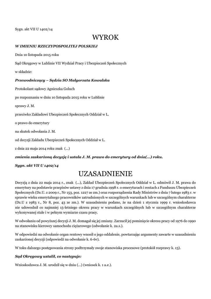 Sygn. akt VII U 1402/14 WYROK W IMIENIU RZECZYPOSPOLITEJ POLSKIEJ Dnia 10 listopada 2015 roku Sąd Okręgowy w Lublinie VII Wydział Pracy i Ubezpieczeń Społecznych w składzie: Przewodniczący – Sędzia SO Małgorzata Kowalska Protokolant sądowy Agnieszka Goluch po rozpoznaniu w dniu 10 listopada 2015 roku w Lublinie sprawy J. M. przeciwko Zakładowi Ubezpieczeń Społecznych Oddział w L. o prawo do emerytury na skutek odwołania J. M. od decyzji Zakładu Ubezpieczeń Społecznych Oddział w L. z dnia 22 maja 2014 roku znak (...) zmienia zaskarżoną decyzję i ustala J. M. prawo do emerytury od dnia(...) roku. Sygn. akt VII U 1402/14 UZASADNIENIE Decyzją z dnia 22 maja 2014 r., znak (...), Zakład Ubezpieczeń Społecznych Oddział w L. odmówił J. M. prawa do emerytury na podstawie przepisów ustawy z dnia 17 grudnia 1998 r. o emeryturach i rentach z Funduszu Ubezpieczeń Społecznych (Dz.U. z 2009 r., Nr 153, poz. 1227 ze zm.) oraz rozporządzenia Rady Ministrów z dnia 7 lutego 1983 r. w sprawie wieku emerytalnego pracowników zatrudnionych w szczególnych warunkach lub w szczególnym charakterze (Dz.U z 1983 r., Nr 8, poz. 43 ze zm.). W uzasadnieniu podano, że na dzień 1 stycznia 1999 r. wnioskodawca nie udowodnił co najmniej 15-letniego okresu pracy w warunkach szczególnych lub w szczególnym charakterze wykonywanej stale i w pełnym wymiarze czasu pracy. W odwołaniu od powyższej decyzji J. M. domagał się jej zmiany. Zarzucił jej pominięcie okresu pracy od 1976 do 1990 na stanowisku kierowcy samochodu ciężarowego (odwołanie k. 2a.s.). W odpowiedzi na odwołanie organ rentowy wnosił o jego oddalenie, powtarzając argumenty zawarte w uzasadnieniu zaskarżonej decyzji (odpowiedź na odwołanie k. 6-6v). W toku dalszego postępowania strony podtrzymały swoje stanowiska procesowe (protokół rozprawy k. 13). Sąd Okręgowy ustalił, co następuje: Wnioskodawca J. M. urodził się w dniu (...) (wniosek k. 1 a.e.). W dniu 7 maja 2014 r. J. M. złożył wniosek o emeryturę, w treści którego zawarł oświadczenie o tym, że nie jest członkiem otwartego funduszu emerytalnego oraz o tym, że nie pozostaje w stosunku pracy (wniosek k. 1-3 a.e.). W oparciu o złożone wraz z wnioskiem dokumenty organ rentowy ustalił na dzień 1 stycznia 1999 r. łączny staż podlegania ubezpieczeniom w wymiarze 28 lat, 0 miesięcy i 17 dni (26 lat, 8 miesięcy i 15 dni okresów składkowych oraz 1 rok, 6 miesiące, 2 dni okresów nieskładkowych), w tym 6 lat i 29 dni pracy w szczególnych warunkach (karta przebiegu zatrudnienia k.47 v a.e.). Wskazano w nim, że J. M. nie złożył świadectwa pracy w szczególnych warunkach na okres pracy w Spółdzielni (...) w R. od 08.05.1976 r. do 24.09.1990 r. W tym stanie rzeczy wydana została zaskarżona decyzja. Wnioskodawca J. M. posiada prawo jazdy uprawniające go do kierowania samochodami ciężarowymi o ciężarze całkowitym powyżej 3,5 tony. W dniu 8 maja 1976 r. J. M. zawarł ze Spółdzielnią (...) w R. umowę o pracę. W pełnym wymiarze czasu pracy powierzono mu stanowisko kierowcy (akta osobowe – koperta k. 29 a.s.). J. M. był kierowcą samochodu ciężarowego marki S., J., K. o ciężarze całkowitym powyżej 3,5 tony. Wnioskodawca przewoził: materiały budowlane, węgiel, warzywa, cement, kamień przetwory i inne rzeczy po terenie całej Polski. Pracodawca miał wiele samochodów ciężarowych dlatego w przypadku awarii J. M. dostawał samochód zastępczy a naprawą zajmował się warsztat samochodowy. Wnioskodawca odpowiadał za przewożony towar dlatego był jednocześnie konwojentem z czym wiązało się jedynie podpisanie wz-etki i przeliczenie towaru (zeznania J. M. k. 23 i 37, świadków: S. (...) i J. P. k. 24-25). Poza wykonywaniem obowiązków kierowcy samochodu ciężarowego wnioskodawca nie wykonywał innych czynności. Czynności załadunkowo – rozładunkowe wykonywał sprzęt zmechanizowany albo osoby odpowiedzialne za rozładunek i załadunek. Powyższy stan faktyczny Sąd ustalił w oparciu o wskazane dowody. Oceniając zeznania świadków należy wskazać, że były to osoby dla skarżącego obce. Świadkowie byli zatrudnieni w tym samym zakładzie pracy w tym samym czasie, co wnioskodawca na tym samym stanowisku pracy. świadkowie potwierdzili, że wnioskodawca był kierowcą samochodu ciężarowego o ciężarze całkowitym powyżej 3,5 tony. Szczegółowo opisali jakie czynności wykonywał. Zeznania świadków są zgodne ze sobą oraz z zeznaniami samego wnioskodawcy J. M.. Sąd ocenił je jako wiarygodne. Stan faktyczny w niniejszej sprawie został ustalony także w oparciu o przytoczone dowody z dokumentów zawartych w aktach organu rentowego oraz w aktach osobowych wnioskodawcy. Zostały one sporządzone w przepisanej formie, w oparciu o obowiązujące w dacie ich wydania przepisy prawne oraz wydane przez kompetentne osoby w ramach przysługujących im uprawnień. Sąd Okręgowy zważył, co następuje: Odwołanie J. M. jest zasadne i zasługuje na uwzględnienie. Zgodnie z art. 184 ust. 1 i 2 ustawy z dnia 17 grudnia 1998 r. o emeryturach i rentach z Funduszu Ubezpieczeń Społecznych (Dz.U. z 2009 r. Nr 153, poz. 1227 ze zm.), mężczyznom urodzonym po dniu 31 grudnia 1948 r. przysługuje emerytura po osiągnięciu wieku przewidzianego w art. 32, 33, 39 i 40, jeżeli w dniu wejścia w życie ustawy osiągnęli okres zatrudnienia w szczególnych warunkach lub w szczególnym charakterze wymaganym w przepisach dotychczasowych do nabycia prawa do emerytury w wieku niższym niż 65 lat oraz okres składkowy i nieskładkowy wynoszący co najmniej 25 lat. Emerytura przysługuje pod warunkiem nieprzystąpienia do otwartego funduszu emerytalnego albo złożenia wniosku o przekazanie środków zgromadzonych na rachunku w otwartym funduszu emerytalnym, za pośrednictwem Zakładu, na dochody budżetu państwa oraz – w wersji obowiązującej do dnia 31 grudnia 2012 r. – także pod warunkiem rozwiązan