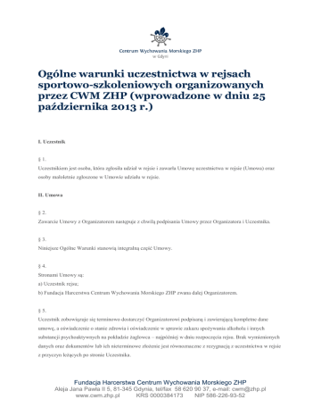 Ogólne warunki uczestnictwa w rejsach sportowo-szkoleniowych organizowanych przez CWM ZHP (wprowadzone w dniu 25 października 2013 r.) I. Uczestnik § 1. Uczestnikiem jest osoba, która zgłosiła udział w rejsie i zawarła Umowę uczestnictwa w rejsie (Umowa) oraz osoby małoletnie zgłoszone w Umowie udziału w rejsie. II. Umowa § 2. Zawarcie Umowy z Organizatorem następuje z chwilą podpisania Umowy przez Organizatora i Uczestnika. § 3. Niniejsze Ogólne Warunki stanowią integralną część Umowy. § 4. Stronami Umowy są: a) Uczestnik rejsu; b) Fundacja Harcerstwa Centrum Wychowania Morskiego ZHP zwana dalej Organizatorem. § 5. Uczestnik zobowiązuje się terminowo dostarczyć Organizatorowi podpisaną i zawierającą kompletne dane umowę, a oświadczenie o stanie zdrowia i oświadczenie w sprawie zakazu spożywania alkoholu i innych substancji psychoaktywnych na pokładzie żaglowca – najpóźniej w dniu rozpoczęcia rejsu. Brak wymienionych danych oraz dokumentów lub ich nieterminowe złożenie jest równoznaczne z rezygnacją z uczestnictwa w rejsie z przyczyn leżących po stronie Uczestnika. Fundacja Harcerstwa Centrum Wychowania Morskiego ZHP Aleja Jana Pawła II 5, 81-345 Gdynia, tel/fax 58 620 90 37, e-mail: [email protected] www.cwm.zhp.pl KRS 0000384173 NIP 586-226-93-52 § 6. O wszelkich zmianach danych, o których mowa powyżej, Uczestnik jest zobowiązany niezwłocznie poinformować Organizatora. Organizator nie odpowiada za niewykonanie Umowy z powodu zmiany danych, o której nie został poinformowany przez Uczestnika na piśmie. § 7. O ile strony nie umówią się inaczej, cena rejsu nie zawiera: kosztów przejazdu do miejsca rozpoczęcia i z miejsca zakończenia rejsu, kosztów wyżywienia, paliwa i innych eksploatacyjnych, opłat turystycznych oraz klimatycznych, opłat portowych, kanałowych, śluzowych i pilotowych, podatków, opłat transakcyjnych itp. § 8. Rozliczanie ceny rejsu na zasadzie godzin lub punktów wolontariackich wypracowanych przez uczestnika na rzecz CWM opiera się o następujące zasady: a) godziny lub punkty wolontariackie są przyznawane na zasadach określonych regulaminem wolontariatu; b) wartości przeliczeń ceny na godziny lub punkty wolontariackie jest określony w regulaminie wolontariatu, a w uzasadnionych wypadkach – określony w informacji o rejsie i umowie; c) rozliczenia godzin lub punktów wolontariackich dokonuje się w dacie wymagalności opłat określonych w umowie, do wysokości godzin (punktów) znajdujących się na koncie wolontariusza. III. Rezygnacja z udziału w rejsie § 9. W przypadku zawarcia Umowy uczestnictwa poza lokalem Organizatora, Uczestnik może odstąpić od umowy w ciągu 14 dni od jej zawarcia. Odstąpienie przez Uczestnika od umowy wymaga formy pisemnej. § 10. Jeśli Uczestnik rezygnuje z udziału w rejsie, powinien niezwłocznie powiadomić o tym na piśmie Organizatora. § 11. Uczestnik ma prawo do rezygnacji z udziału w rejsie bez ponoszenia kosztów w przypadku, gdy wskaże inną osobę spełniającą warunki udziału w rejsie i osoba ta jednocześnie przejmie wszelkie obowiązki i uprawnienia przysługujące Uczestnikowi z tytułu Umowy, w tym niniejszych Ogólnych Warunków. Przeniesienie uprawnień i przejęcie obowiązków nie wymaga zgody Organizatora i jest skuteczne wobec Organizatora, jeżeli Uczestnik Fundacja Harcerstwa Centrum Wychowania Morskiego ZHP Aleja Jana Pawła II 5, 81-345 Gdynia, tel/fax 58 620 90 37, e-mail: [email protected] www.cwm.zhp.pl KRS 0000384173 NIP 586-226-93-52 zawiadomi go o tym najpóźniej na dwa tygodnie przed rozpoczęciem rejsu. Rezygnacja Uczestnika z udziału w rejsie może nastąpić wyłącznie w formie pisemnego oświadczenia. Za datę wpływu rezygnacji przyjmuje się datę otrzymania oświadczenia przez Organizatora. Za nieuiszczoną część ceny oraz koszty poniesione przez Organizatora w wyniku zmiany uczestnictwa Uczestnik i osoba przejmująca jego obowiązki i uprawnienia odpowiadają solidarnie. § 12. Jeśli Uczestnik zrezygnuje z uczestnictwa w rejsie i nie przeniesie swych uprawnień do udziału w rejsie na inną osobę, Organizatorowi przysługuje uprawnienie do potrącenia faktycznie poniesionych przez niego kosztów związanych z organizacją rejsu oraz prawo do dochodzenia od Uczestnika kwoty w wysokości rzeczywiście poniesionej szkody. Potrącenia kosztów poniesionych przez Organizatora w przypadku odstąpienia Uczestnika od Umowy nie mogą przekroczyć podanych poniżej kwot: a) 20% ceny rejsu – przy odstąpieniu od Umowy powyżej 70 dni przed terminem rozpoczęcia rejsu b) 50% ceny rejsu – przy odstąpieniu od Umowy pomiędzy 69, a 31 dniem przed terminem rozpoczęcia rejsu c) 100% ceny rejsu – przy odstąpieniu od Umowy między 30 a 1 dniem przed terminem rejsu oraz przy odstąpieniu w dniu rozpoczęcia rejsu. Zwrot wpłat Uczestnika wymienionych powyżej Organizator dokonuje nie później niż 14 dni od daty otrzymania rezygnacji od Klienta zawierającego oświadczenie woli w przedmiocie odstąpienia od Umowy. § 13. W przypadku nie przeniesienia przez Uczestnika rezygnującego z udziału w rejsie obowiązków i uprawnień przysługujących mu z tytułu Umowy, w tym niniejszych Ogólnych Warunków na inną osobę, miejsce zwolnione w wyniku rezygnacji Uczestnika pozostaje do dyspozycji Organizatora. § 14. Organizator zastrzega sobie prawo do rozwiązania Umowy z Uczestnikiem z przyczyn leżących po stronie Uczestnika, którego wpłaty nie zostaną przekazane w wysokości, zasadach i terminach określonych w Umowie na rzecz Organizatora. Zastosowanie ma wówczas pkt. 12 Warunków uczestnictwa w rejsie. § 15. Przy dokonywaniu jakichkolwiek zwrotów pieniężnych, Uczestnikowi nie przysługują odsetki od wpłaconych kwot. Fundacja Harcerstwa Centrum Wychowania Morskiego ZHP Aleja Jana Pawła II 5, 81-345 Gdynia, tel/fax 58 620 90 37, e-mail: [email protected] www.cwm.zhp.pl KRS 0000384173 NIP 586-226-93-52 IV.