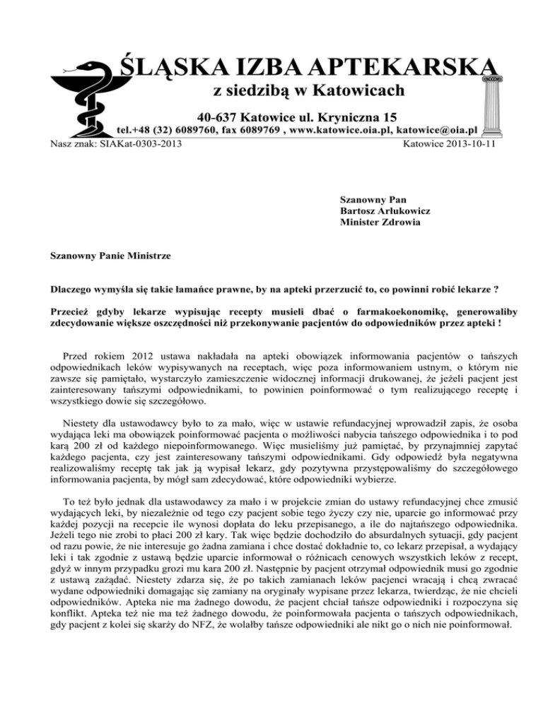 Nasz znak: SIAKat-0303-2013 Katowice 2013-10-11 Szanowny Pan Bartosz Arłukowicz Minister Zdrowia Szanowny Panie Ministrze Dlaczego wymyśla się takie łamańce prawne, by na apteki przerzucić to, co powinni robić lekarze ? Przecież gdyby lekarze wypisując recepty musieli dbać o farmakoekonomikę, generowaliby zdecydowanie większe oszczędności niż przekonywanie pacjentów do odpowiedników przez apteki ! Przed rokiem 2012 ustawa nakładała na apteki obowiązek informowania pacjentów o tańszych odpowiednikach leków wypisywanych na receptach, więc poza informowaniem ustnym, o którym nie zawsze się pamiętało, wystarczyło zamieszczenie widocznej informacji drukowanej, że jeżeli pacjent jest zainteresowany tańszymi odpowiednikami, to powinien poinformować o tym realizującego receptę i wszystkiego dowie się szczegółowo. Niestety dla ustawodawcy było to za mało, więc w ustawie refundacyjnej wprowadził zapis, że osoba wydająca leki ma obowiązek poinformować pacjenta o możliwości nabycia tańszego odpowiednika i to pod karą 200 zł od każdego niepoinformowanego. Więc musieliśmy już pamiętać, by przynajmniej zapytać każdego pacjenta, czy jest zainteresowany tańszymi odpowiednikami. Gdy odpowiedź była negatywna realizowaliśmy receptę tak jak ją wypisał lekarz, gdy pozytywna przystępowaliśmy do szczegółowego informowania pacjenta, by mógł sam zdecydować, które odpowiedniki wybierze. To też było jednak dla ustawodawcy za mało i w projekcie zmian do ustawy refundacyjnej chce zmusić wydających leki, by niezależnie od tego czy pacjent sobie tego życzy czy nie, uparcie go informować przy każdej pozycji na recepcie ile wynosi dopłata do leku przepisanego, a ile do najtańszego odpowiednika. Jeżeli tego nie zrobi to płaci 200 zł kary. Tak więc będzie dochodziło do absurdalnych sytuacji, gdy pacjent od razu powie, że nie interesuje go żadna zamiana i chce dostać dokładnie to, co lekarz przepisał, a wydający leki i tak zgodnie z ustawą będzie uparcie informował o różnicach cenowych wszystkich leków z recept, gdyż w innym przypadku grozi mu kara 200 zł. Następnie by pacjent otrzymał odpowiednik musi go zgodnie z ustawą zażądać. Niestety zdarza się, że po takich zamianach leków pacjenci wracają i chcą zwracać wydane odpowiedniki domagając się zamiany na oryginały wypisane przez lekarza, twierdząc, że nie chcieli odpowiedników. Apteka nie ma żadnego dowodu, że pacjent chciał tańsze odpowiedniki i rozpoczyna się konflikt. Apteka też nie ma też żadnego dowodu, że poinformowała pacjenta o tańszych odpowiednikach, gdy pacjent z kolei się skarży do NFZ, że wolałby tańsze odpowiedniki ale nikt go o nich nie poinformował. A czy ktoś się zastanawiał, kto poniesie odpowiedzialność za zamienianie odpowiedników, gdy lekarz przepisał droższy lek w sytuacji gdy tańszy odpowiednik nie ma wskazań tego droższego leku? A kto poniesie odpowiedzialność za wydanie przez aptekę tańszego odpowiednika, który we wskazaniach np. nie jest lekiem dla dzieci, a lekarz wypisał droższy, który miał wskazania dla dzieci? Dlaczego z ustawy usuwa się konieczność zwracania uwagi na wskazania odpowiedników przy ich zamianie? Czy wskazania już nie mają znaczenia, w tym także dla NFZ przy wypisywaniu leków przez lekarza? Jeżeli mają znaczenie przy wypisywaniu leków, to dlaczego zamiana na inny odpowiednik miałaby być tego pozbawiona? Z kolei zamiana leku na odpowiednik z uwzględnieniem wskazań jest niemożliwa w aptece, gdy nie znamy szczegółów związanych z ordynowaniem danego leku. Cały ten system obarczania aptek koniecznością zamieniania leków na tańsze odpowiedniki wynika z dwóch podstawowych celów, z których pierwszy, czyli generowanie oszczędności kosztem nieuzasadnionych niczym wydatków na droższe odpowiedniki jest chwalebny i uzasadniony. Natomiast niezrozumiała i absurdalna jest realizacja tego szczytnego celu, gdyż robi się wszystko, by to co powinien zrobić lekarz przerzucić na apteki i to w sposób niezgodny z zasadami farmakoterapii oraz logiką poszukiwania największych oszczędności. Przecież zabiegając o leczenie najtańszymi odpowiednikami, podstawowe regulacje należy wprowadzać na poziomie wystawiania recept, a nie wymyślać karkołomne konstrukcje prawne, by zrzucić robotę na apteki i jeszcze im grozić karami. Przecież gdy lekarz wypisze receptę na najtańszy odpowiednik to 100% pacjentów bezdyskusyjnie wykupi ten lek i będzie go z zadowoleniem stosować, lecząc się i przysparzając oszczędności budżetowi NFZ. Tymczasem ustawodawca udoskonala przepisy, by w jak najefektywniejszy sposób zmusić apteki do przekonywania pacjentów, że lekarze wypisują za drogie leki i najlepiej byłoby je zamienić na tańsze, które nie wiadomo dlaczego nie wypisują. Czy to nie jest jakiś absurd w tworzeniu ustawodawstwa? Przecież najlogiczniej, najprościej i przede wszystkim najlepiej oraz najbezpieczniej dla pacjenta byłoby, gdyby lekarz miał obowiązek : 1 - wypisania recepty nazwą międzynarodową, a przy takiej recepcie apteka miałaby obowiązek wydania najtańszego odpowiednika dostępnego w obrocie lub 2 – wypisania recepty nazwą handlową najtańszego odpowiednika refundowanego dostępnego w obrocie lub 3 – wypisania recepty nazwą handlową leku innego niż najtańszy odpowiednik z adnotacja „Nie zamieniać” ale z koniecznością poinformowania pacjenta o różnicy w odpłatności pomiędzy wypisywanym lekiem, a najtańszym odpowiednikiem oraz o powodzie ordynowania droższego leku. Z uwagi na konieczność uwzględniania nie tylko w ordynacji lekarskiej ale także w zamianie odpowiedników ich charakterystyk produktów leczniczych i wynikających z nich wskazań, oraz w trosce o jak największe oszczędności w gospodarce lekami, które powinna zapewniać prawidłowa polityka lekowa Rządu, zwracam uwagę na koniecznoś