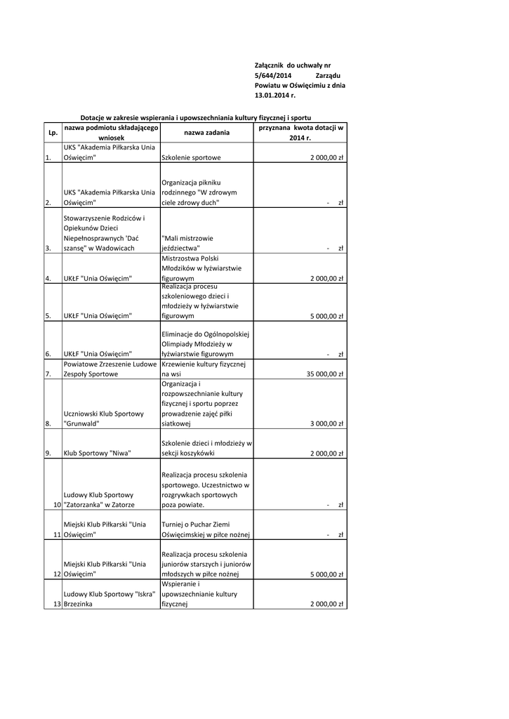 Załącznik do uchwały nr 5/644/2014 Zarządu Powiatu w Oświęcimiu z dnia 13.01.2014 r. Dotacje w zakresie wspierania i upowszechniania kultury fizycznej i sportu nazwa podmiotu składającego przyznana kwota dotacji w Lp. nazwa zadania wniosek 2014 r. UKS "Akademia Piłkarska Unia 1. Oświęcim" Szkolenie sportowe 2 000,00 zł 2. Organizacja pikniku UKS "Akademia Piłkarska Unia rodzinnego "W zdrowym Oświęcim" ciele zdrowy duch" - zł 3. Stowarzyszenie Rodziców i Opiekunów Dzieci Niepełnosprawnych 'Dać szansę" w Wadowicach - zł 4. UKŁF "Unia Oświęcim" 5. UKŁF "Unia Oświęcim" "Mali mistrzowie jeździectwa" Mistrzostwa Polski Młodzików w łyżwiarstwie figurowym Realizacja procesu szkoleniowego dzieci i młodzieży w łyżwiarstwie figurowym 8. Eliminacje do Ogólnopolskiej Olimpiady Młodzieży w UKŁF "Unia Oświęcim" łyżwiarstwie figurowym Powiatowe Zrzeszenie Ludowe Krzewienie kultury fizycznej Zespoły Sportowe na wsi Organizacja i rozpowszechnianie kultury fizycznej i sportu poprzez Uczniowski Klub Sportowy prowadzenie zajęć piłki "Grunwald" siatkowej 9. Klub Sportowy "Niwa" 6. 7. 2 000,00 zł 5 000,00 zł - zł 35 000,00 zł 3 000,00 zł Szkolenie dzieci i młodzieży w sekcji koszykówki 2 000,00 zł Ludowy Klub Sportowy 10 "Zatorzanka" w Zatorze Realizacja procesu szkolenia sportowego. Uczestnictwo w rozgrywkach sportowych poza powiate. - zł Miejski Klub Piłkarski "Unia 11 Oświęcim" Turniej o Puchar Ziemi Oświęcimskiej w piłce nożnej - zł Realizacja procesu szkolenia juniorów starszych i juniorów młodszych w piłce nożnej Wspieranie i Ludowy Klub Sportowy "Iskra" upowszechnianie kultury 13 Brzezinka fizycznej Miejski Klub Piłkarski "Unia 12 Oświęcim" 5 000,00 zł 2 000,00 zł Uczniowski Klub Hokejowy 14. Kobiet "Unia Oświęcim" Prowadzenie szkolenia młodzieży żeńskiej w zakresie gry hokeja na lodzie. Rozgrywanie meczy w PLH na lodzie kobiet-ekstraliga oraz w Pucharze Polski 4 000,00 zł Uczniowski Klub Pływacki 15. "Unia" w Oświęcimiu Nauka pływania i szkolenie sportowe osób niepełnosprawnych 6 000,00 zł Uczniowski Klub Pływacki 16. "Unia" w Oświęcimiu Szkolenie sportowe młodzieży oraz udział w Mistrzostwach Polski Juniorów w pływaniu 37 000,00 zł Powiatowy Szkolny Związek Sportowy w Oświęcimiu Upowszechnianie kultury fizycznej i sportu wśród młodzieży szkolnej powiatu oświęcimskiego 35 000,00 zł Uczniowski Klub Sportowy "Sokół" w Zatorze Realizacja i wdrożenie systemu szkolenia w zakresie Kolarstwa oraz Piłki Siatkowej opartego na programie autorskim: "I Ty możesz zostać Mistrzem Olimpijskim…" 17. 18. Uczniowski Międzyszkolny Klub 19 Sportowy "Kęczanin" Piłka siatkowa Podniesienie poziomu sportowego drużyn uczestniczących w 20 Ludowy Klub Sportowy "Niwa" rozgrywkach związkowych UKS Akademia Piłkarska 21 Oświęcim Realizacja procesu szkolenia Klub Sportowy "Górnik" 22 Brzeszcze LKS "Poręba" w Porębie 23 Wielkiej Upowszechnianie kultury fizycznej i sportu na terenie Powiatu Oświęcimskiego Realizacja procesu szkolenia sportowego Międzyszkolny Klub Sportowy 24 Tempo Kęty Przygotowanie czołowych lekkoatletów MKS Tempo Kęty do staru w Mistrzostwach Polski i innych imprezach mistrzowskich Uczniowski Klub Sportowy 25 "Ósemka" Uczniowski Klub Sportowy 26 "Sokół" w Kętach Mikołajkowe Mistrzostwa UKS "Ósemka" Oświęcim Szkolenie oraz udział w zawodach zawodników w kolarstwie górskim i szosowym Uczniowski Klub Sportowy 27 "Setbol" Oświęcim Szkolenie sportowe piłki siatkowej Uczniowski Klub Hokejowy 28 Unia Oświęcim Szkolenie sportowe dzieci i młodzieży w hokeju na lodzie Realizacja procesu szkolenia Ludowy Klub Sportowy"Korona dzieci i młodzieży w piłce 29 Harmęże" nożnej 3 000,00 zł 10 000,00 zł 2 960,00 zł 2 000,00 zł 2 000,00 zł - zł 2 000,00 zł 2 000,00 zł 5 540,00 zł 2 500,00 zł 30 000,00 zł - zł SUMA 200 000,00 zł