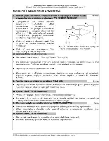 3ROLWHFKQLNDOVNDZ*OLZLFDFK:\G]LDá$(L,,QVW\WXW(OHNWURQLNL .LHUXQHN(OHNWURQLNDL7HOHNRPXQLNDFMD/DERUDWRULXP8NáDGyZ$QDORJRZ\FKVHPHVWU,9 ûZLF]HQLH:]PDFQLDF]HSU]\U]GRZH 3RPLDU SRGVWDZRZ\FK FKDUDNWHU\VW\N VWDW\F]Q\FK Z]PDFQLDF]D SU]\U]GRZHJRRSDUWHJRQDMHGQ\P:22%2:,=.2:( x x =DSURMHNWRZDü W]Q GREUDü ZDUWRFL UH]\VWRUyZ 5555 XNáDG Z]PDFQLDF]D Uy*QLFRZHJR R Z]PRFQLHQLX QD MHGQ\P Z]PDFQLDF]X RSHUDF\MQ\P D QDVW SQLH ]EXGRZDü WHQ XNáDGU\V'RZHMüGRáF]\üQDSL FLH ] ]DGDMQLND RUD] SU]\áF]\ü ZROWRPLHU]H GRRE\GZXZHMüRUD]Z\MFLD =PLHU]\ü VWDW\F]QH FKDUDNWHU\VW\NL 8Z\ I8U GOD GZyFK ZDUWRFL QDSL FLD ZVSyOQHJR =PLHU]\ü VWDW\F]Q FKDUDNWHU\VW\N 8Z\ I8F SU]\]ZDUW\FKZHMFLDFK :VSUDZR]GDQLXLQDNRORNZLXP x 8 1DU\VRZDüFKDUDNWHU\VW\NL8Z\ I8URUD] 8Z\ I8F x :\]QDF]\üZDUWRüZVSyáF]\QQLND&055 x 5 5 1D SRGVWDZLH RWU]\PDQ\FK Z\NUHVyZ RNUHOLü ZDUWRü Z]PRFQLHQLD Uy*QLFRZHJR NU RUD] VXPDF\MQHJRNV3RUyZQDüX]\VNDQHZDUWRFL]ZDUWRFLDPLRF]HNLZDQ\PL =DSR]QDQLH VL ] XNáDGHP Z]PDFQLDF]D Uy*QLFRZHJR RUD] SRGVWDZRZ\PL SRM FLDPL QDSL FLH ZVSyOQH QDSL FLH Uy*QLFRZH Z]PRFQLHQLH ZVSyOQH Z]PRFQLHQLH Uy*QLFRZH &055 3RPLDUQDSL FLDQLH]UyZQRZD*HQLDSNW x 82 5\V :]PDFQLDF] Uy*QLFRZ\ RSDUW\ QD MHGQ\PZ]PDFQLDF]XRSHUDF\MQ\P x x 5 5 8 PLQ PLQ :\]QDF]\ü QDSL FLH QLH]UyZQRZD*HQLD Z]PDFQLDF]D Uy*QLFRZHJR SU]H] SRPLDU QDSL FLD Z\MFLRZHJRSU]\RE\GZXZHMFLDFK]ZDUW\FK]PDV :VSUDZR]GDQLXLQDNRORNZLXP x x :\]QDF]\üQDSL FLHQLH]UyZQRZD*HQLDZ]PDFQLDF]DUy*QLFRZHJR 3R]QDQLHSRM FLDQDSL FLDQLH]UyZQRZD*HQLDZ]PDFQLDF]DUy*QLFRZHJRRUD]SRZL]DQLHJR ]QDSL FLHPQLH]UyZQRZD*HQLDZ]PDFQLDF]DRSHUDF\MQHJR PLQ &KDUDNWHU\VW\NDF] VWRWOLZRFLRZD2%2:,=.2:( x x 1DZHMFLHZVND]DQHSU]H]SURZDG]FHJRSRGDüSU]HELHJVLQXVRLGDOQ\]JHQHUDWRUD =GMü DPSOLWXGRZ FKDUDNWHU\VW\N F] VWRWOLZRFLRZ Z]PRFQLHQLD ZVSyOQHJR RUD] Z]PRFQLHQLDUy*QLFRZHJR :VSUDZR]GDQLXLQDNRORNZLXP x x 1DU\VRZDüFKDUDNWHU\VW\NLF] VWRWOLZRFLRZHZVNDOLORJDU\WPLF]QHM 3R]QDQLHSU]\F]\Q\VSDGNX&055]HZ]URVWHPF] VWRWOLZRFL 0DWHULDá\G\GDNW\F]QH,QVW\WXWX(OHNWURQLNL3ROLWHFKQLNLOVNLHM*OLZLFH.ZLHFLH ZHU 3ROLWHFKQLNDOVNDZ*OLZLFDFK:\G]LDá$(L,,QVW\WXW(OHNWURQLNL .LHUXQHN(OHNWURQLNDL7HOHNRPXQLNDFMD/DERUDWRULXP8NáDGyZ$QDORJRZ\FKVHPHVWU,9 'REyU ZDUWRFL UH]\VWDQFML 5 Z XNáDG]LH Z]PDFQLDF]D SRPLDURZHJRRSDUWHJRQDGZyFK:22%2:,=.2:( PLQ 5* =EXGRZDü Z]PDFQLDF] SU]\U]GRZ\ QD GZyFK Z]PDFQLDF]DFK RSHUDF\MQ\FK 5 5 5 5 U\V -HGHQ ] UH]\VWRUyZ WM 5 ZáF]RQ\ PL G]\ ZHMFLH RGZUDFDMFH SLHUZV]HJRZ]PDFQLDF]DRSHUDF\MQHJRD PDV ]DVWSLü SUHF\]\MQ RSRUQLF : : GHNDGRZ 1D ]ZDUWH ZHMFLD SRGDü 82 8U 8U 8 8 V\JQDáVLQXVRLGDOQ\ 8V x 1D RSRUQLF\ GREUDü ZDUWRü UH]\VWDQFML SU]\ NWyUHM Z]PRFQLHQLH ZVSyOQH MHVW PLQLPDOQHPDNV\PDOQ\&055 5\V :]PDFQLDF] Uy*QLFRZ\ RSDUW\ QD GZyFK Z]PDFQLDF]DFKRSHUDF\MQ\FK :VSUDZR]GDQLXLQDNRORNZLXP x x x 3RUyZQDQLHZDUWRFLUH]\VWDQFML5 ]ZDUWRFL WHRUHW\F]Q 8ZLDGRPLHQLH NRQLHF]QRFL GRNáDGQHJR GRERUX VWRVXQNyZ UH]\VWDQFML Z FHOX X]\VNDQLD RGSRZLHGQLRGX*HMZDUWRFL&055 &KDUDNWHU\VW\NDF] VWRWOLZRFLRZDZ]PDFQLDF]DUy*QLFRZHJR RSDUWHJRQDGZyFK:22%2:,=.2:( x PLQ 3RZWyU]\ü SRPLDU\ ] SXQNWX GOD XNáDGX Z]PDFQLDF]D Uy*QLFRZHJR RSDUWHJR QD GZyFK Z]PDFQLDF]DFKRSHUDF\MQ\FK :VSUDZR]GDQLXLQDNRORNZLXP x 1DU\VRZDüFKDUDNWHU\VW\NLF] VWRWOLZRFLRZHZVNDOLORJDU\WPLF]QHM x 3RZWyU]\üSRPLDU\]SXQNWXGODXNáDGXRGZyFKZ]PDFQLDF]DFKRSHUDF\MQ\FK x 1DU\VRZDüFKDUDNWHU\VW\NL8Z\ I8URUD] 8Z\ I8F 3RPLDU SRGVWDZRZ\FK FKDUDNWHU\VW\N VWDW\F]Q\FK Z]PDFQLDF]D SU]\U]GRZHJRRSDUWHJRQDGZyFK:22%2:,=.2:( PLQ :VSUDZR]GDQLXLQDNRORNZLXP x 1D SRGVWDZLH RWU]\PDQ\FK Z\NUHVyZ RNUHOLü ZDUWRü Z]PRFQLHQLD Uy*QLFRZHJR NU RUD] VXPDF\MQHJRNV3RUyZQDüX]\VNDQHZDUWRFL]ZDUWRFLDPLRF]HNLZDQ\PL x :\]QDF]\üZDUWRüZVSyáF]\QQLND&055 :Sá\ZUH]\VWRUD5* QDSDUDPHWU\Z]PDFQLDF]DUy*QLFRZHJR SNW x PLQ =H Z]PDFQLDF]D ] U\VXQNX X]\VNDü Z]PDFQLDF] SU]\U]GRZ\ R Z]PRFQLHQLX MDNL SRZLQLHQE\üUH]\VWRU5*DE\ X]\VNDü WRZ]PRFQLHQLH"3RZWyU]\üSRPLDU\ ]SXQNWX &]\UH]\VWRU5* ZSá\ZDQDZ]PRFQLHQLHZVSyOQHF]\W\ONRQDUy*QLFRZH" :VSUDZR]GDQLXLQDNRORNZLXP x 1DU\VRZDüFKDUDNWHU\VW\NL8Z\ I8URUD] 8Z\ I8F x :\]QDF]\üZDUWRüZVSyáF]\QQLND&055 x 1D SRGVWDZLH RWU]\PDQ\FK Z\NUHVyZ RNUHOLü ZDUWRü Z]PRFQLHQLD Uy*QLFRZHJR NU RUD] VXPDF\MQHJRNV3RUyZQDüX]\VNDQHZDUWRFL]ZDUWRFLDPLRF]HNLZDQ\PL 0DWHULDá\G\GDNW\F]QH,QVW\WXWX(OHNWURQLNL3ROLWHFKQLNLOVNLHM*OLZLFH.ZLHFLH ZHU 3ROLWHFKQLNDOVNDZ*OLZLFDFK:\G]LDá$(L,,QVW\WXW(OHNWURQLNL .LHUXQHN(OHNWURQLNDL7HOHNRPXQLNDFMD/DERUDWRULXP8NáDGyZ$QDORJRZ\FKVHPHVWU,9 3RPLDUQDSL FLDQLH]UyZQRZD*HQLDSNW x PLQ 3RZWyU]\ü SRPLDU ] SXQNWX GOD XNáDGX Z]PDFQLDF]D ]EXGRZDQHJR QD GZyFK :2 ] GRáF]RQ\PUH]\VWRUHP5* RUD]EH]QLHJR :VSUDZR]GDQLXLQDNRORNZLXP x :\]QDF]\üQDSL FLHQLH]UyZQRZD*HQLDZ]PDFQLDF]DUy*QLFRZHJR x =PLHQLüQDVWDZ RSRUQLF\5 R :Sá\Z WROHUDQFML UH]\VWRUD 5 QD ZDUWRü Z]PRFQLHQLD VXPDF\MQHJR Z]PDFQLDF]D Uy*QLFRZHJR RSDUWHJR QD GZyFK :2 2%2:,=.2:( x PLQ =PLHU]\üFKDUDNWHU\VW\N 8Z\ I8F SU]\]ZDUW\FKZHMFLDFKEH]GRáF]RQHJR5* L]GRáF]RQ\P5* !SXQNW :VSUDZR]GDQLXLQDNRORNZLXP x 1DU\VRZDüFKDUDNWHU\VW\NL8Z\ I8F x 2NUHOHQLHLORFLRZHJR]ZL]NXSRPL G]\WROHUDQFM UH]\VWRUD5 DZDUWRFL &055 :\]QDF]HQLH GRSXV]F]DOQHJR ]DNUHVX QDSL FLD ZVSyOQHJR PLQ 2%2:,=.2:( x :\]QDF]\ü ]DNUHV QDSL ü ZVSyOQ\FK Z NWyU\P XNáDG PR*H SUDFRZDü ] Z\MFLRZ DPSOLWXG UyZQ SHáQHJRZ\VWHURZDQLD :VSUDZR]GDQLXLQDNRORNZLXP x =F]HJRZ\QLNDRJUDQLF]HQLHGRSXV]F]DOQHJR]DNUHVXQDSL FLDZVSyOQHJR" 3RPLDU SRGVWDZRZ\FK FKDUDNWHU\VW\N VWDW\F]Q\FK Z]PDFQLDF]D PLQ SU]\U]GRZHJRRSDUWHJRQDWU]HFK:22%2:,=.2:( x =EXGRZDü Z]PDFQLDF] SU]\U]GRZ\ R ZH 5 5 Z]PRFQLHQLX QD WU]HFK Z]PDFQLDF]DFK RSHUDF\MQ\FK U\V 8 : -DNL SRZLQLHQ E\ü UH]\VWRU 5* E\ 5 X]\VNDü WR Z]PRFQLHQLH" 3RZWyU]\ü : SRPLDU\]SXQNWX 5* 5 ZH : 5 5 82 8 :VSUDZR]GDQLXLQDNRORNZLXP 5\V :]PDFQLDF] Uy*QLFRZ\ RSDUW\ QD WU]HFK :2 x 1DU\VRZDüFKDUDNWHU\VW\NL8Z\ I8URUD] 8Z\ I8F x :\]QDF]\üZDUWRüZVSyáF]\QQLND&055 x 1D SRGVWDZLH RWU]\PDQ\FK Z\NUHVyZ RNUHOLü ZDUWRü Z]PRFQLHQLD Uy*QLFRZHJR NU RUD] VXPDF\MQHJRNV3RUyZQDüX]\VNDQHZDUWRFL]ZDUWRFLDPLRF]HNLZDQ\PL 0DWHULDá\G\GDNW\F]QH,QVW\WXWX(OHNWURQLNL3ROLWHFKQLNLOVNLHM*OLZLFH.ZLHFLH ZHU 3ROLWHFKQLNDOVNDZ*OLZLFDFK:\G]LDá$(L,,QVW\WXW(OHNWURQLNL .LHUXQHN(OHNWURQLNDL7HOHNRPXQLNDFMD/DERUD