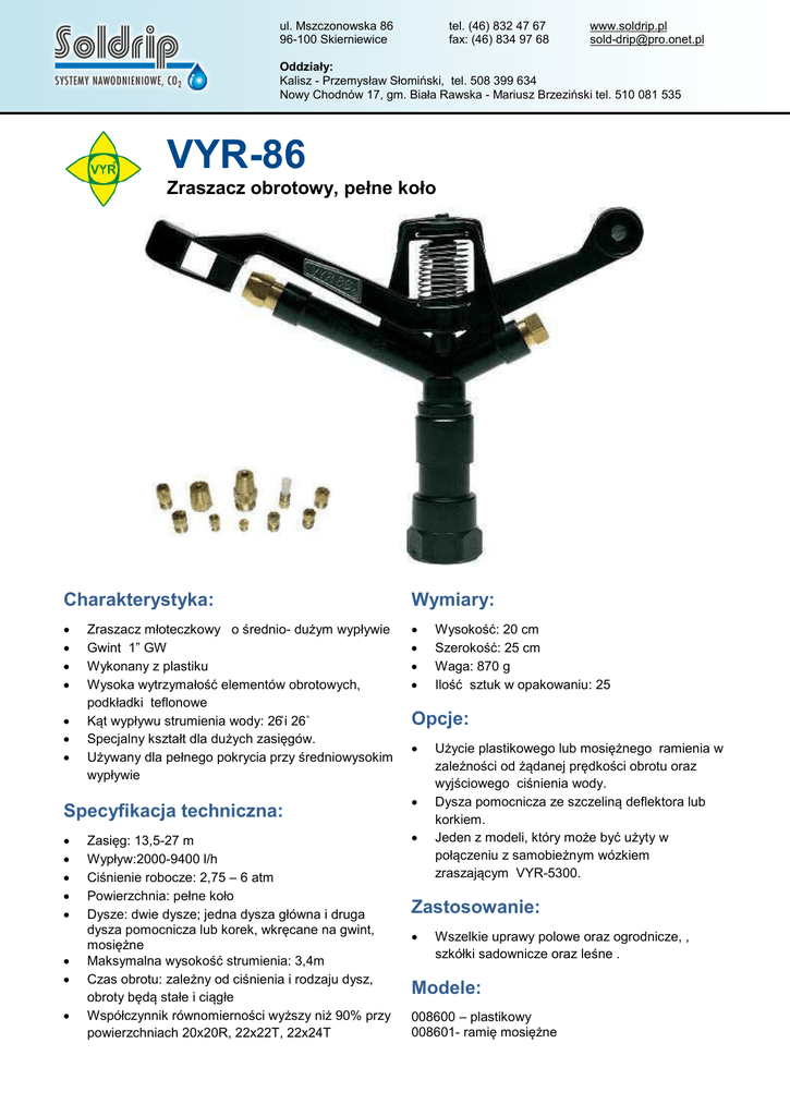 ul. Mszczonowska 86 96-100 Skierniewice tel. (46) 832 47 67 fax: (46) 834 97 68 www.soldrip.pl [email protected] Oddziały: Kalisz - Przemysław Słomiński, tel. 508 399 634 Nowy Chodnów 17, gm. Biała Rawska - Mariusz Brzeziński tel. 510 081 535 VYR-86 Zraszacz obrotowy, pełne koło Charakterystyka: • • • • • • • Zraszacz młoteczkowy o średnio- dużym wypływie Gwint 1” GW Wykonany z plastiku Wysoka wytrzymałość elementów obrotowych, podkładki teflonowe Kąt wypływu strumienia wody: 26˚i 26˚ Specjalny kształt dla dużych zasięgów. Używany dla pełnego pokrycia przy średniowysokim wypływie Specyfikacja techniczna: • • • • • • • • Zasięg: 13,5-27 m Wypływ:2000-9400 l/h Ciśnienie robocze: 2,75 – 6 atm Powierzchnia: pełne koło Dysze: dwie dysze; jedna dysza główna i druga dysza pomocnicza lub korek, wkręcane na gwint, mosiężne Maksymalna wysokość strumienia: 3,4m Czas obrotu: zależny od ciśnienia i rodzaju dysz, obroty będą stałe i ciągłe Współczynnik równomierności wyższy niż 90% przy powierzchniach 20x20R, 22x22T, 22x24T Wymiary: • • • • Wysokość: 20 cm Szerokość: 25 cm Waga: 870 g Ilość sztuk w opakowaniu: 25 Opcje: • • • Użycie plastikowego lub mosiężnego ramienia w zależności od żądanej prędkości obrotu oraz wyjściowego ciśnienia wody. Dysza pomocnicza ze szczeliną deflektora lub korkiem. Jeden z modeli, który może być użyty w połączeniu z samobieżnym wózkiem zraszającym VYR-5300. Zastosowanie: • Wszelkie uprawy polowe oraz ogrodnicze, , szkółki sadownicze oraz leśne . Modele: 008600 – plastikowy 008601- ramię mosiężne Części składowe zraszacza Rozkład opadu na poszczególnych deszczomierzach Graficzny rozkład opadu wody ze zraszacza Deszczomierz opad (mm/h) odległość od zraszacza 1 2 3 4 5 6 7 8 9 10 11 12 13 14 15 16 17 18 19 20 21 22 23 24 25 26 27 28 29 30 13.70 11.40 11.20 8.10 7.00 7.50 7.40 8.10 8.50 8.50 7.90 7.60 7.40 7.00 6.40 5.40 4.70 4.20 3.90 3.70 3.6 3.2 2.9 2.6 2.2 1.9 1.5 1.1 0.6 0.3 0.62 1.24 1.86 2.48 3.10 3.72 4.34 4.96 5.58 6.20 6.82 7.44 8.06 8.68 9.30 9.92 10.54 11.16 11.78 12.40 13.02 13.64 14.26 14.88 15.50 16.12 16.74 17.36 17.98 18.60 15 opad wody w mm/h 10 5 0 1 4 7 10 13 16 19 22 25 28 nr deszczomierza, pluwiometra Standard - zalecane dysze 7/32” 5.55 mm. 1/4” 6.35 mm. 9/32 ” 7.14 mm. 5/16” 7.93 mm. 11/32” 8.73 mm. 3/8” 9.52 mm. Bar L/h Øm L/h Øm L/h Øm L/h Øm L/h Øm L/h Øm 2.80 1,998 36.80 2,611 39.00 3,314 39.60 4,018 40.26 4,790 41.40 5,540 44.22 3.15 2,134 37.40 2,769 39.80 3,518 40.80 4,290 41.48 5,110 43.20 5,902 46.00 3.50 2,240 38.00 2,920 40.80 3,700 42.00 4,540 42.70 5,400 45.00 6,240 47.88 4.20 2,470 39.20 3,220 42.20 4,080 43.80 4,994 45.14 5,940 47.40 6,940 50.30 4.55 2,588 39.80 3,360 43.20 4,268 44.80 5,221 43.36 6,220 48.80 7,265 50.90 5.60 2,860 42.60 3,740 46.00 4,740 47.40 5,834 49.10 6,940 52.40 8,100 55.20 7/32 x 11/64” 5.55 x 4.36 mm. Øm 1/4 x 11/64” 6.35 x 4.36 mm. 1/4 x 3/16” 6.35 x 4.76 mm. 9/32 x 3/16” 7.14 x 4.76 mm. 9/32 x 7/32” 7.14 x 5.55 mm. L/h 11/32 x 7/32” 8.73 x 5.55 mm. Bar L/h L/h Øm L/h Øm L/h Øm Øm L/h Øm 2.80 3,200 3,780 39 4,030 39 4,610 39.60 39.60 6,520 41.40 3.15 3,460 4,030 39.80 4,280 39.80 4,900 40.80 40.80 6,980 43.20 3.50 3,540 4,280 40.80 4,540 40.80 5,180 42 42 7,340 45 4.20 3,960 4,680 42.20 5,000 42.20 5,720 43.80 43.80 8,100 47.40 4.55 4,140 4,930 43.20 5,180 43.20 5,980 44.80 44.80 8,420 48.80 5.60 4,610 5,440 46 5,800 46 6,620 47.40 47.40 9,400 52.40 Dla optymalnego użycia unikać parametrów z zacienionych pól tabeli Zraszacze są wyposażone w dysze standardowe, chyba że są inne określone przy zamówieniu W przypadku obliczania wypływu należy zsumować wypływy dwóch dysz. Zakres dyszy pomocniczej musi być mniejszy niż dyszy głównej.