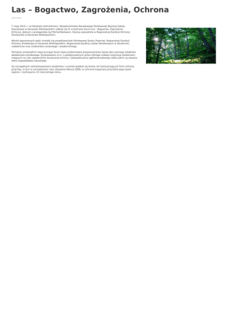 Las – Bogactwo, Zagrożenia, Ochrona 2015-05-08 7 maja 2015 r. na Wydziale Administracji i Bezpieczeństwa Narodowego Państwowej Wyższej Szkoły Zawodowej w Gorzowie Wielkopolskim odbyło się IV uczelniane forum Las – Bogactwo, Zagrożenia, Ochrona. Jednym z prelegentów był Michał Bielewicz, Starszy specjalista w Regionalnej Dyrekcji Ochrony Środowiska w Gorzowie Wielkopolskim. Wśród zaproszonych gości znaleźli się przedstawiciele Państwowej Straży Pożarnej, Regionalnej Dyrekcji Ochrony Środowiska w Gorzowie Wielkopolskim, Regionalnej Dyrekcji Lasów Państwowych w Szczecinie, nadleśnictw oraz środowiska naukowego i akademickiego. Tematem przewodnim tegorocznego forum była problematyka bezpieczeństwa lasów jako ważnego składnika dziedzictwa narodowego. Dyskutowano m.in. o podejmowanych przez różnego rodzaju instytucje działaniach, mających na celu zapewnienie skutecznej ochrony i zabezpieczenia ogólnonarodowego dobra jakim są obszary leśne województwa lubuskiego. Ze szczególnym zainteresowaniem studentów i uczniów spotkał się temat roli funkcjonujących form ochrony przyrody, w tym w szczególności sieci obszarów Natura 2000, w ochronie bogactwa przyrodniczego lasów regionu i zachowaniu ich naturalnego stanu.