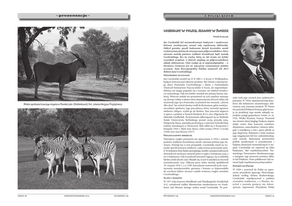 * prezentacje * Nieznany w Polsce, sławny w świecie Witold Iwańczak Bliskie spotkania trzeciego stopnia w iThemba Labs (Stellenbosch). Fot. Jolanta Mesjasz-Przybyłowicz strona 26 wrzesień/październik 2014 dwukropek 159 Jan Czochralski był niezmordowanym badaczem i naukowcem, któremu zawdzięczamy niemal całą współczesną elektronikę. Odkrył genialny sposób hodowania dużych kryształów metali (wykorzystany później do otrzymywania półprzewodników), który nazwano metodą pomiaru szybkości krystalizacji bądź metodą Czochralskiego. Bez tej wiedzy, którą on dał światu nie byłoby wszystkich urządzeń, w których znajdują się półprzewodnikowe układy elektroniczne. Choć wydaje się to nieprawdopodobne – w literaturze światowej jest on najczęściej wymienianym polskim uczonym. Sejm Rzeczypospolitej Polskiej ustanowił rok 2013 Rokiem Jana Czochralskiego. Niepokorny kcynianin Jan Czochralski urodził się 23 X 1885 r. w Kcyni w Wielkopolsce, będącej wówczas pod zaborem pruskim. Był ósmym z dziesięciorga dzieci Franciszka Czochralskiego i Marty z Suchomskich. Ukończył Seminarium Nauczycielskie w Kcyni, ale najprawdopodobniej, nie mogąc pogodzić się z ocenami, nie odebrał świadectwa maturalnego. Fakt ten bardzo utrudnił mu później karierę naukową. Wówczas jednak nie przejmował się tym zupełnie zajmując się chemią i robiąc w domu różne eksperymenty, których efekty tak zirytowały jego ojca Franciszka, że postawił mu warunek: „chemia albo dom”. Jan wybrał chemię i trafił do Krotoszyna, gdzie został pomocnikiem aptekarza. Jego pracodawca, który zauważył ogromne zdolności chłopca, wysłał go do Berlina. Tam pracował najpierw w aptece, a później w firmach Kunheim & Co oraz Allgemeine Elektricitäts Gesellschaft. Na koncertach odbywających się na Wydziale Sztuki Uniwersytetu Berlińskiego poznał swoją przyszłą żonę, Margueritę Haase, pianistkę pochodzącą z zamożnej holenderskiej rodziny mieszkającej w Niemczech. Ślub odbył się w Koepenick 2 listopada 1910 r. Mieli troje dzieci: córki Leonię (1914) i Cecylię (1920) oraz syna Borysa (1917). Ponadczasowe odkrycie Największy rozgłos przyniosła mu opracowana w 1916 r. metoda pomiaru szybkości krystalizacji metali, nazwana później jego imieniem. Pomógł mu w tym przypadek. Czochralski starał się wymyślić sposób pomiaru szybkości, z jaką tworzą się kryształy metali. Po kolejnym dniu badań sporządzając notatki z przeprowadzonych doświadczeń niechcący zanurzył pióro w tyglu z roztopioną cyną, a nie w kałamarzu. Gdy je podnosił zauważył ciągnący się za stalówką bardzo cienki drucik cyny. Okazało się, że jest to pojedynczy kryształ (monokryształ) cyny. Odkrytą przez siebie metodę opublikował 19. sierpnia 1916 r., a w 1950 Amerykanie zastosowali ją do otrzymywania monokryształów germanu i krzemu co doprowadziło do rewolucji elektro¬nicznej i nadało światowy rozgłos metodzie Czochralskiego. Sława i majątek W 1917 roku koncern Metallbank und Metallurgische Gesellschaft A.G. wybudował wielkie laboratorium metaloznawcze we Frankfurcie nad Menem, którego szefem został Czochralski. Tu powDwukropek 159 stało wiele jego cennych prac naukowych i patentów. W 1924r. opatentował stop łożyskowy dla kolejnictwa niezawierający deficytowej cyny, nazwany metalem “B”. Patent ten przyniósł Polakowi fortunę, gdyż licencję na produkcję tego metalu zakupiły największe potęgi gospodarcze świata, m. in. USA, Wielka Brytania, Francja. Przyniósł mu również sławę biegłego badacza stopów dzięki czemu duże koncerny metalowe, zbrojeniowe, samochodowe i lotnicze zabiegały o współpracę z nim i sporo płaciły za jego ekspertyzy. Kolejnym z wielu ważnym jego osiągnięciem był tzw. radiomikroskop, czyli metoda skanowania powierzchni próbek metalicznych w poszukiwaniu i badaniu domieszek niemetalicznych w stopach. Czochralski nie zajmował się tylko badaniami. Był współzałożycielem Niemieckiego Towarzystwa Metaloznawczego, a następnie jego prezesem pomimo faktu, że był Polakiem. Dużo publikował i był autorem bądź współautorem podręczników. Powrót do Polski W 1928 r. powrócił do Polski na zaproszenie prezydenta Ignacego Mościckiego. Jednak według Stefana Bratkowskiego, Czochralski współpracował z polskim wywiadem wojskowym, a z Niemiec wyjechał z powodu grożącej mu dekonspiracji; zaproszenie Prezydenta Polski wrzesień/październik 2014 strona 23 KRAJOBRAZY było tylko tzw. przykrywką. W 1929 roku otrzymał doktorat honoris causa po to, by przy braku odpowiedniego wykształcenia, mógł objąć posadę profesora na Wydziale Chemii Politechniki Warszawskiej. Specjalnie dla niego został utworzony i doskonale wyposażony Instytut Metalurgii i Materiałoznawstwa, w którym wykonywano głównie zlecenia dla wojska. Czochralski zrzekł się obywatelstwa niemieckiego, by przyjąć polskie, ale takie procedury w ówczesnych Niemczech trwały nawet po kilkanaście lat. Niemieckie obywatelstwo, jak również elitarne traktowanie badań Czochralskiego przez władze państwowe doprowadziły do zawiści kolegów profesorów i do procesów sądowych, które Czochralski wygrał. Zaraz po powrocie do Ojczyzny odwiedził swoją rodzinną Kcynię, gdzie żyła jeszcze jego matka Na stałe zamieszkał w Warszawie w willi przy ul. Nabielaka, a w Kcyni wybudował pełniącą funkcję letniej rezydencji willę Margowo, nazwaną tak na cześć żony. Profesor z żoną i córką Leonią Okres wojny Druga wojna światowa przerwała działalność naukową Profesora i stała się dla niego szczególnym doświadczeniem. Już 29 listopada 1939 r. Niemcy rozstrzelali Kornela Czochralskiego, jego starszego brata. Natomiast on sam podlegał różnym naciskom ze strony okupantów, którzy chcieli w nim widzieć „swojego człowieka”. Czochralski nie tylko się nie ugiął, ale wykorzys- strona 24 ta
