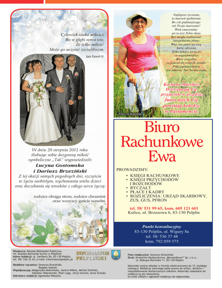 Najlepsze życzenia, to marzeń spełnienia. Bo cóż piękniejszego niż Twoje marzenia? Wiek emerytalny po to jest Tobie dany, Byś mogła realizować niespełnione plany. Więc nie patrz na swą kartę zdrowia, Tylko łykaj z życia to, co najpiękniejsze. Bierz wszystko, co jeszcze do wzięcia zostało Póki posłuszeństwa nie odmówi Twe boskie ciało. Człowiek szuka miłości, Bo w głębi serca wie, Że tylko miłość Może go uczynić szczęśliwym. Jan Paweł II Kochana Marylko! Dziś żegnają Cię przyjaciele w urzędzie, Foto: A.Raszeja W dniu 20 sierpnia 2011 roku ślubując sobie dozgonną miłość symboliczne „Tak” wypowiedzieli: Lucyna Gostomska i Dariusz Brzeziński Z tej okazji samych pogodnych dni, szczęścia w życiu osobistym, wychowania wielu dzieci oraz doczekania się wnuków z całego serca życzą: rodzice obojga stron, rodzice chrzestni oraz wszyscy goście weselni Jutro niech Cię powitają koledzy w Parlamencie. Biuro Rachunkowe Ewa PROWADZIMY: • KSIĘGI RACHUNKOWE • KSIĘGI PRZYCHODÓW I ROZCHODÓW • RYCZAŁT • PŁACE I KADRY • ROZLICZENIA: URZĄD SKARBOWY, ZUS, GUS, PFRON tel. 58/ 531 99 65, kom. 605 121 601 Kulice, ul. Brzozowa 6, 83-130 Pelplin Punkt konsultacyjny 83-130 Pelplin, ul. Wigury 8a tel. 58/ 536 37 48 kom. 792 059 575 Wydawca: Miejska Biblioteka Publiczna, im. Księdza Bernarda Sychty w Pelplinie Adres redakcji: ul. Sambora 5A, 83-130 Pelplin, tel. 58/ 536 33 43; e-mail: [email protected] Foto redakcyjne: Seweryn Brzeziński Druk: Drukarnia Wydawnictwa „Bernardinum” Sp. z o.o., ul. Biskupa Dominika 11, 83-130 Pelplin Redaktor naczelny: Seweryn Brzeziński Bogdan Solecki Współpracują: Małgorzata Mokwińska, Janina Wilkos, Michał Zieliński, Zdzisław Waśniewski, Piotr Łaga, Jerzy Serocki, Anna Świtała Sekretarz redakcji: Agnieszka Pokacka Materiały można składać w formie elektronicznej do 15. każdego miesiąca. Redakcja zastrzega sobie prawo do zmian, skrótów i niepublikowania dostarczonych tekstów. Materiały nadesłane do redakcji są jej własnością. Za treść reklam i ogłoszeń redakcja nie odpowiada. 26 INFORMATOR PELPLIŃSKI