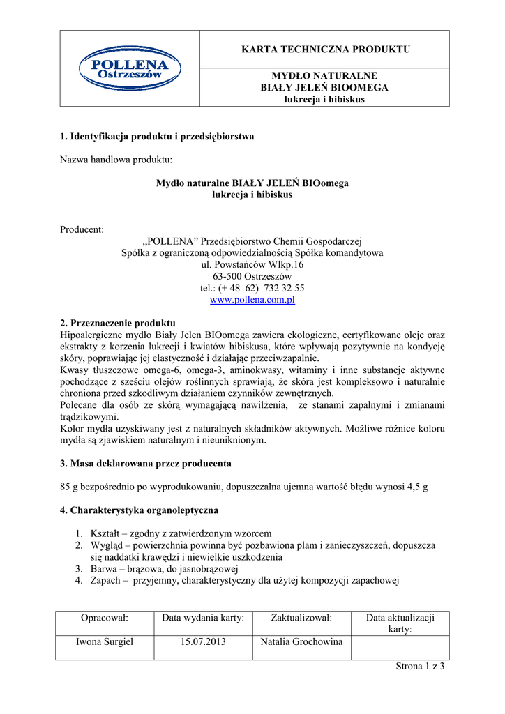 KARTA TECHNICZNA PRODUKTU MYDŁO NATURALNE BIAŁY JELEŃ BIOOMEGA lukrecja i hibiskus 1. Identyfikacja produktu i przedsiębiorstwa Nazwa handlowa produktu: Mydło naturalne BIAŁY JELEŃ BIOomega lukrecja i hibiskus Producent: „POLLENA” Przedsiębiorstwo Chemii Gospodarczej Spółka z ograniczoną odpowiedzialnością Spółka komandytowa ul. Powstańców Wlkp.16 63-500 Ostrzeszów tel.: (+ 48 62) 732 32 55 www.pollena.com.pl 2. Przeznaczenie produktu Hipoalergiczne mydło Biały Jelen BIOomega zawiera ekologiczne, certyfikowane oleje oraz ekstrakty z korzenia lukrecji i kwiatów hibiskusa, które wpływają pozytywnie na kondycję skóry, poprawiając jej elastyczność i działając przeciwzapalnie. Kwasy tłuszczowe omega-6, omega-3, aminokwasy, witaminy i inne substancje aktywne pochodzące z sześciu olejów roślinnych sprawiają, Ŝe skóra jest kompleksowo i naturalnie chroniona przed szkodliwym działaniem czynników zewnętrznych. Polecane dla osób ze skórą wymagającą nawilŜenia, ze stanami zapalnymi i zmianami trądzikowymi. Kolor mydła uzyskiwany jest z naturalnych składników aktywnych. MoŜliwe róŜnice koloru mydła są zjawiskiem naturalnym i nieuniknionym. 3. Masa deklarowana przez producenta 85 g bezpośrednio po wyprodukowaniu, dopuszczalna ujemna wartość błędu wynosi 4,5 g 4. Charakterystyka organoleptyczna 1. Kształt – zgodny z zatwierdzonym wzorcem 2. Wygląd – powierzchnia powinna być pozbawiona plam i zanieczyszczeń, dopuszcza się naddatki krawędzi i niewielkie uszkodzenia 3. Barwa – brązowa, do jasnobrązowej 4. Zapach – przyjemny, charakterystyczny dla uŜytej kompozycji zapachowej Opracował: Data wydania karty: Zaktualizował: Iwona Surgiel 15.07.2013 Natalia Grochowina Data aktualizacji karty: Strona 1 z 3 KARTA TECHNICZNA PRODUKTU MYDŁO NATURALNE BIAŁY JELEŃ BIOOMEGA lukrecja i hibiskus 5. Składniki Sodium Tallowate, Sodium Cocoate, Aqua, Sorbitol, Glycerin, Propylene Glycol, Quercus Robur Bark Extract, Parfum, Cucurbita Pepo Seed Oil, Oenothera Biennis Oil, Nigella Sativa Seed Oil, Cannabis Sativa Seed Oil, Perilla Ocymoides Seed Oil, Rosa Canina Fruit Oil, Glycyrrhiza Glabra Root Extract, Hibiscus Sabdariffa Flower Extract, Sodium Chloride, Sodium Hydroxide, Tetrasodium Etidronate. 6. Parametry fizykochemiczne 1. Całkowita zawartość kwasów tłuszczowych łącznie z Ŝywicznymi, % (m/m), nie mniej niŜ 2. Zawartość wolnych alkaliów Ŝrących w przeliczeniu na NaOH, % (m/m), nie więcej niŜ 3. Liczba zobojętnienia wydzielonych kwasów tłuszczowych łącznie z Ŝywicznymi, mg KOH/g, nie mniejsza niŜ - 71 - 0,10 - 196 7. Okres trwałości 3 lata od daty produkcji. Po tym okresie moŜe być stosowany po sprawdzeniu zgodności parametrów z wymaganiami normy zakładowej ZN. 8. Przechowywanie Temperatura powietrza w suchych, krytych i czystych pomieszczeniach nie powinna być niŜsza niŜ 5 ºC i nie wyŜsza niŜ 35 ºC, a wilgotność względna powietrza nie powinna przekraczać 70 %. 9. Sposób uŜycia Nanieść mydło na zabrudzone ręce i spłukać wodą. 10. Uzyskane atesty Produkt posiada Ocenę Bezpieczeństwa Kosmetyku i badania dermatologiczne. Notyfikacja CPNP (Cosmetic Products Notification Portal) - Nr referencyjny: 1471930 PKWiU: 20.42.19.0 Opracował: Data wydania karty: Zaktualizował: Iwona Surgiel 15.07.2013 Natalia Grochowina Data aktualizacji karty: Strona 2 z 3 KARTA TECHNICZNA PRODUKTU MYDŁO NATURALNE BIAŁY JELEŃ BIOOMEGA lukrecja i hibiskus Opracował: Data wydania karty: Zaktualizował: Iwona Surgiel 15.07.2013 Natalia Grochowina Data aktualizacji karty: Strona 3 z 3