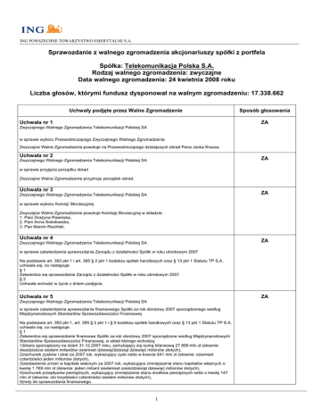 ING POWSZECHNE TOWARZYSTWO EMERYTALNE S.A. Sprawozdanie z walnego zgromadzenia akcjonariuszy spółki z portfela Spółka: Telekomunikacja Polska S.A. Rodzaj walnego zgromadzenia: zwyczajne Data walnego zgromadzenia: 24 kwietnia 2008 roku Liczba głosów, którymi fundusz dysponował na walnym zgromadzeniu: 17.338.662 Uchwały podjęte przez Walne Zgromadzenie Sposób głosowania ZA Uchwała nr 1 Zwyczajnego Walnego Zgromadzenia Telekomunikacji Polskiej SA w sprawie wyboru Przewodniczącego Zwyczajnego Walnego Zgromadzenia Zwyczajne Walne Zgromadzenie powołuje na Przewodniczącego dzisiejszych obrad Pana Jacka Krausa. Uchwała nr 2 ZA Zwyczajnego Walnego Zgromadzenia Telekomunikacji Polskiej SA w sprawie przyjęcia porządku obrad Zwyczajne Walne Zgromadzenie przyjmuje porządek obrad. Uchwała nr 3 ZA Zwyczajnego Walnego Zgromadzenia Telekomunikacji Polskiej SA w sprawie wyboru Komisji Skrutacyjnej Zwyczajne Walne Zgromadzenie powołuje Komisję Skrutacyjną w składzie: 1. Pani Grażyna Pawińska, 2. Pani Anna Sokołowska, 3. Pan Marcin Rosiński. Uchwała nr 4 ZA Zwyczajnego Walnego Zgromadzenia Telekomunikacji Polskiej SA w sprawie zatwierdzenia sprawozdania Zarządu z działalności Spółki w roku obrotowym 2007 Na podstawie art. 393 pkt 1 i art. 395 § 2 pkt 1 kodeksu spółek handlowych oraz § 13 pkt 1 Statutu TP S.A. uchwala się, co następuje: §1 Zatwierdza się sprawozdanie Zarządu z działalności Spółki w roku obrotowym 2007. §2 Uchwała wchodzi w życie z dniem podjęcia. Uchwała nr 5 ZA Zwyczajnego Walnego Zgromadzenia Telekomunikacji Polskiej SA w sprawie zatwierdzenia sprawozdania finansowego Spółki za rok obrotowy 2007 sporządzonego według Międzynarodowych Standardów Sprawozdawczości Finansowej Na podstawie art. 393 pkt 1, art. 395 § 2 pkt 1 i § 5 kodeksu spółek handlowych oraz § 13 pkt 1 Statutu TP S.A. uchwala się, co następuje: §1 Zatwierdza się sprawozdanie finansowe Spółki za rok obrotowy 2007 sporządzone według Międzynarodowych Standardów Sprawozdawczości Finansowej, w skład którego wchodzą: 1)bilans sporządzony na dzień 31.12.2007 roku, zamykający się sumą bilansową 27 899 mln zł (słownie: dwadzieścia siedem miliardów osiemset dziewięćdziesiąt dziewięć milionów złotych), 2)rachunek zysków i strat za 2007 rok, wykazujący zysk netto w kwocie 841 mln zł (słownie: osiemset czterdzieści jeden milionów złotych), 3)zestawienie zmian w kapitale własnym za 2007 rok, wykazujące zmniejszenie stanu kapitałów własnych o kwotę 1 769 mln zł (słownie: jeden miliard siedemset sześćdziesiąt dziewięć milionów złotych), 4)rachunek przepływów pieniężnych, wykazujący zmniejszenie stanu środków pieniężnych netto o kwotę 147 mln zł (słownie: sto trzydzieści czterdzieści siedem milionów złotych), 5)noty do sprawozdania finansowego. 1 ING POWSZECHNE TOWARZYSTWO EMERYTALNE S.A. §2 Uchwała wchodzi w życie z dniem podjęcia. Uchwała nr 6 ZA Zwyczajnego Walnego Zgromadzenia Telekomunikacji Polskiej SA w sprawie podziału zysku Spółki za rok obrotowy 2007 oraz przeznaczenia części środków z kapitału zapasowego na wypłatę dywidendy Na podstawie art. 395 § 2 pkt 2 kodeksu spółek handlowych oraz § 13 pkt 2 Statutu TP S.A. uchwala się, co następuje: §1 Zysk netto Spółki za rok obrotowy 2007 w kwocie 841 474 639,92 zł. (słownie: osiemset czterdzieści jeden milionów czterysta siedemdziesiąt cztery tysiące sześćset trzydzieści dziewięć złotych dziewięćdziesiąt dwa grosze) dzieli się w sposób następujący: 1)na dywidendę - 824 645 147,13 zł (słownie: osiemset dwadzieścia cztery miliony sześćset czterdzieści pięć tysięcy sto czterdzieści siedem złotych trzynaście groszy), 2)na kapitał rezerwowy - 16 829 492,79 zł (słownie: szesnaście milionów osiemset dwadzieścia dziewięć tysięcy czterysta dziewięćdziesiąt dwa złote siedemdziesiąt dziewięć groszy). §2 1.Postanawia się część środków z kapitału zapasowego w kwocie 1 228 514 714,37 zł (słownie: jeden miliard dwieście dwadzieścia osiem milionów pięćset czternaście tysięcy siedemset czternaście złotych trzydzieści siedem groszy) przeznaczyć na wypłatę dywidendy razem z kwotą przeznaczoną na wypłatę dywidendy z zysku netto Spółki za rok obrotowy 2007, o której mowa w § 1 pkt 1. 2.Łączna kwota przeznaczona na wypłatę dywidendy wynosi 2 053 159 861,50 zł (słownie: dwa miliardy pięćdziesiąt trzy miliony sto pięćdziesiąt dziewięć tysięcy osiemset sześćdziesiąt jeden złotych pięćdziesiąt groszy), co oznacza, że kwota dywidendy przypadająca na jedną akcję wynosi 1,50 zł (słownie: jeden złoty pięćdziesiąt groszy). §3 Prawo do dywidendy przysługuje osobom, będącym akcjonariuszami Spółki w dniu 21 maja 2008 r. (dzień dywidendy). §4 Ustala się termin wypłaty dywidendy na dzień 11 czerwca 2008 r. §5 Uchwała wchodzi w życie z dniem podjęcia. Uchwała nr 7 ZA Zwyczajnego Walnego Zgromadzenia Telekomunikacji Polskiej SA w sprawie podziału zysku Spółki z lat ubiegłych Na podstawie art. 395 § 2 pkt 2 kodeksu spółek handlowych, § 13 pkt 2 Statutu TP S.A. oraz ustawy o rachunkowości z dnia 29 września 1994 roku o rachunkowości (z późn. zm.), uchwala się co następuje: §1 Zysk Spółki z lat ubiegłych w kwocie 21 918 000,00 zł. (słownie: dwadzieścia jeden milionów dziewięćset osiemnaście tysięcy złotych), wykazany w sprawozdaniu finansowym Spółki za rok obrotowy 2007 dzieli się w sposób następujący: 1)na kapitał zapasowy – 21 479 640,00 zł. (słownie: dwadzieścia jeden milionów czterysta siedemdziesiąt dziewięć tysięcy sześćset czterdzieści złotych), 2)na kapitał rezerwowy – 438 360,00 zł. (słownie: czterysta trzydzieści osiem tysięcy trzysta sześćdziesiąt złotych). §2 Uchwała wchodzi w życie z dniem podjęcia. Uchwała nr 8 ZA Zwyczajnego Walnego Zgromadzenia Telekomunikacji Polskiej S