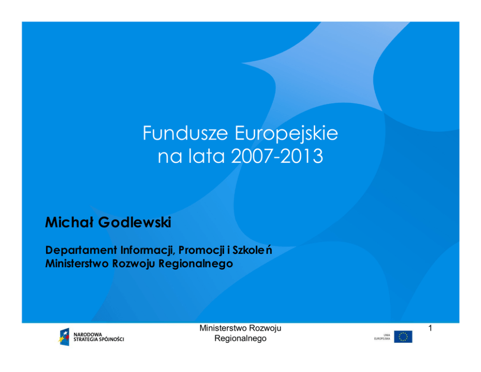 Fundusze Europejskie na lata 2007-2013 Michał Godlewski Departament Informacji, Promocji i Szkole ń Ministerstwo Rozwoju Regionalnego Ministerstwo Rozwoju Regionalnego 1 Krajowe dokumenty strategiczne NPR i NSS NPR 20042004- 2006 Narodowy Plan Rozwoju NSS 2007 - 2013 Narodowa Strategia Spójno ści Narodowe Strategiczne Ramy Odniesienia (NSRO) (NSRO) Ministerstwo Rozwoju Regionalnego 2 Polska otrzymała blisko 1/5 ogólnej sumy środków przeznaczonych na politykę spójności Unii Europejskiej w latach 2007–2013, 20042004- 2006 20072007- 2013 UE 80,6% UE 94% Polska 19,4% Polska 6% Unia Europejska (2000-2006) – 213,0 mld EUR Polska – 12,8 mld EUR Unia Europejska – 346,5 mld EUR Polska – 67,3 mld EUR Ministerstwo Rozwoju Regionalnego 3 Programy Operacyjne NPR 2004-2006 oraz NSS 2007-2013 Narodowy Plan Rozwoju 2004-2006 Narodowa Strategia Spójności 2007-2013 SPO Wzrost Konkurencyjno ści Przedsiębiorstw PO Innowacyjna Gospodarka SPO Rozwój Zasobów Ludzkich PO Kapitał Ludzki SPO Transport PO Infrastruktura i Środowisko Zintegrowany Program Operacyjny Rozwoju Regionalnego 16 Regionalnych Programów Operacyjnych PO Pomoc Techniczna SPO Restrukturyzacja i modernizacja sektora żywnościowego oraz rozwój obszar ów wiejskich SPO Rybołówstwo i przetwórstwo ryb PO Rozwój Polski Wschodniej PO Pomoc Techniczna PO Europejskiej Współpracy Terytorialnej Strategia Wykorzystania Funduszu Spójności Ministerstwo Rozwoju Regionalnego 4 System instytucjonalny NPR i NSS NSS 2007-2013 NPR 2004-2006 Minister Rozwoju Regionalnego (MRR) – pełniący funkcję Instytucji Zarządzającej dla 5 programów operacyjnych (ZPORR, SPO RZL, SPO WKP, SPOT, PO PT) Minister Rolnictwa i Rozwoju Wsi – pełniący funkcję IZ dla SPO Rybołówstwo… oraz SPO Restrukturyzacja… ministrowie sektorowi – Instytucje Pośredniczące, odpowiedzialne za wdrażanie poszczególnych priorytetów PO w ramach ZPORR 16 Instytucji Minister Rozwoju Regionalnego (MRR) – odpowiedzialny za programowanie i zarządzanie krajowymi programami rozwojowymi finansowanymi z funduszy strukturalnych i Funduszu Spójności oraz za koordynację regionalnych programów operacyjnych ministrowie sektorowi – Instytucje Pośredniczące, odpowiedzialne za wdrażanie poszczególnych priorytetów PO inne instytucje pełniące funkcję Instytucji Pośredniczących I i II stopnia Pośredniczących w urzędach wojewódzkich inne instytucje pełniące funkcje Instytucji Wdrażających Zarządy Województw Zarządzające RPO Ministerstwo Rozwoju Regionalnego – Instytucje 5 Działania i instytucje NSS 2007-2013 NPR 2004-2006 99 działań we wszystkich programach operacyjnych (łącznie z rolnictwem i rybołówstwem 123 instytucje zaangażowane we wdrażanie programów operacyjnych (Ministerstwa, Urzędy Marszałkowskie, Agencje Rządowe (np. PARP, ARiMR), Urzędy Wojewódzkie oraz NFOŚiGW 136 dział działań we wszystkich krajowych programach operacyjnych • 397 dział działań w Regionalnych Programach Operacyjnych • 149 instytucji zaangaż zaangażowanych we wdraż wdrażanie programó programów operacyjnych (Ministerstwa, Urzę Urzędy Marszał Marszałkowskie, Agencje Rzą Rządowe (np. PARP), inne instytucje podległ podległe ministrom (np. Oś Ośrodek Przetwarzania Informacji, Centrum Unijnych Projektó Projektów Transportowych, Wł Władza Wdraż Wdrażają ająca Programy Europejskie) Urzę Urzędy Wojewó Wojewódzkie (jako Instytucje Poś Pośredniczą redniczące w Certyfikacji), NFOŚ NFOŚiGW, WUPWUP- y, Polska Organizacja Turystyczna, GIKS, Urzę Urzędy Kontroli Skarbowej • Ministerstwo Rozwoju Regionalnego 6 Narodowe Strategiczne Ramy Odniesienia 20072007-2013 Czym jest polityka spójności UE? Polityka spójności wspiera działania zmierzające do wyrównania warunków ekonomicznych i społecznych we wszystkich regionach UE, a zwłaszcza do zmniejszenia różnic w poziomie rozwoju regionów oraz likwidacji zacofania najmniej uprzywilejowanych regionów i wysp, w tym obszarów wiejskich. • Cel 1 – Konwergencja – rozwój infrastruktury, potencjału gospodarczego i ludzkiego, czyli poprawa warunków wzrostu i zatrudnienia w najuboższych i słabiej rozwiniętych regionach Unii Europejskiej, • Cel 2 – Konkurencyjno ść regionalna i zatrudnienie – zmiany strukturalne ukierunkowane na zwiększenie konkurencyjności i atrakcyjności regionów oraz poprawę zatrudnienia, • Cel 3 – Europejska Współpraca Terytorialna – umacnianie współpracy transgranicznej, transnarodowej i międzyregionalnej, Ministerstwo Rozwoju Regionalnego 7 Narodowe Strategiczne Ramy Odniesienia 20072007-2013 Narodowe Strategiczne Ramy Odniesienia 2007–2013 (NSRO) to dokument, w którym każde państwo członkowskie przedstawia sposób, w jaki zamierza wykorzystać środki z funduszy strukturalnych i Funduszu Spójności, aby osiągnąć podstawowy cel unijnej polityki spójności, Ministerstwo Rozwoju Regionalnego 8 Narodowe Strategiczne Ramy Odniesienia 20072007-2013 R ez e rwa 2% PO Infras tr uk tur a i Środ owi s k o 42 % Pr ogr am y EW T 1% 16 R e gi on al nyc h Pr ogr am ów O per ac yj nyc h 2 5% PO Pom oc T e c hn ic z na 1% PO Kap itał Lud z k i 1 4% PO R oz wó j Pol s k i W s c hod ni ej 3% Ministerstwo Rozwoju Regionalnego PO Inn owac yjn a G os pod ark a 12 % 9 Narodowe Strategiczne Ramy Odniesienia 20072007-2013 – struktura organizacyjna i system wdraż wdrażania Instytucja Koordynują Koordynująca NSRO Instytucja Koordynują Koordynująca RPO Instytucje Zarzą Zarządzają dzające PO Instytucje Zarzą Zarządzają dzające RPO Instytucje Poś Pośredniczą redniczące (I stopnia) Instytucje Poś Pośredniczą redniczące (II stopnia) Beneficjenci Ministerstwo Rozwoju Regionalnego 10 Narodowe Strategiczne Ramy Odniesienia 20072007-2013 – struktura organizacyjna i system wdraż wdrażania • Instytucja Zarządzająca (IZ)- odpowiedzialna za przygotowanie i realizację programów operacyjnych (