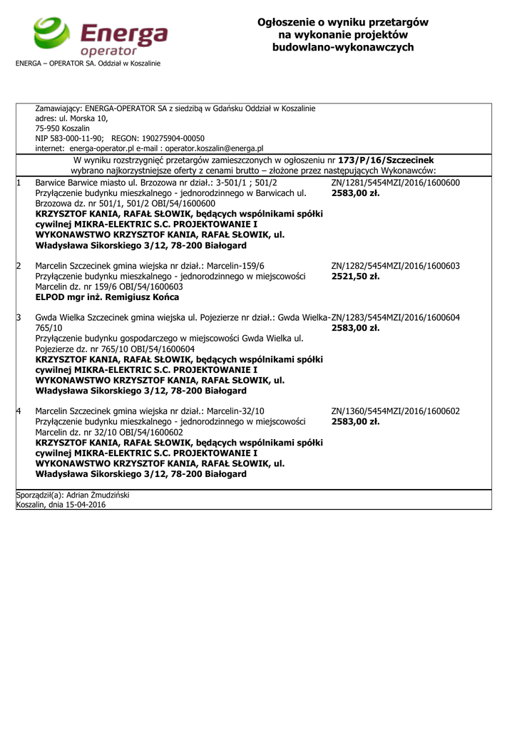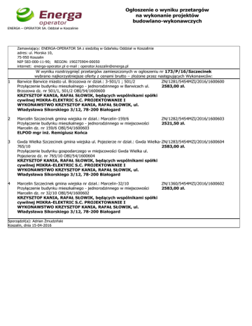 Ogłoszenie o wyniku przetargów na wykonanie projektów budowlano-wykonawczych ENERGA – OPERATOR SA. Oddział w Koszalinie Zamawiający: ENERGA-OPERATOR SA z siedzibą w Gdańsku Oddział w Koszalinie adres: ul. Morska 10, 75-950 Koszalin NIP 583-000-11-90; REGON: 190275904-00050 internet: energa-operator.pl e-mail : [email protected] 1 W wyniku rozstrzygnięć przetargów zamieszczonych w ogłoszeniu nr 173/P/16/Szczecinek wybrano najkorzystniejsze oferty z cenami brutto – złożone przez następujących Wykonawców: Barwice Barwice miasto ul. Brzozowa nr dział.: 3-501/1 ; 501/2 ZN/1281/5454MZI/2016/1600600 Przyłączenie budynku mieszkalnego - jednorodzinnego w Barwicach ul. 2583,00 zł. Brzozowa dz. nr 501/1, 501/2 OBI/54/1600600 KRZYSZTOF KANIA, RAFAŁ SŁOWIK, będących wspólnikami spółki cywilnej MIKRA-ELEKTRIC S.C. PROJEKTOWANIE I WYKONAWSTWO KRZYSZTOF KANIA, RAFAŁ SŁOWIK, ul. Władysława Sikorskiego 3/12, 78-200 Białogard 2 Marcelin Szczecinek gmina wiejska nr dział.: Marcelin-159/6 Przyłączenie budynku mieszkalnego - jednorodzinnego w miejscowości Marcelin dz. nr 159/6 OBI/54/1600603 ELPOD mgr inż. Remigiusz Końca 3 Gwda Wielka Szczecinek gmina wiejska ul. Pojezierze nr dział.: Gwda Wielka- ZN/1283/5454MZI/2016/1600604 765/10 2583,00 zł. Przyłączenie budynku gospodarczego w miejscowości Gwda Wielka ul. Pojezierze dz. nr 765/10 OBI/54/1600604 KRZYSZTOF KANIA, RAFAŁ SŁOWIK, będących wspólnikami spółki cywilnej MIKRA-ELEKTRIC S.C. PROJEKTOWANIE I WYKONAWSTWO KRZYSZTOF KANIA, RAFAŁ SŁOWIK, ul. Władysława Sikorskiego 3/12, 78-200 Białogard 4 Marcelin Szczecinek gmina wiejska nr dział.: Marcelin-32/10 ZN/1360/5454MZI/2016/1600602 Przyłączenie budynku mieszkalnego - jednorodzinnego w miejscowości 2583,00 zł. Marcelin dz. nr 32/10 OBI/54/1600602 KRZYSZTOF KANIA, RAFAŁ SŁOWIK, będących wspólnikami spółki cywilnej MIKRA-ELEKTRIC S.C. PROJEKTOWANIE I WYKONAWSTWO KRZYSZTOF KANIA, RAFAŁ SŁOWIK, ul. Władysława Sikorskiego 3/12, 78-200 Białogard Sporządził(a): Adrian Żmudziński Koszalin, dnia 15-04-2016 ZN/1282/5454MZI/2016/1600603 2521,50 zł.