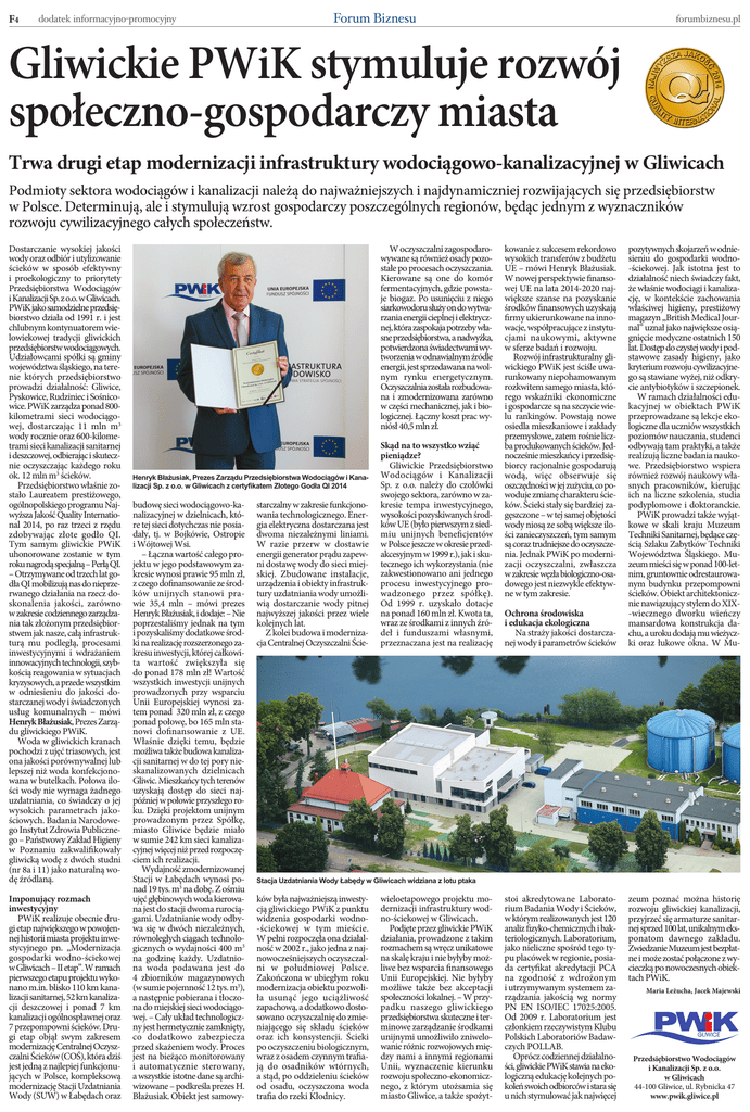 F4 dodatek informacyjno-promocyjny Forum Biznesu forumbiznesu.pl Gliwickie PWiK stymuluje rozwój społeczno-gospodarczy miasta Trwa drugi etap modernizacji infrastruktury wodociągowo-kanalizacyjnej w Gliwicach Podmioty sektora wodociągów i kanalizacji należą do najważniejszych i najdynamiczniej rozwijających się przedsiębiorstw w Polsce. Determinują, ale i stymulują wzrost gospodarczy poszczególnych regionów, będąc jednym z wyznaczników rozwoju cywilizacyjnego całych społeczeństw. Dostarczanie wysokiej jakości wody oraz odbiór i utylizowanie ścieków w sposób efektywny i proekologiczny to priorytety Przedsiębiorstwa Wodociągów iKanalizacjiSp. zo.o. wGliwicach. PWiK jako samodzielne przedsiębiorstwo działa od 1991 r. i jest chlubnym kontynuatorem wielowiekowej tradycji gliwickich przedsiębiorstw wodociągowych. Udziałowcami spółki są gminy województwa śląskiego, na terenie których przedsiębiorstwo prowadzi działalność: Gliwice, Pyskowice, Rudziniec i Sośnicowice. PWiK zarządza ponad 800kilometrami sieci wodociągowej, dostarczając 11 mln m3 wody rocznie oraz 600-kilometrami sieci kanalizacji sanitarnej i deszczowej, odbierając i skutecznie oczyszczając każdego roku ok. 12 mln m3 ścieków. Przedsiębiorstwo właśnie zostało Laureatem prestiżowego, ogólnopolskiego programu Najwyższa Jakość Quality International 2014, po raz trzeci z rzędu zdobywając złote godło QI. Tym samym gliwickie PWiK uhonorowane zostanie w tym roku nagrodą specjalną – Perłą QI. – Otrzymywane od trzech lat godła QI mobilizują nas do nieprzerwanego działania na rzecz doskonalenia jakości, zarówno w zakresie codziennego zarządzania tak złożonym przedsiębiorstwem jak nasze, całą infrastrukturą mu podległą, procesami inwestycyjnymi i wdrażaniem innowacyjnych technologii, szybkością reagowania w sytuacjach kryzysowych, a przede wszystkim w odniesieniu do jakości dostarczanej wody i świadczonych usług komunalnych – mówi Henryk Błażusiak, Prezes Zarządu gliwickiego PWiK. Woda w gliwickich kranach pochodzi z ujęć triasowych, jest ona jakości porównywalnej lub lepszej niż woda konfekcjonowana w butelkach. Połowa ilości wody nie wymaga żadnego uzdatniania, co świadczy o jej wysokich parametrach jakościowych. Badania Narodowego Instytut Zdrowia Publicznego – Państwowy Zakład Higieny w Poznaniu zakwalifikowały gliwicką wodę z dwóch studni (nr 8a i 11) jako naturalną wodę źródlaną. Imponujący rozmach inwestycyjny PWiK realizuje obecnie drugi etap największego w powojennej historii miasta projektu inwestycyjnego pn. „Modernizacja gospodarki wodno-ściekowej w Gliwicach – IIetap”. Wramach pierwszego etapu projektu wykonano m.in. blisko 110 km kanalizacji sanitarnej, 52 km kanalizacji deszczowej i ponad 7 km kanalizacji ogólnospławnej oraz 7 przepompowni ścieków. Drugi etap objął swym zakresem modernizację Centralnej Oczyszczalni Ścieków (COŚ), która dziś jest jedną z najlepiej funkcjonujących w Polsce, kompleksową modernizację Stacji Uzdatniania Wody (SUW) w Łabędach oraz W oczyszczalni zagospodarowywane są również osady pozostałe po procesach oczyszczania. Kierowane są one do komór fermentacyjnych, gdzie powstaje biogaz. Po usunięciu z niego siarkowodoru służy on dowytwarzania energii cieplnej ielektrycznej, która zaspokaja potrzeby własne przedsiębiorstwa, anadwyżka, potwierdzonaświadectwami wytworzenia wodnawialnym źródle energii, jest sprzedawananawolnym rynku energetycznym. Oczyszczalnia została rozbudowana i zmodernizowana zarówno w części mechanicznej, jak i biologicznej. Łączny koszt prac wyniósł 40,5 mln zł. HenrykBłażusiak,PrezesZarząduPrzedsiębiorstwaWodociągówi Kanalizacji Sp.zo.o.w GliwicachzcertyfikatemZłotegoGodłaQI2014 budowę sieci wodociągowo-kanalizacyjnej w dzielnicach, które tej sieci dotychczas nie posiadały, tj. w Bojkówie, Ostropie i Wójtowej Wsi. – Łączna wartość całego projektu w jego podstawowym zakresie wynosi prawie 95 mln zł, z czego dofinansowanie ze środków unijnych stanowi prawie 35,4 mln – mówi prezes Henryk Błażusiak, i dodaje: – Nie poprzestaliśmy jednak na tym i pozyskaliśmy dodatkowe środki na realizację rozszerzonego zakresu inwestycji, której całkowita wartość zwiększyła się do ponad 178 mln zł! Wartość wszystkich inwestycji unijnych prowadzonych przy wsparciu Unii Europejskiej wynosi zatem ponad 320 mln zł, z czego ponad połowę, bo 165 mln stanowi dofinansowanie z UE. Właśnie dzięki temu, będzie możliwa także budowa kanalizacji sanitarnej w do tej pory nieskanalizowanych dzielnicach Gliwic. Mieszkańcy tych terenów uzyskają dostęp do sieci najpóźniej w połowie przyszłego roku. Dzięki projektom unijnym prowadzonym przez Spółkę, miasto Gliwice będzie miało w sumie 242 km sieci kanalizacyjnej więcej niż przed rozpoczęciem ich realizacji. Wydajność zmodernizowanej Stacji w Łabędach wynosi ponad 19 tys. m3 na dobę. Z ośmiu ujęć głębinowych woda kierowana jest do stacji dwoma rurociągami. Uzdatnianie wody odbywa się w dwóch niezależnych, równoległych ciągach technologicznych o wydajności 400 m3 na godzinę każdy. Uzdatniona woda podawana jest do 4 zbiorników magazynowych (w sumie pojemność 12 tys. m3), a następnie pobierana i tłoczona do miejskiej sieci wodociągowej. – Cały układ technologiczny jest hermetycznie zamknięty, co dodatkowo zabezpiecza przed skażeniem wody. Proces jest na bieżąco monitorowany i automatycznie sterowany, a wszystkie istotne dane są archiwizowane – podkreśla prezes H. Błażusiak. Obiekt jest samowy- starczalny w zakresie funkcjonowania technologicznego. Energia elektryczna dostarczana jest dwoma niezależnymi liniami. W razie przerw w dostawie energii generator prądu zapewni dostawę wody do sieci miejskiej. Zbudowane instalacje, urządzenia i obiekty infrastruktury uzdatniania wody umożliwią dostarcz