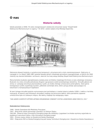 Zespół Szkół Elektryczno-Mechanicznych w Legnicy O nas Historia szkoły Szkoła powstała w 1946r. Po wielu reorganizacjach ostatecznie otrzymała nazwę "Zespół Szkół Elektryczno-Mechanicznych w Legnicy." W 1972r. szkole nadano imię Mikołaja Kopernika. Dekoracje elewacji budynku o symetrycznej kompozycji, utrzymana jest w stylu neorenesansowym. Dalej przy ul. Lampego nr 4 w latach 1865-1867 powstał okazały gmach miejskiego gimnazjum ewangelickiego, w którym do 1945 mieściły się również biblioteka i archiwum, obecnie ma tutaj swoją siedzibę Zespół Szkół Elektryczno-Mechanicznych. Monumentalna budowla zaprojektowana została przez architekta miejskiego Kirchnera w stylu włoskiego renesansu. Budynek ma cztery skrzydła jednakowej długości zgrupowane wokół prostokątnego dziedzińca. Skrzydło główne od strony ul. Lampego akcentuje pięcioosobowy ryzalit, po środku którego umieszczono portal główny. Dwie górne kondygnacje ryzalitu wypełniają wysokie ,półkoliste zamknięte okna ,które ujmują arkady spoczywające na kolumnach o kompozytowych kapitelach. W sieni tylnego skrzydła budynku wymurowana jest pochodząca z czasów księcia Ludwika (1658 r.) tablica z łacińską inskrypcją. W piwnicy pod frontowym skrzydłem znajduje się porzucona tablica, która pierwotnie zapewne umieszczona była na czołowym miejscu. Na tablicy znajduje się następujący napis: "HAS AEDES IUVENTUTI OPTIMIS ARTIBUS ERUNDIEDAE CONDIDIT CIVITAS LIGNICENSIS ANNO MDCCCL XVII." Kalendarium historyczne 1946 - Szkoła Zawodowa dla Młodzieży Pracującej 1947 - Wręczenie szkole pierwszego sztandaru na Dolnym Śląsku 1947/48 - Otwarcie klasy Gimnazjum Energetycznego dla młodzieży z Jugosławii (w drodze wymiany wyjechała na podobnych warunkach jedna z klas Gimnazjum Energetycznego) 1951 - Zmiana nazwy szkoły na Zasadniczą Szkołę Zawodową 1952 - Połączenie ZSZ ze Szkołą Energetyczną pod nazwą Technikum Energetyczne i Zasadnicza Szkoła Zawodowa w 1 Zespół Szkół Elektryczno-Mechanicznych w Legnicy budynku przy ul. Lampego 4 1957 - Powstanie Technikum Energetycznego dla Pracujących 1972 - I zjazd absolwentów połączony z nadaniem szkole imienia Mikołaja Kopernika oraz wręczenie szkole nowego sztandaru 1974 - Otwarcie nowych Warsztatów Szkolnych przy ul. Grunwaldzkiej 1978 - Zainstalowanie szkolnej telewizji obwodowej 1985 - Otwarcie pracowni komputerowej 1994 - Otwarcie sali sportowej - siłowni 1997 - Przekształcenie Warsztatów Szkolnych w Centrum Kształcenia Praktycznego 2000 - Powstanie Europejskiego Muzeum Pieniądza 2001 - Powołanie zespołu redakcyjnego szkolnej gazetki "Schola Nostra" 2002 - Otwarcie zaplecza sanitarnego przy sali gimnastycznej Nawiązanie współpracy ze Szkołą Zawodową w Wuppertalu Wprowadzenie do technikum biologii i otwarcie sali do jej nauki 2003 - Powstanie 4 letniego Technikum Elektrycznego 4 letniego Technikum Elektronicznego i Technikum Uzupełniające, otwarcie nowoczesnej siłowni szkolnej 2004 - Otwarcie czytelni multimedialnej, generalny remont i oddanie do użytku małej sali gimnastycznej, okablowanie budynku instalacją teleinformatyczną i zasilającą 2