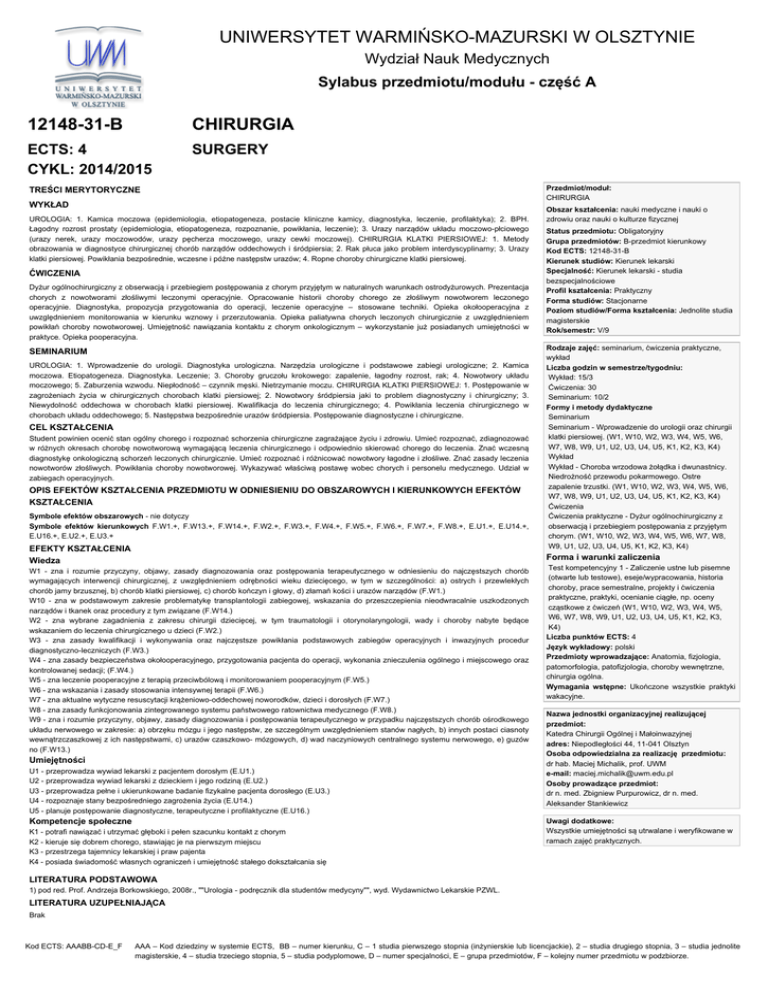 UNIWERSYTET WARMIŃSKO-MAZURSKI W OLSZTYNIE Wydział Nauk Medycznych Sylabus przedmiotu/modułu - część A 12148-31-B CHIRURGIA ECTS: 4 CYKL: 2014/2015 SURGERY TREŚCI MERYTORYCZNE WYKŁAD UROLOGIA: 1. Kamica moczowa (epidemiologia, etiopatogeneza, postacie kliniczne kamicy, diagnostyka, leczenie, profilaktyka); 2. BPH. Łagodny rozrost prostaty (epidemiologia, etiopatogeneza, rozpoznanie, powikłania, leczenie); 3. Urazy narządów układu moczowo-płciowego (urazy nerek, urazy moczowodów, urazy pęcherza moczowego, urazy cewki moczowej). CHIRURGIA KLATKI PIERSIOWEJ: 1. Metody obrazowania w diagnostyce chirurgicznej chorób narządów oddechowych i śródpiersia; 2. Rak płuca jako problem interdyscyplinarny; 3. Urazy klatki piersiowej. Powikłania bezpośrednie, wczesne i późne następstw urazów; 4. Ropne choroby chirurgiczne klatki piersiowej. ĆWICZENIA Dyżur ogólnochirurgiczny z obserwacją i przebiegiem postępowania z chorym przyjętym w naturalnych warunkach ostrodyżurowych. Prezentacja chorych z nowotworami złośliwymi leczonymi operacyjnie. Opracowanie historii choroby chorego ze złośliwym nowotworem leczonego operacyjnie. Diagnostyka, propozycja przygotowania do operacji, leczenie operacyjne – stosowane techniki. Opieka okołooperacyjna z uwzględnieniem monitorowania w kierunku wznowy i przerzutowania. Opieka paliatywna chorych leczonych chirurgicznie z uwzględnieniem powikłań choroby nowotworowej. Umiejętność nawiązania kontaktu z chorym onkologicznym – wykorzystanie już posiadanych umiejętności w praktyce. Opieka pooperacyjna. SEMINARIUM UROLOGIA: 1. Wprowadzenie do urologii. Diagnostyka urologiczna. Narzędzia urologiczne i podstawowe zabiegi urologiczne; 2. Kamica moczowa. Etiopatogeneza. Diagnostyka. Leczenie; 3. Choroby gruczołu krokowego: zapalenie, łagodny rozrost, rak; 4. Nowotwory układu moczowego; 5. Zaburzenia wzwodu. Niepłodność – czynnik męski. Nietrzymanie moczu. CHIRURGIA KLATKI PIERSIOWEJ: 1. Postępowanie w zagrożeniach życia w chirurgicznych chorobach klatki piersiowej; 2. Nowotwory śródpiersia jaki to problem diagnostyczny i chirurgiczny; 3. Niewydolność oddechowa w chorobach klatki piersiowej. Kwalifikacja do leczenia chirurgicznego; 4. Powikłania leczenia chirurgicznego w chorobach układu oddechowego; 5. Następstwa bezpośrednie urazów śródpiersia. Postępowanie diagnostyczne i chirurgiczne. CEL KSZTAŁCENIA Student powinien ocenić stan ogólny chorego i rozpoznać schorzenia chirurgiczne zagrażające życiu i zdrowiu. Umieć rozpoznać, zdiagnozować w różnych okresach chorobę nowotworową wymagającą leczenia chirurgicznego i odpowiednio skierować chorego do leczenia. Znać wczesną diagnostykę onkologiczną schorzeń leczonych chirurgicznie. Umieć rozpoznać i różnicować nowotwory łagodne i złośliwe. Znać zasady leczenia nowotworów złośliwych. Powikłania choroby nowotworowej. Wykazywać właściwą postawę wobec chorych i personelu medycznego. Udział w zabiegach operacyjnych. OPIS EFEKTÓW KSZTAŁCENIA PRZEDMIOTU W ODNIESIENIU DO OBSZAROWYCH I KIERUNKOWYCH EFEKTÓW KSZTAŁCENIA Symbole efektów obszarowych - nie dotyczy Symbole efektów kierunkowych F.W1.+, F.W13.+, F.W14.+, F.W2.+, F.W3.+, F.W4.+, F.W5.+, F.W6.+, F.W7.+, F.W8.+, E.U1.+, E.U14.+, E.U16.+, E.U2.+, E.U3.+ EFEKTY KSZTAŁCENIA Wiedza Przedmiot/moduł: CHIRURGIA Obszar kształcenia: nauki medyczne i nauki o zdrowiu oraz nauki o kulturze fizycznej Status przedmiotu: Obligatoryjny Grupa przedmiotów: B-przedmiot kierunkowy Kod ECTS: 12148-31-B Kierunek studiów: Kierunek lekarski Specjalność: Kierunek lekarski - studia bezspecjalnościowe Profil kształcenia: Praktyczny Forma studiów: Stacjonarne Poziom studiów/Forma kształcenia: Jednolite studia magisterskie Rok/semestr: V/9 Rodzaje zajęć: seminarium, ćwiczenia praktyczne, wykład Liczba godzin w semestrze/tygodniu: Wykład: 15/3 Ćwiczenia: 30 Seminarium: 10/2 Formy i metody dydaktyczne Seminarium Seminarium - Wprowadzenie do urologii oraz chirurgii klatki piersiowej. (W1, W10, W2, W3, W4, W5, W6, W7, W8, W9, U1, U2, U3, U4, U5, K1, K2, K3, K4) Wykład Wykład - Choroba wrzodowa żołądka i dwunastnicy. Niedrożność przewodu pokarmowego. Ostre zapalenie trzustki. (W1, W10, W2, W3, W4, W5, W6, W7, W8, W9, U1, U2, U3, U4, U5, K1, K2, K3, K4) Ćwiczenia Ćwiczenia praktyczne - Dyżur ogólnochirurgiczny z obserwacją i przebiegiem postępowania z przyjętym chorym. (W1, W10, W2, W3, W4, W5, W6, W7, W8, W9, U1, U2, U3, U4, U5, K1, K2, K3, K4) Forma i warunki zaliczenia W1 - zna i rozumie przyczyny, objawy, zasady diagnozowania oraz postępowania terapeutycznego w odniesieniu do najczęstszych chorób wymagających interwencji chirurgicznej, z uwzględnieniem odrębności wieku dziecięcego, w tym w szczególności: a) ostrych i przewlekłych chorób jamy brzusznej, b) chorób klatki piersiowej, c) chorób kończyn i głowy, d) złamań kości i urazów narządów (F.W1.) W10 - zna w podstawowym zakresie problematykę transplantologii zabiegowej, wskazania do przeszczepienia nieodwracalnie uszkodzonych narządów i tkanek oraz procedury z tym związane (F.W14.) W2 - zna wybrane zagadnienia z zakresu chirurgii dziecięcej, w tym traumatologii i otorynolaryngologii, wady i choroby nabyte będące wskazaniem do leczenia chirurgicznego u dzieci (F.W2.) W3 - zna zasady kwalifikacji i wykonywania oraz najczęstsze powikłania podstawowych zabiegów operacyjnych i inwazyjnych procedur diagnostyczno-leczniczych (F.W3.) W4 - zna zasady bezpieczeństwa okołooperacyjnego, przygotowania pacjenta do operacji, wykonania znieczulenia ogólnego i miejscowego oraz kontrolowanej sedacji; (F.W4.) W5 - zna leczenie pooperacyjne z terapią przeciwbólową i monitorowaniem pooperacyjnym (F.W5.) W6 - zna wskazania i zasady stosowania intensywnej terapii (F.W6.) W7 - zna aktualne wytyczne resuscytacji krążeniowo-oddechowej noworodków, dzieci i dorosłych (F.W7.) W8 - zna zasady funkcjo