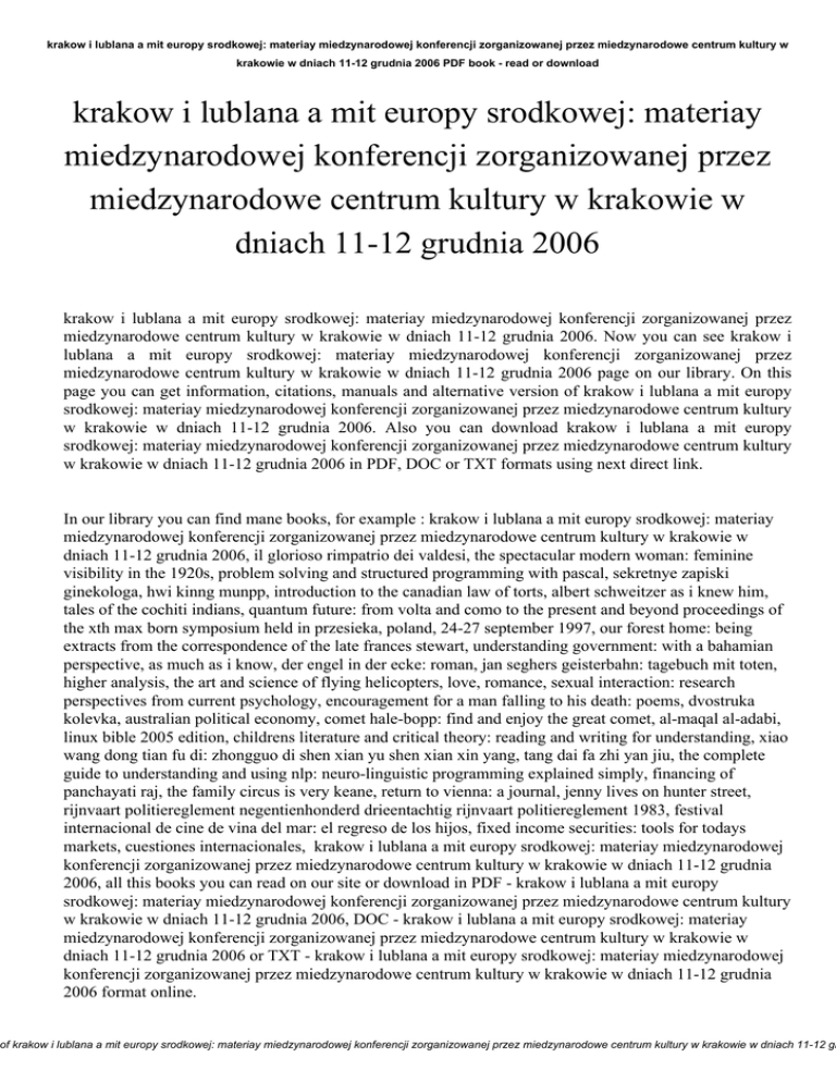 krakow i lublana a mit europy srodkowej: materiay miedzynarodowej konferencji zorganizowanej przez miedzynarodowe centrum kultury w krakowie w dniach 11-12 grudnia 2006 PDF book - read or download krakow i lublana a mit europy srodkowej: materiay miedzynarodowej konferencji zorganizowanej przez miedzynarodowe centrum kultury w krakowie w dniach 11-12 grudnia 2006 krakow i lublana a mit europy srodkowej: materiay miedzynarodowej konferencji zorganizowanej przez miedzynarodowe centrum kultury w krakowie w dniach 11-12 grudnia 2006. Now you can see krakow i lublana a mit europy srodkowej: materiay miedzynarodowej konferencji zorganizowanej przez miedzynarodowe centrum kultury w krakowie w dniach 11-12 grudnia 2006 page on our library. On this page you can get information, citations, manuals and alternative version of krakow i lublana a mit europy srodkowej: materiay miedzynarodowej konferencji zorganizowanej przez miedzynarodowe centrum kultury w krakowie w dniach 11-12 grudnia 2006. Also you can download krakow i lublana a mit europy srodkowej: materiay miedzynarodowej konferencji zorganizowanej przez miedzynarodowe centrum kultury w krakowie w dniach 11-12 grudnia 2006 in PDF, DOC or TXT formats using next direct link. In our library you can find mane books, for example : krakow i lublana a mit europy srodkowej: materiay miedzynarodowej konferencji zorganizowanej przez miedzynarodowe centrum kultury w krakowie w dniach 11-12 grudnia 2006, il glorioso rimpatrio dei valdesi, the spectacular modern woman: feminine visibility in the 1920s, problem solving and structured programming with pascal, sekretnye zapiski ginekologa, hwi kinng munpp, introduction to the canadian law of torts, albert schweitzer as i knew him, tales of the cochiti indians, quantum future: from volta and como to the present and beyond proceedings of the xth max born symposium held in przesieka, poland, 24-27 september 1997, our forest home: being extracts from the correspondence of the late frances stewart, understanding government: with a bahamian perspective, as much as i know, der engel in der ecke: roman, jan seghers geisterbahn: tagebuch mit toten, higher analysis, the art and science of flying helicopters, love, romance, sexual interaction: research perspectives from current psychology, encouragement for a man falling to his death: poems, dvostruka kolevka, australian political economy, comet hale-bopp: find and enjoy the great comet, al-maqal al-adabi, linux bible 2005 edition, childrens literature and critical theory: reading and writing for understanding, xiao wang dong tian fu di: zhongguo di shen xian yu shen xian xin yang, tang dai fa zhi yan jiu, the complete guide to understanding and using nlp: neuro-linguistic programming explained simply, financing of panchayati raj, the family circus is very keane, return to vienna: a journal, jenny lives on hunter street, rijnvaart politiereglement negentienhonderd drieentachtig rijnvaart politiereglement 1983, festival internacional de cine de vina del mar: el regreso de los hijos, fixed income securities: tools for todays markets, cuestiones internacionales, krakow i lublana a mit europy srodkowej: materiay miedzynarodowej konferencji zorganizowanej przez miedzynarodowe centrum kultury w krakowie w dniach 11-12 grudnia 2006, all this books you can read on our site or download in PDF - krakow i lublana a mit europy srodkowej: materiay miedzynarodowej konferencji zorganizowanej przez miedzynarodowe centrum kultury w krakowie w dniach 11-12 grudnia 2006, DOC - krakow i lublana a mit europy srodkowej: materiay miedzynarodowej konferencji zorganizowanej przez miedzynarodowe centrum kultury w krakowie w dniach 11-12 grudnia 2006 or TXT - krakow i lublana a mit europy srodkowej: materiay miedzynarodowej konferencji zorganizowanej przez miedzynarodowe centrum kultury w krakowie w dniach 11-12 grudnia 2006 format online. of krakow i lublana a mit europy srodkowej: materiay miedzynarodowej konferencji zorganizowanej przez miedzynarodowe centrum kultury w krakowie w dniach 11-12 gr krakow i lublana a mit europy srodkowej: materiay miedzynarodowej konferencji zorganizowanej przez miedzynarodowe centrum kultury w krakowie w dniach 11-12 grudnia 2006 PDF book - read or download Our collection provide simple ways so that you can find a krakow i lublana a mit europy srodkowej: materiay miedzynarodowej konferencji zorganizowanej przez miedzynarodowe centrum kultury w krakowie w dniach 11-12 grudnia 2006 PDF record digging. And by having our ebooks online or by saving it , you have convenient answers with krakow i lublana a mit europy srodkowej: materiay miedzynarodowej konferencji zorganizowanej przez miedzynarodowe centrum kultury w krakowie w dniach 11-12 grudnia 2006. To begin with finding krakow i lublana a mit europy srodkowej: materiay miedzynarodowej konferencji zorganizowanej przez miedzynarodowe centrum kultury w krakowie w dniach 11-12 grudnia 2006, you are to find our website that includes a comprehensive assortment of krakow i lublana a mit europy srodkowej: materiay miedzynarodowej konferencji zorganizowanej przez miedzynarodowe centrum kultury w krakowie w dniach 11-12 grudnia 2006 manuals listed. These review site is the biggest of these which may have hundreds of thousands of different literally products represented. You'll also see that there are specific sites catered to different product types or categories, brands or niches related with krakow i lublana a mit europy srodkowej: materiay miedzynarodowej konferencji zorganizowanej przez miedzynarodowe centrum kultury w krakowie w dniach 11-12 grudnia 2006. So depending on just what you are searching, you'll be able to choose ebooks krakow i lublana a mit europy srodkowej: materiay miedzynarodowej konferencji zorganizowanej przez miedzynarodowe centrum kultury w krakowie w dniach 11-12 grudnia 2006 to suit your own needs, krakow i lublana a mit europy srodkowej: materiay miedzynarodowej konferencji zorganizowanej przez